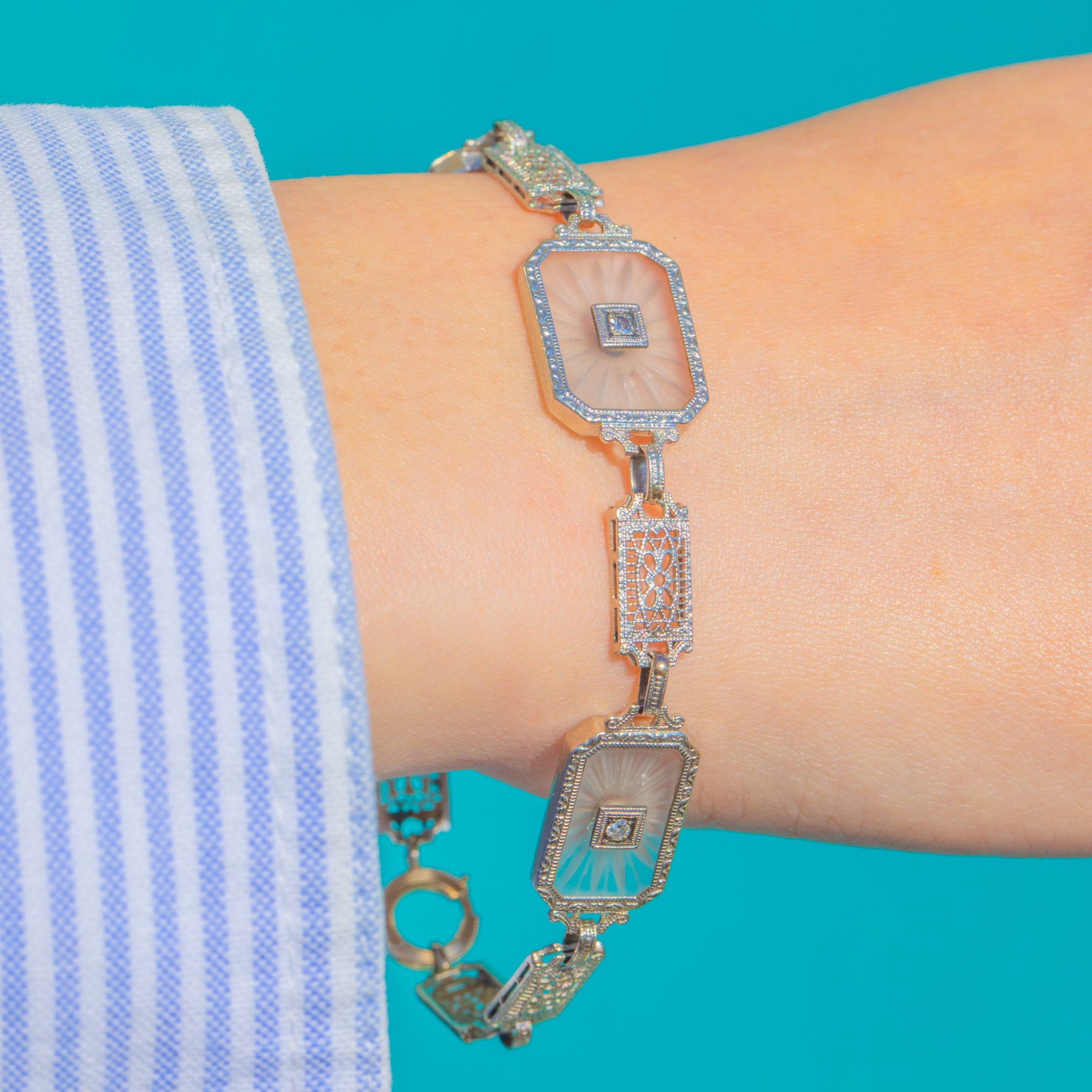 An exquisite Art Deco bracelet in 14ct White Gold, composed of articulated panels of frosted Camphor Glass finely carved with radiant sunburst motifs. Each tablet is crowned with a tiny Diamond in a millegrain collet, while openwork filigree connectors and delicate pavé accents lend a lace-like lightness and beautiful movement on the wrist.