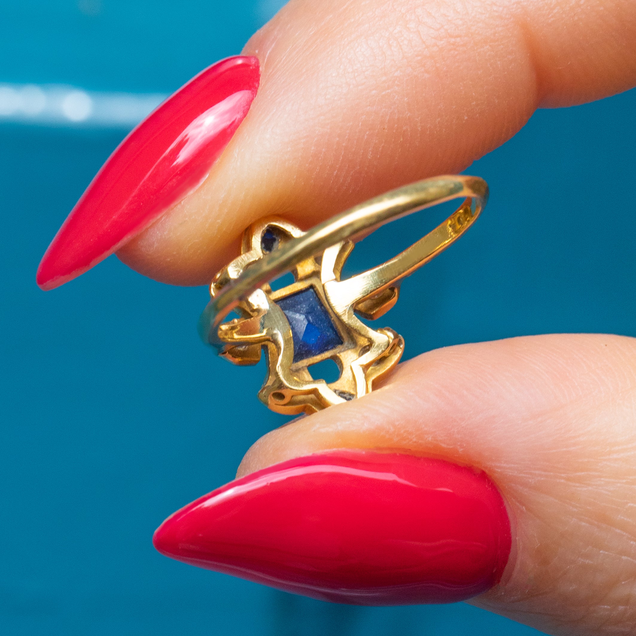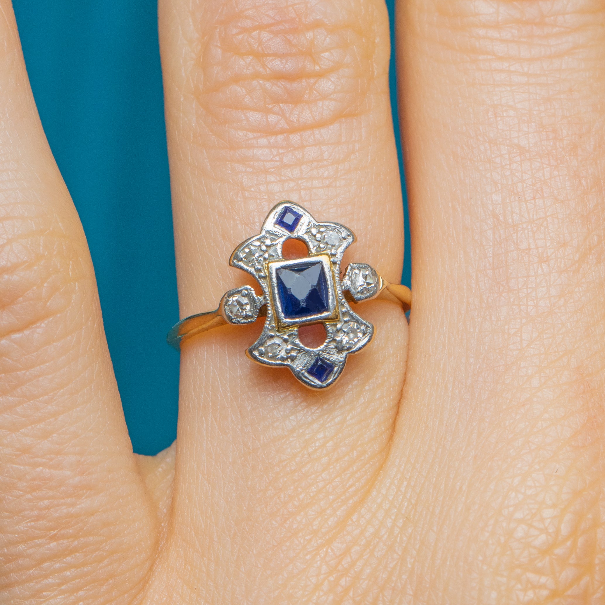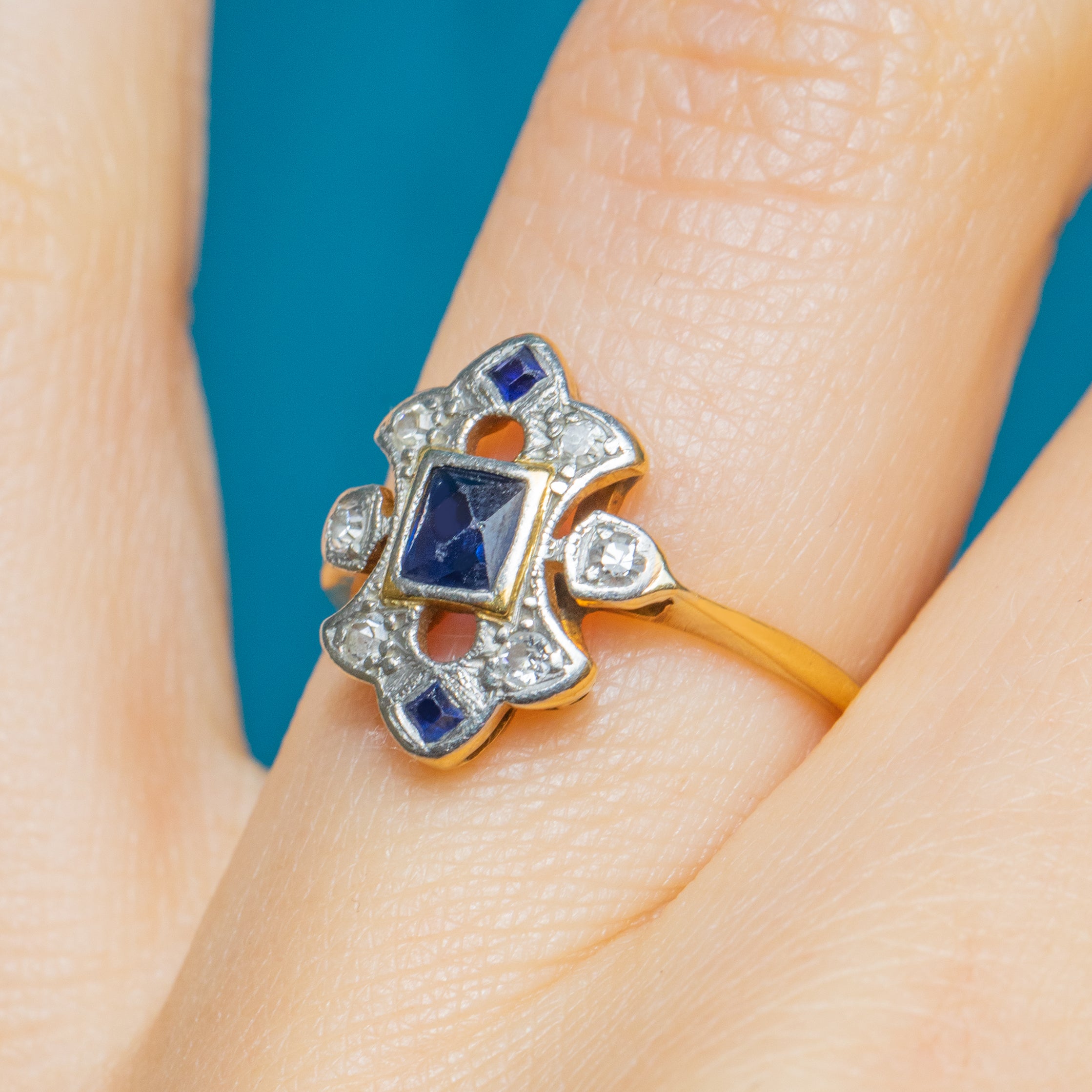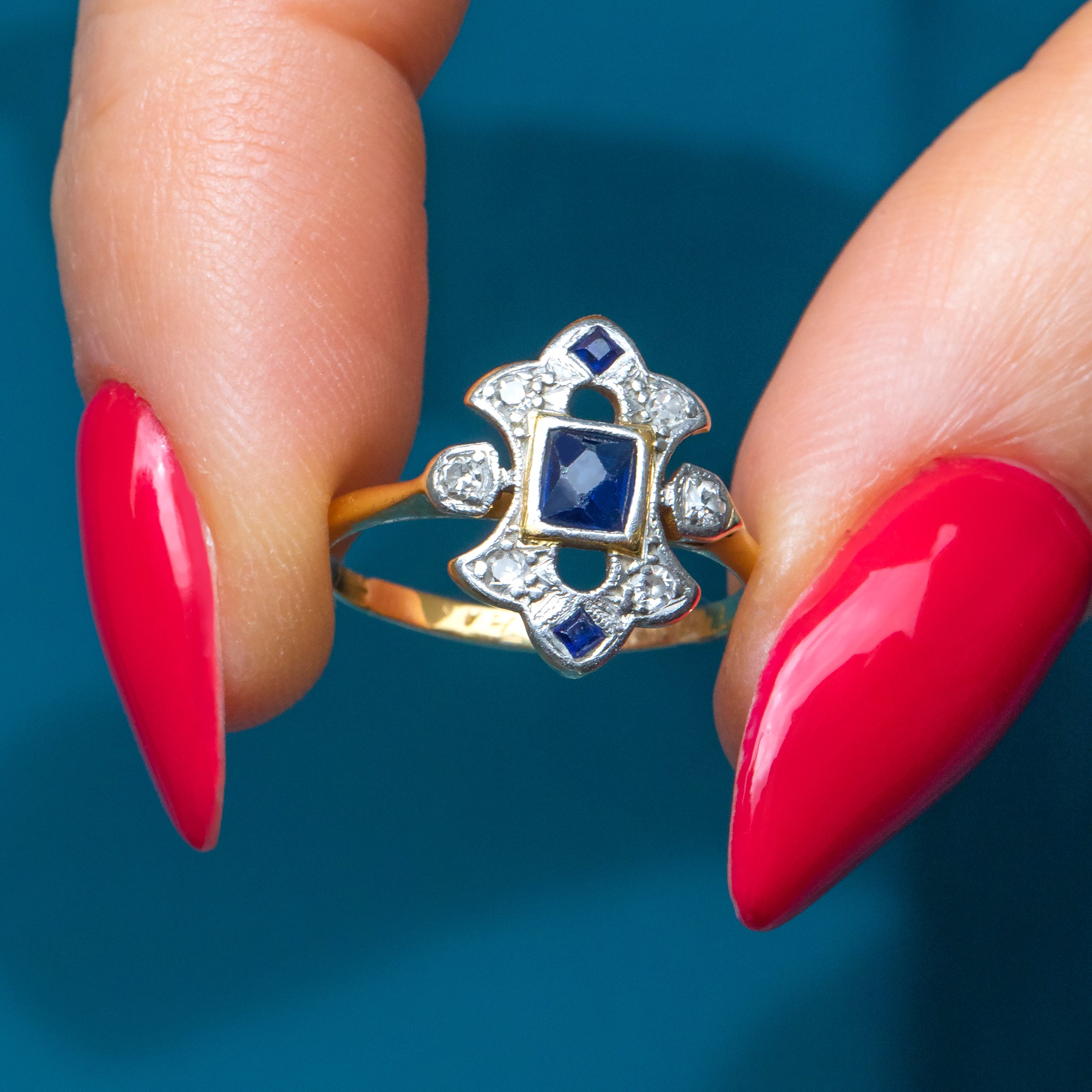 The form of this Sapphire Diamond ring accentuates your hand, and if you are looking for something a little different she would make an exceptional engagement ring choice! With a sleek Gold band that hugs your finger in all the right places, the moment you make this Art Deco ring yours you will wonder how you ever went without!