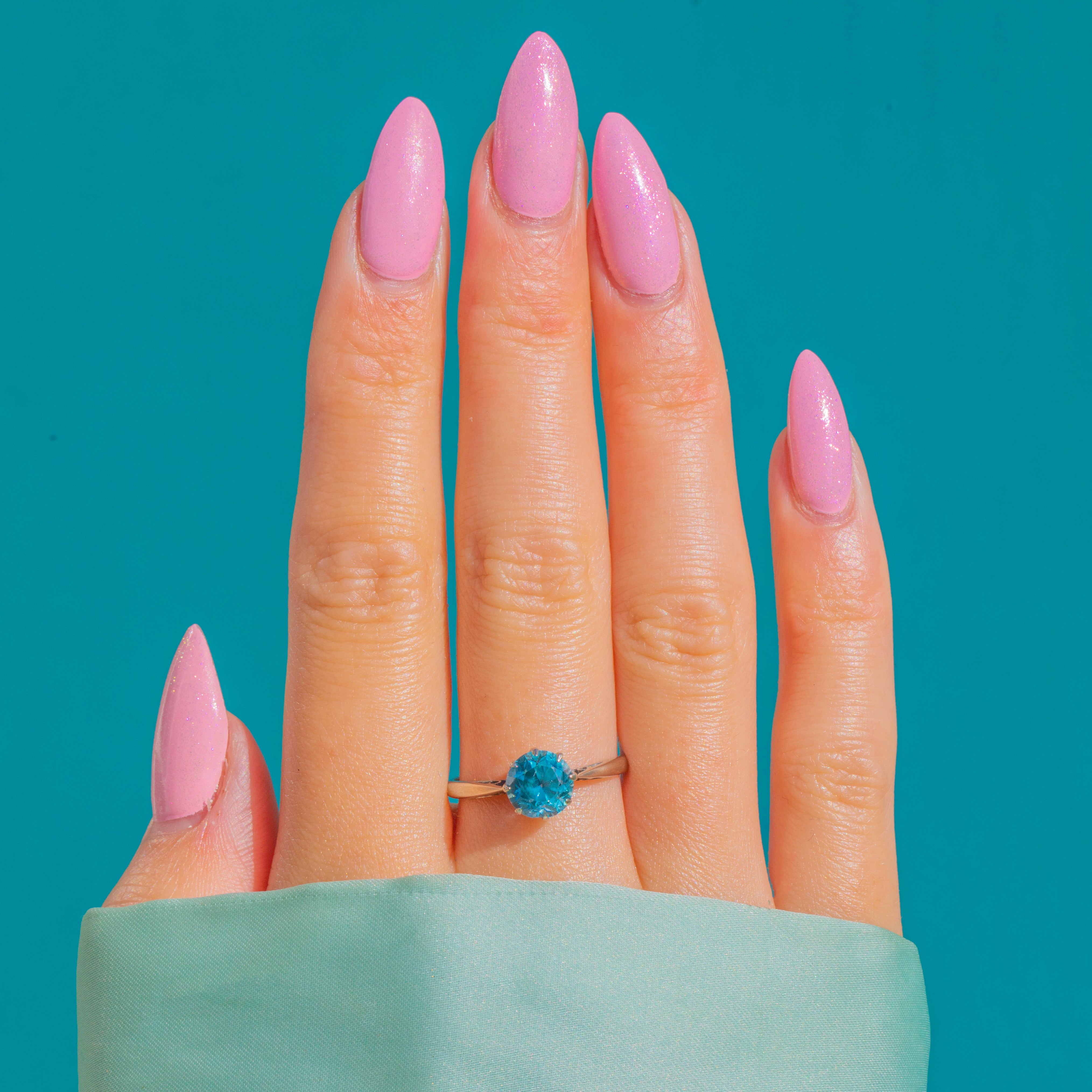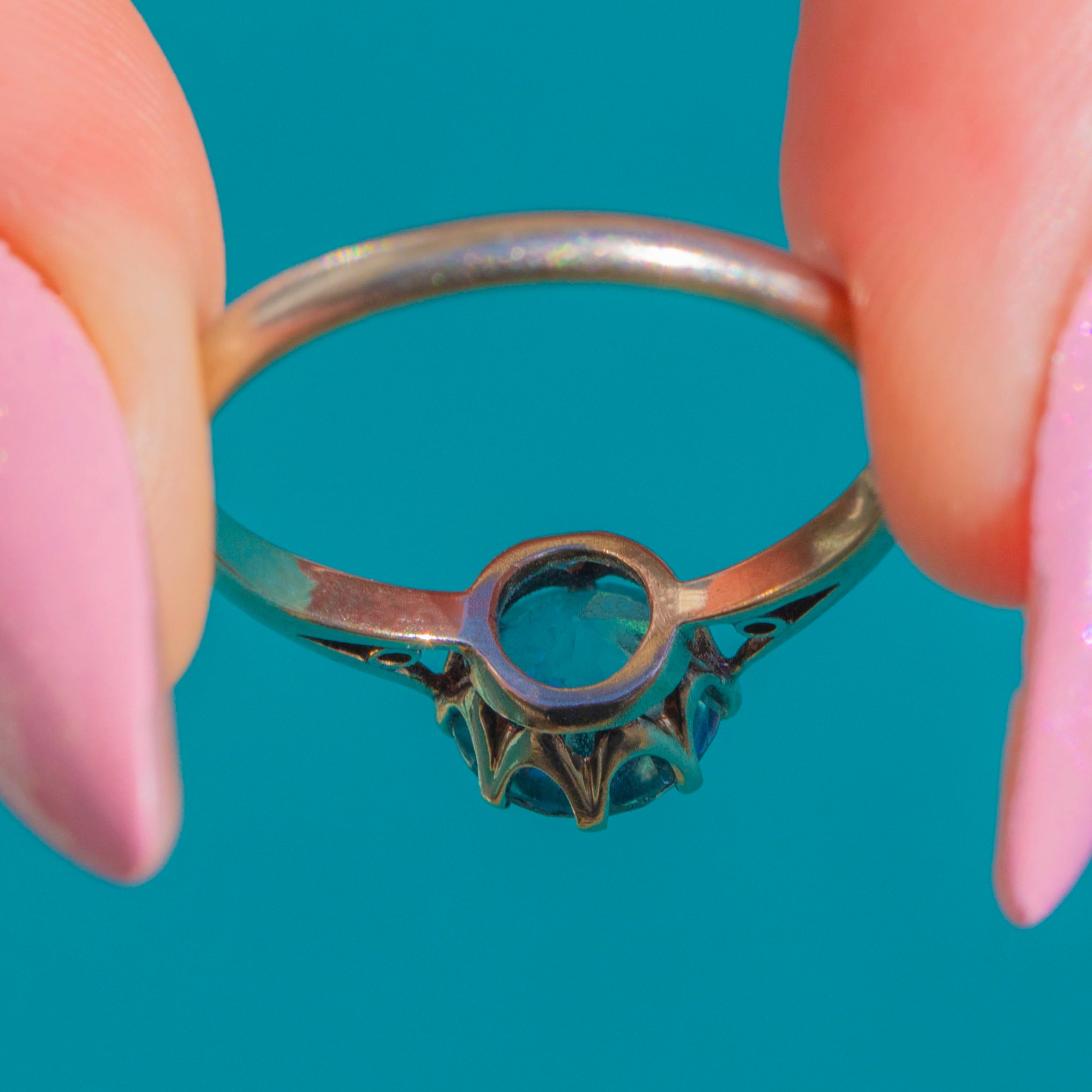 EXCELLENT: The Blue Zircon is bright and lively with only a couple of tiny facet nicks visible under magnification, and no eye-visible chips. The multi‑claw basket and slim shank are secure with light surface scratches from gentle wear. No visible resizing or restoration, and the claws hold the stone securely.