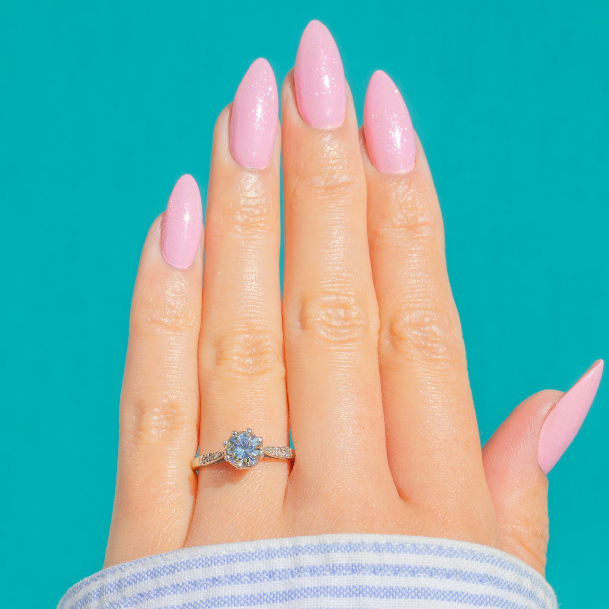 The Diamond is elevated in a refined scalloped crown with a delicately pierced gallery and tapered shoulders, creating a light, graceful silhouette on the hand. Beautifully executed in cool, enduring Platinum, it’s a timeless classic with unmistakable Deco poise.