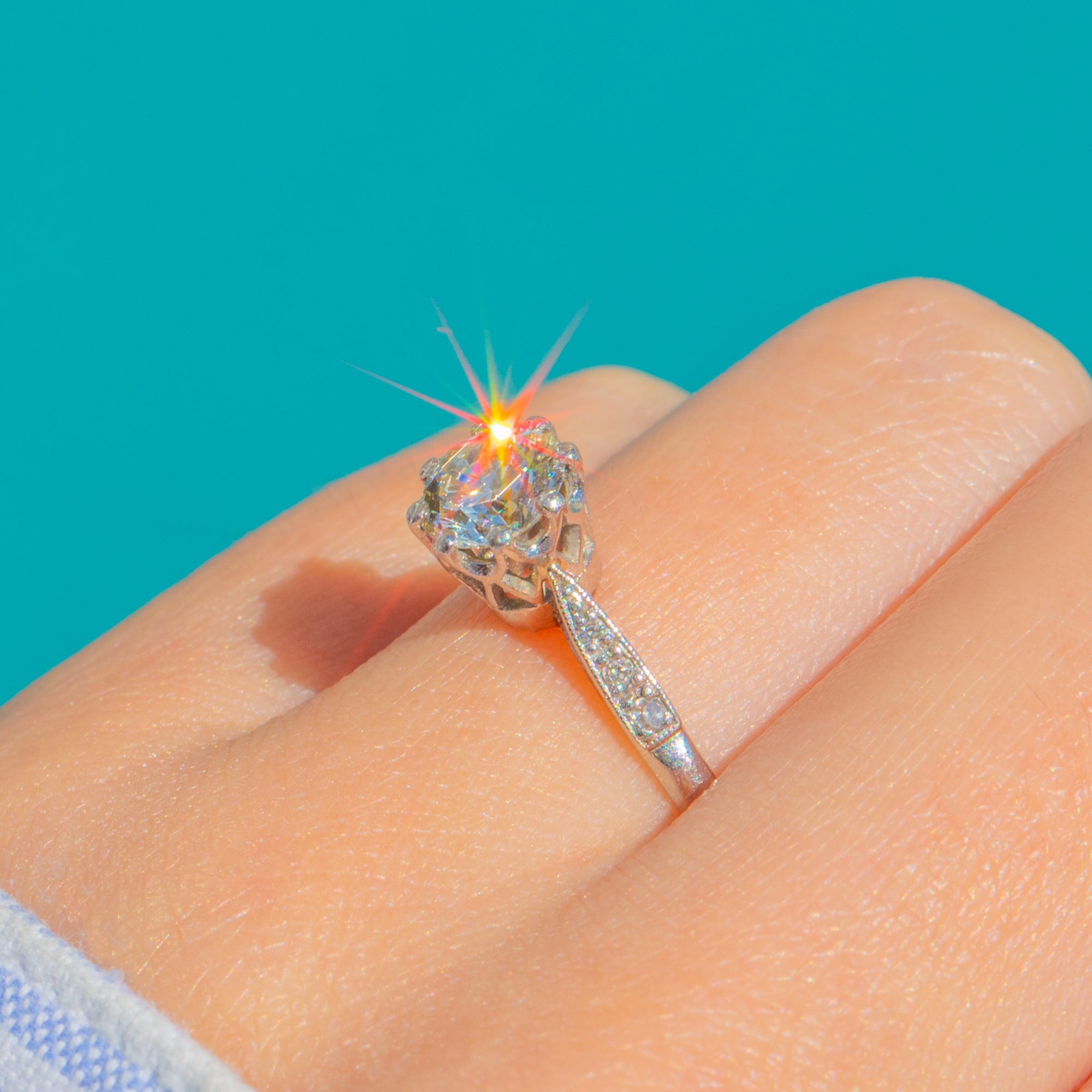 A luminous Art Deco solitaire, this Platinum ring showcases a captivating 0.75ct Old European Cut Diamond. Brimming with period charm, the stone’s broad facets deliver gorgeous fire and scintillation, with an elegant near‑colourless H–I hue and VS clarity for crisp, bright brilliance.