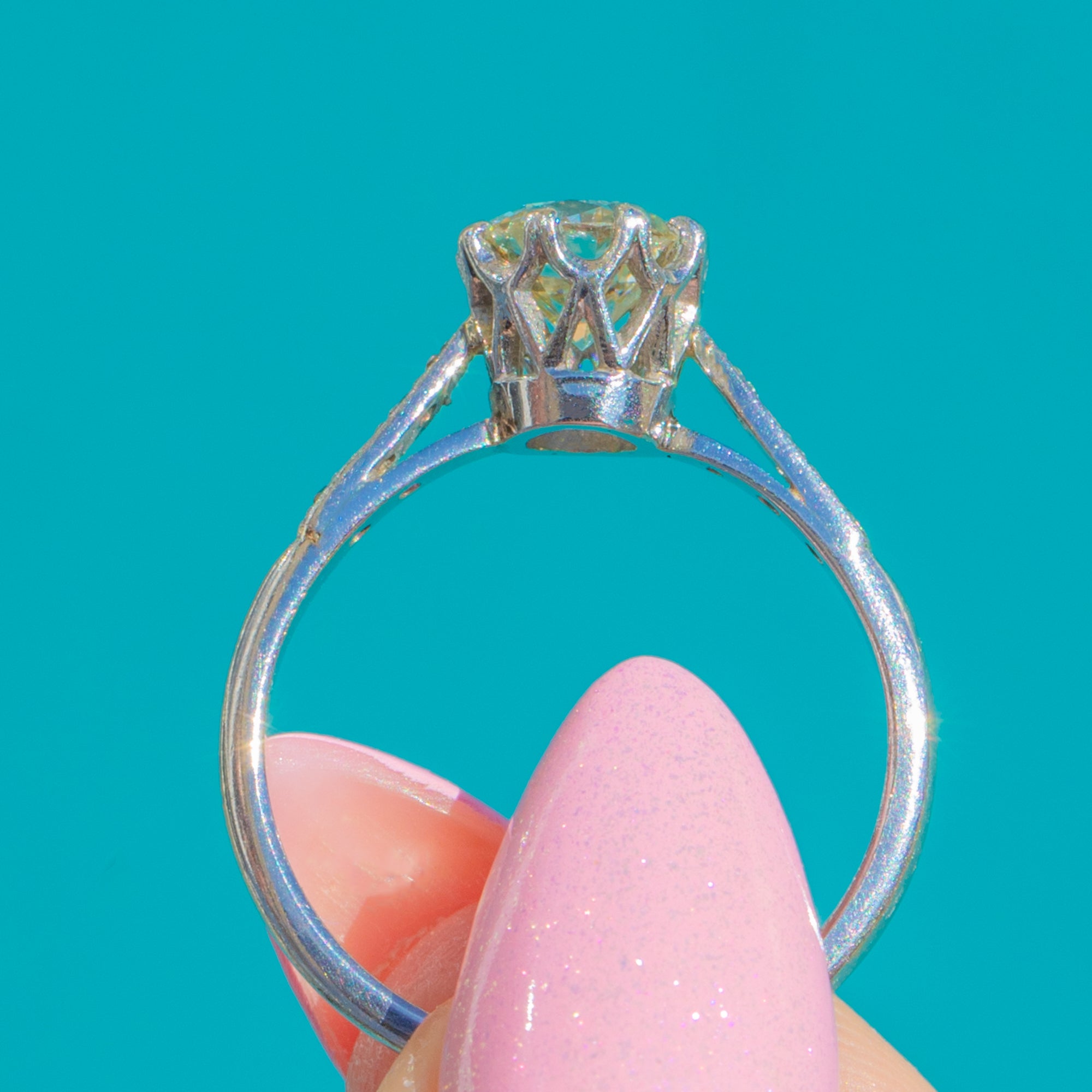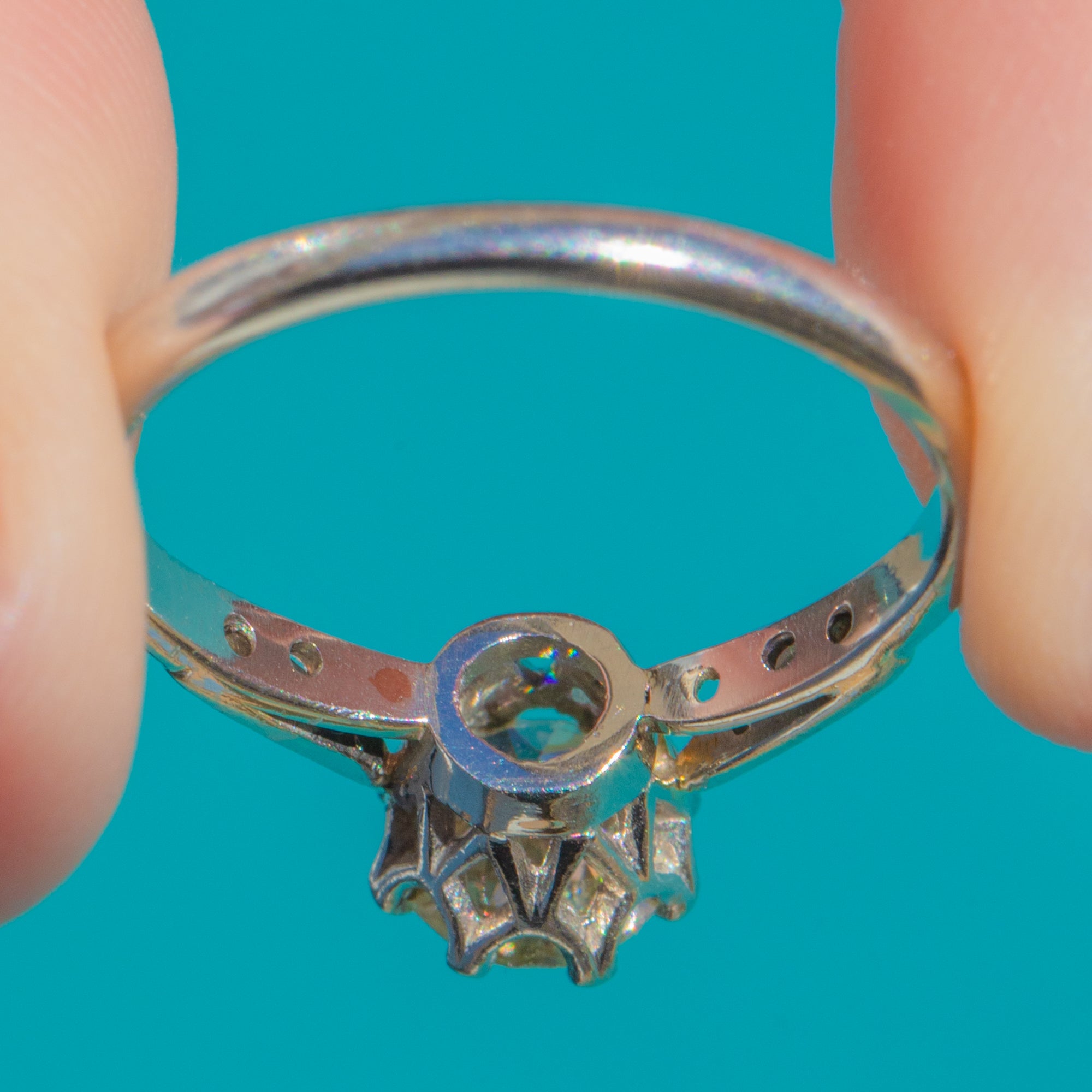 EXCELLENT: The Diamond is bright with crisp facet junctions and no notable chips or abrasions seen under magnification. The Platinum setting and prongs are secure with minimal surface wear commensurate with age; the band remains slender and even. A small, discreet solder mark is present to the inner shoulder, not affecting durability or wear.