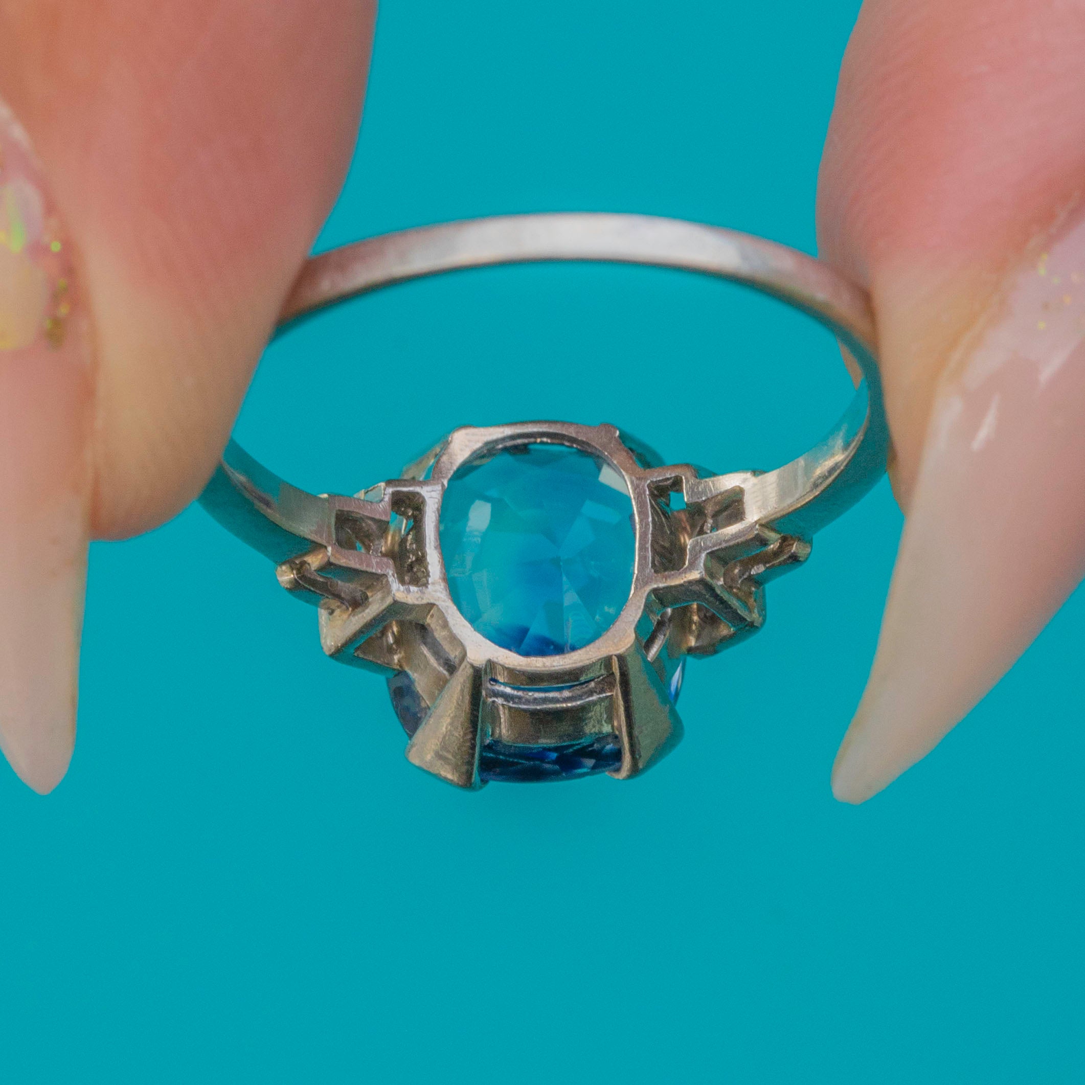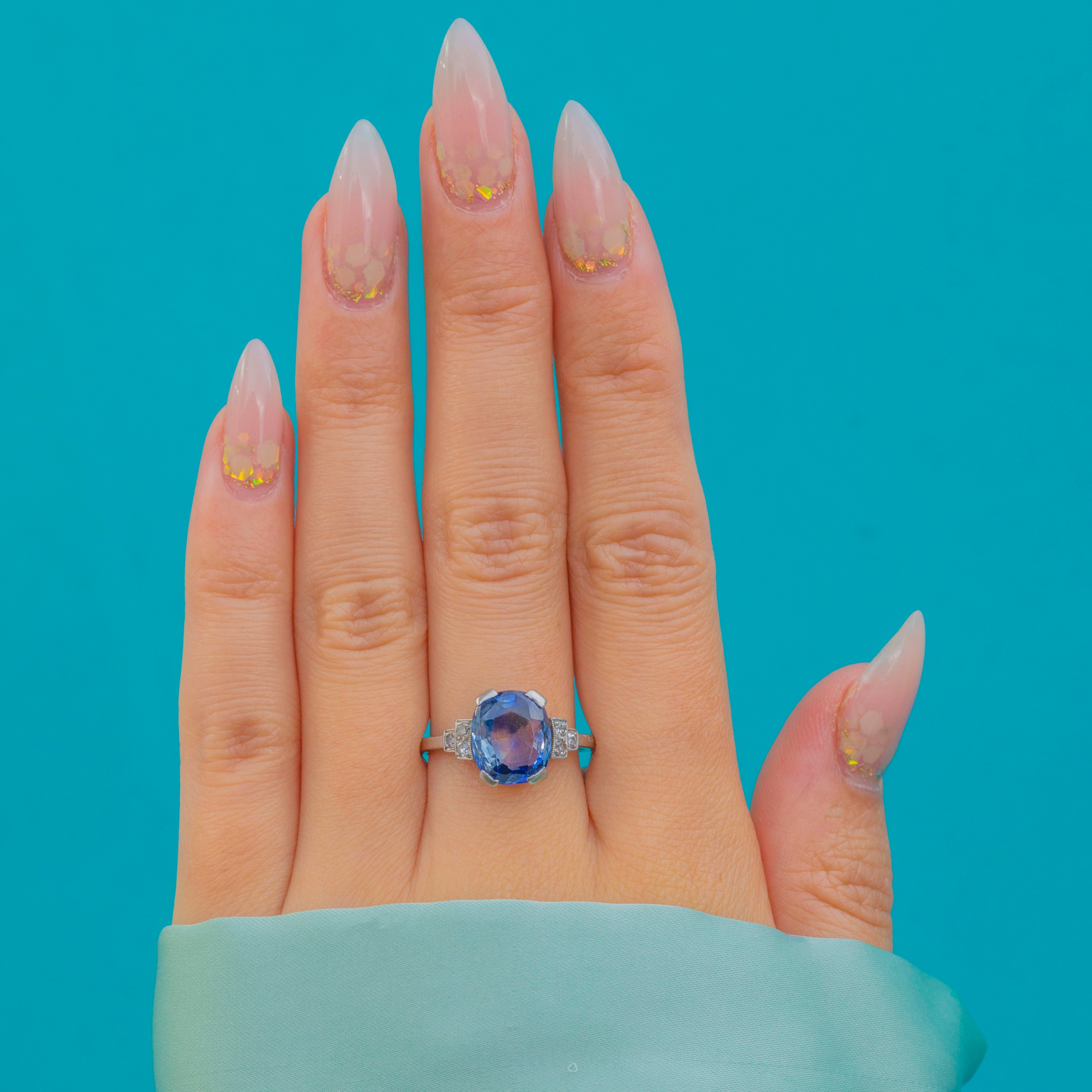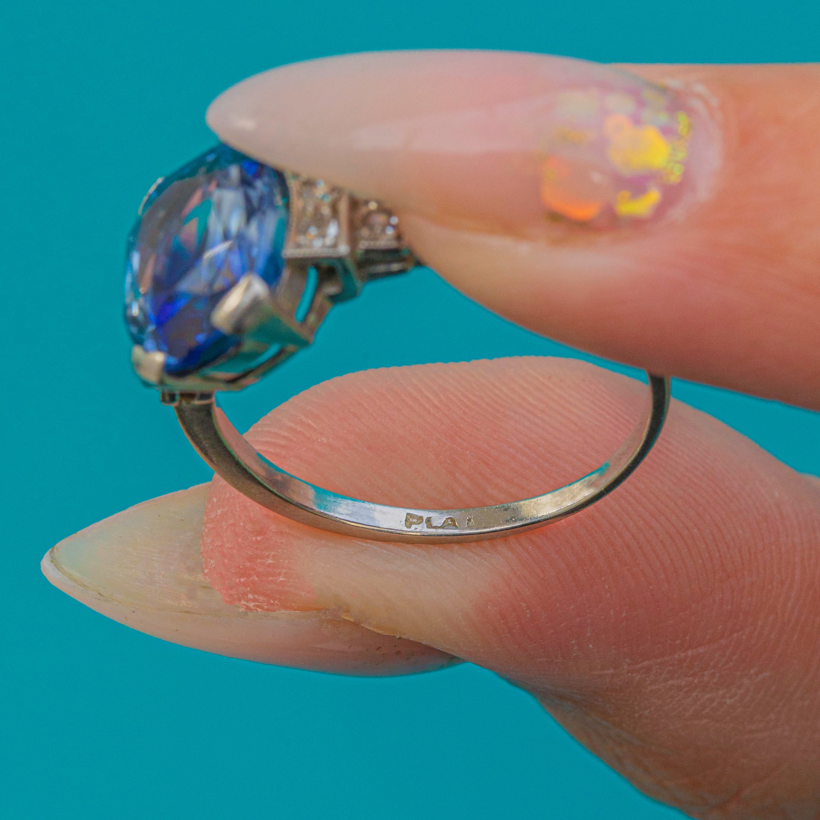 A striking Art Deco ring set in luxurious Platinum, starring a vivid blue natural Sapphire with beautiful, prominent colour zoning—so characteristic of fine natural stones. Framed by sparkling Diamond accents and elegant geometric shoulders, it’s a classic 1920s silhouette with wonderful presence on the hand.