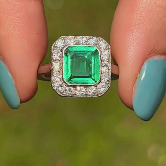 We are in awe of this certified Art Deco Platinum Colombian Emerald Diamond cluster ring! In true Art Deco style, this solid 1920's Platinum ring is sleek, symmetrical and has timeless appeal.