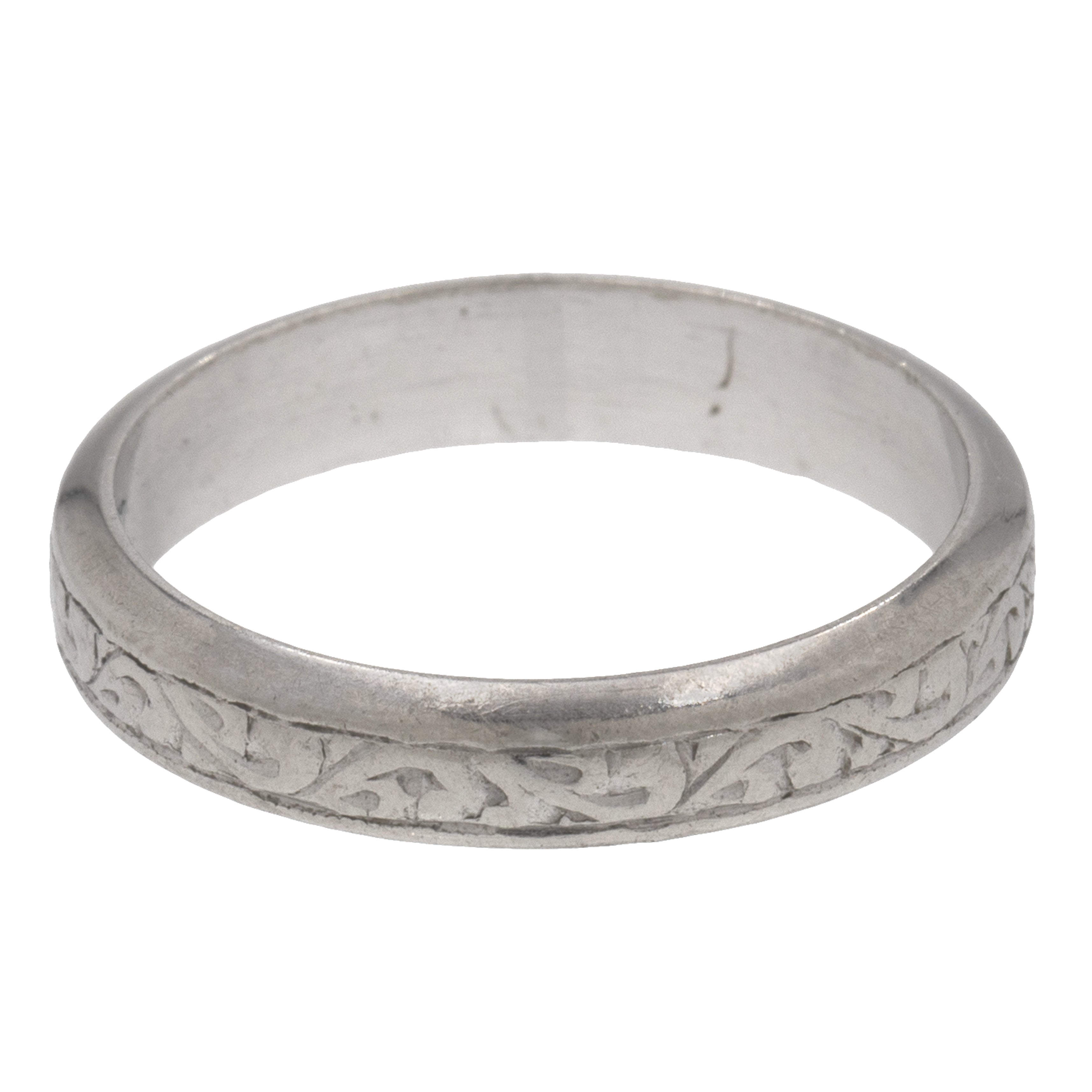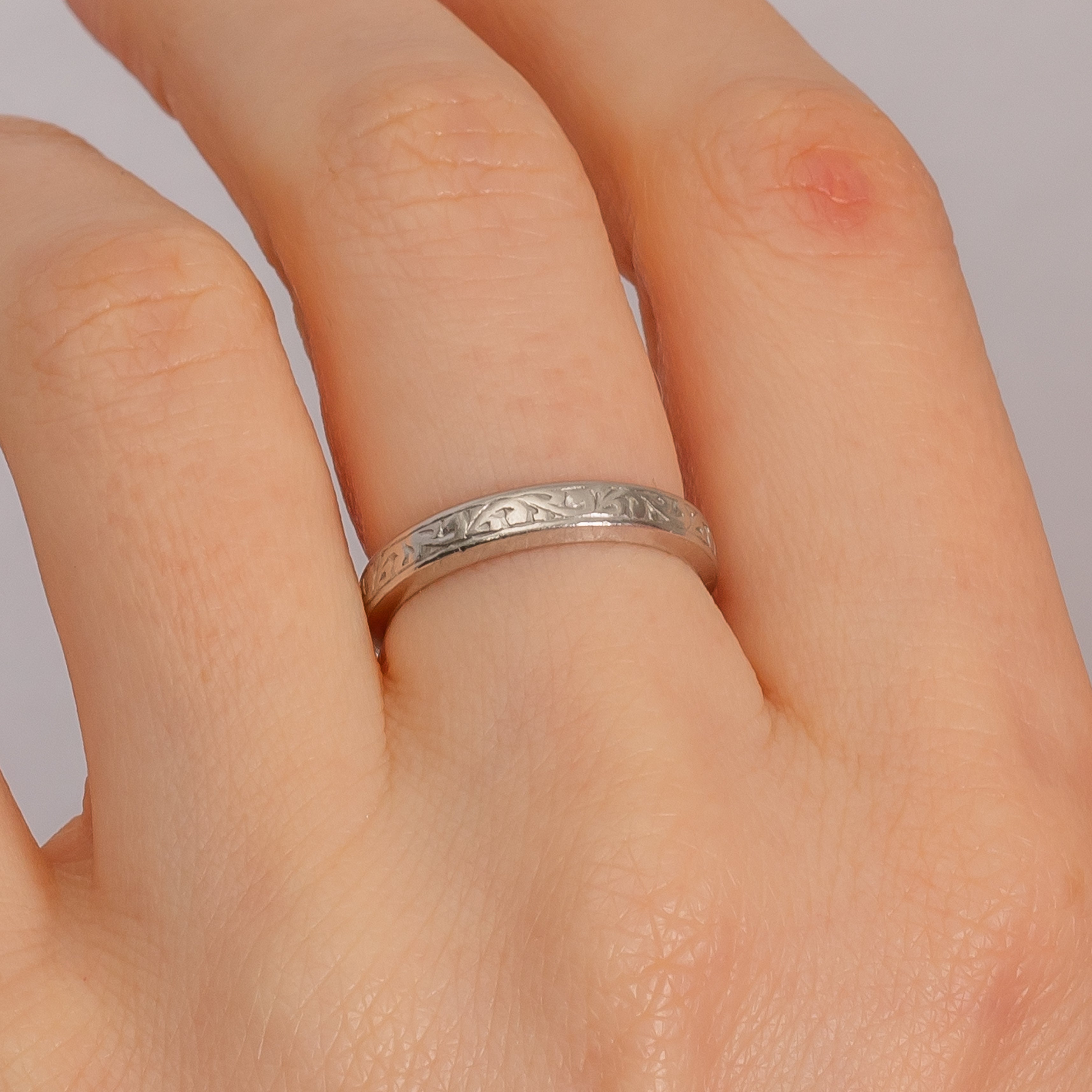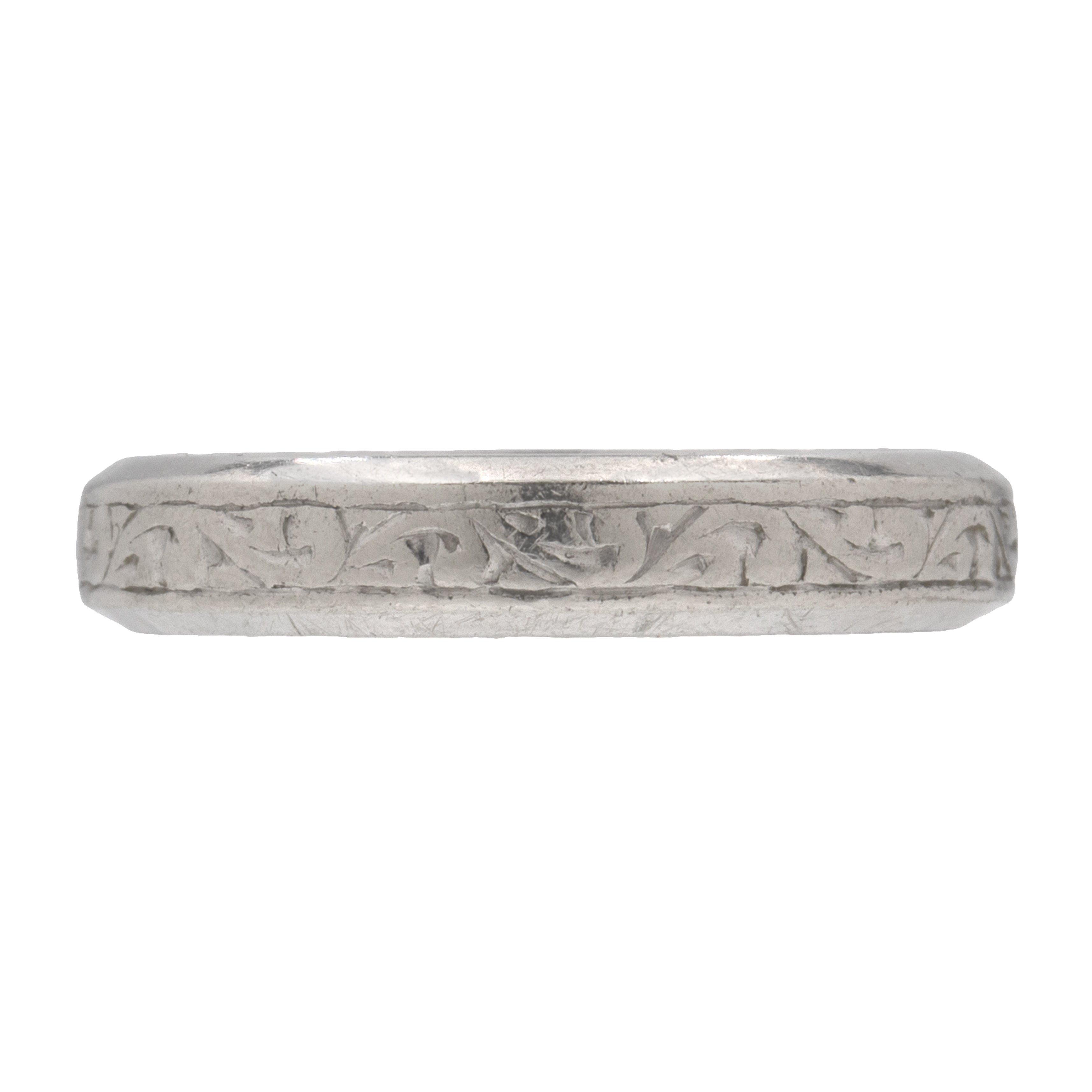 This Art Deco Platinum engraved band is a firm yes from us! Sweeping acanthus leaf engravings adorn the entire circumference of this Art Deco ring, bursting with femininity from every angle.