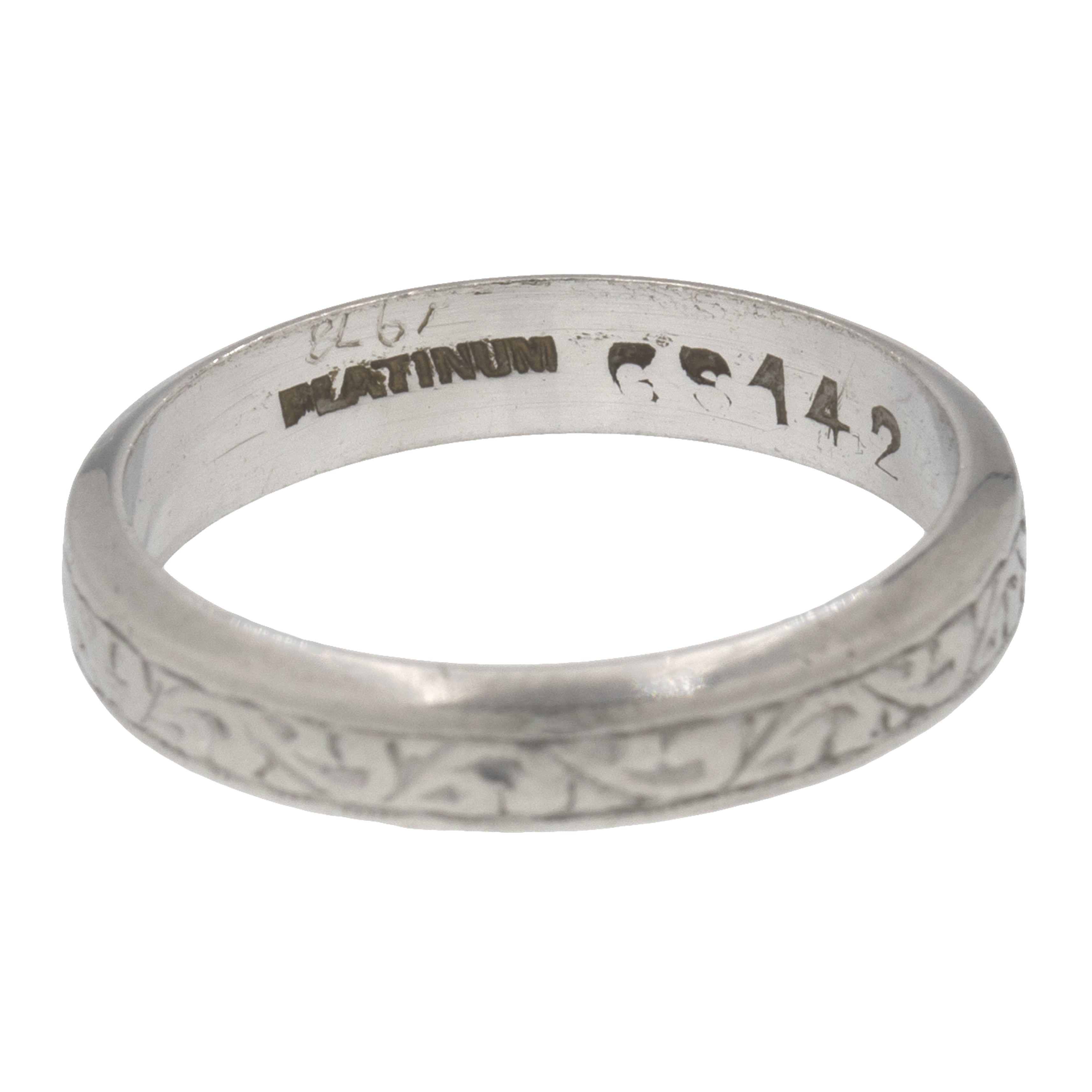 VERY GOOD. This Art Deco Platinum engraved band is in very good condition! The engravings are crisp and run across the entire circumference with no wear to note. On the edge and inside of the ring there are a few surface marks, but this isn't noticeable when worn. Bursting with Art Deco charm, you won't regret making this Platinum engraved ring yours!