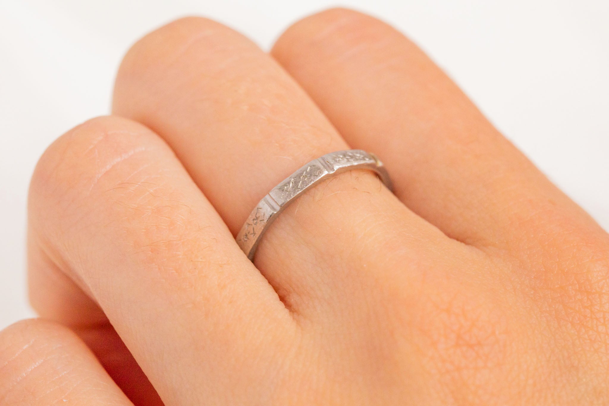 Tie the knot with your everlasting love with this Art Deco Platinum orange blossom engraved band! Her faceted circumference is inlaid with delicate orange blossom engravings, crafted entirely from highly durable solid Platinum.