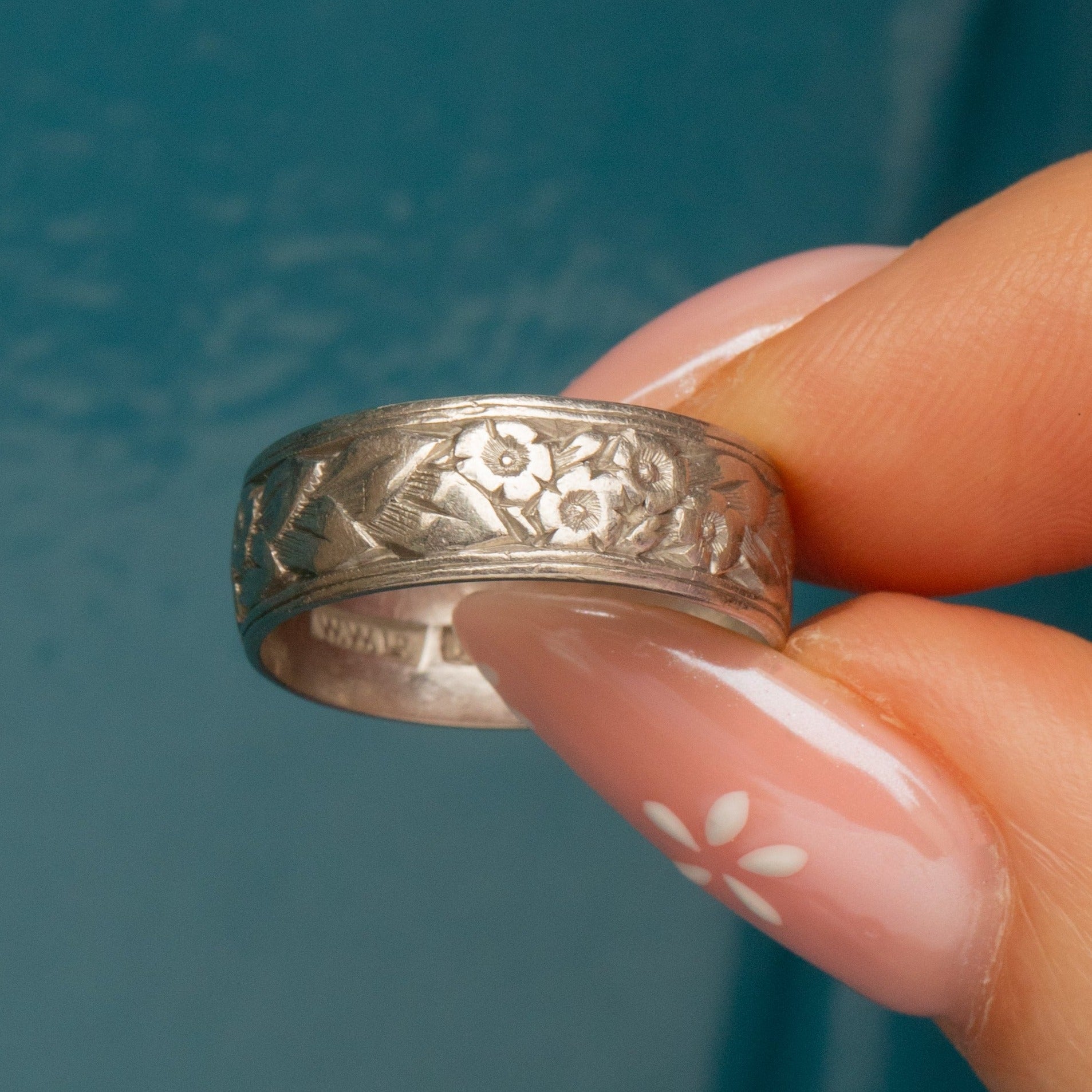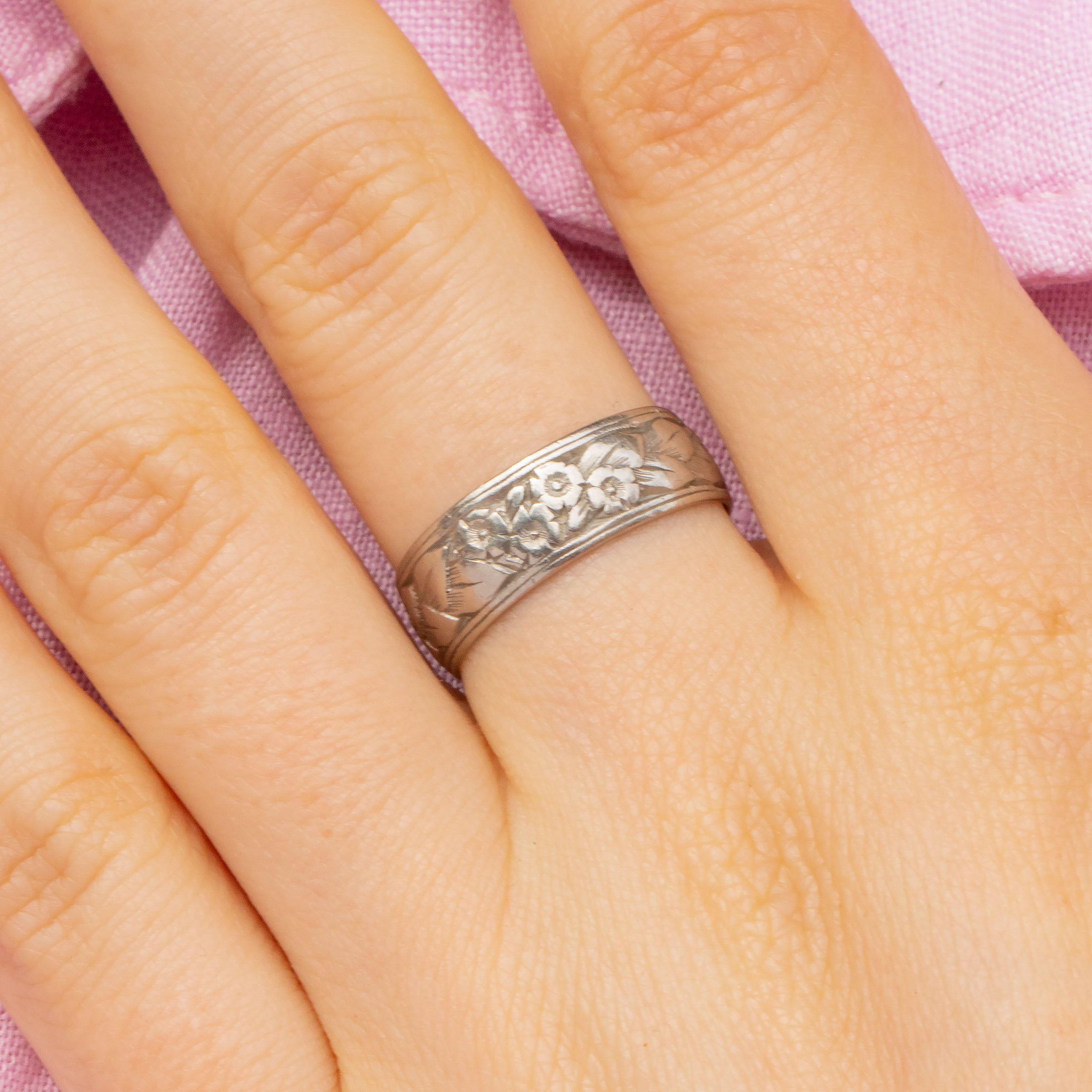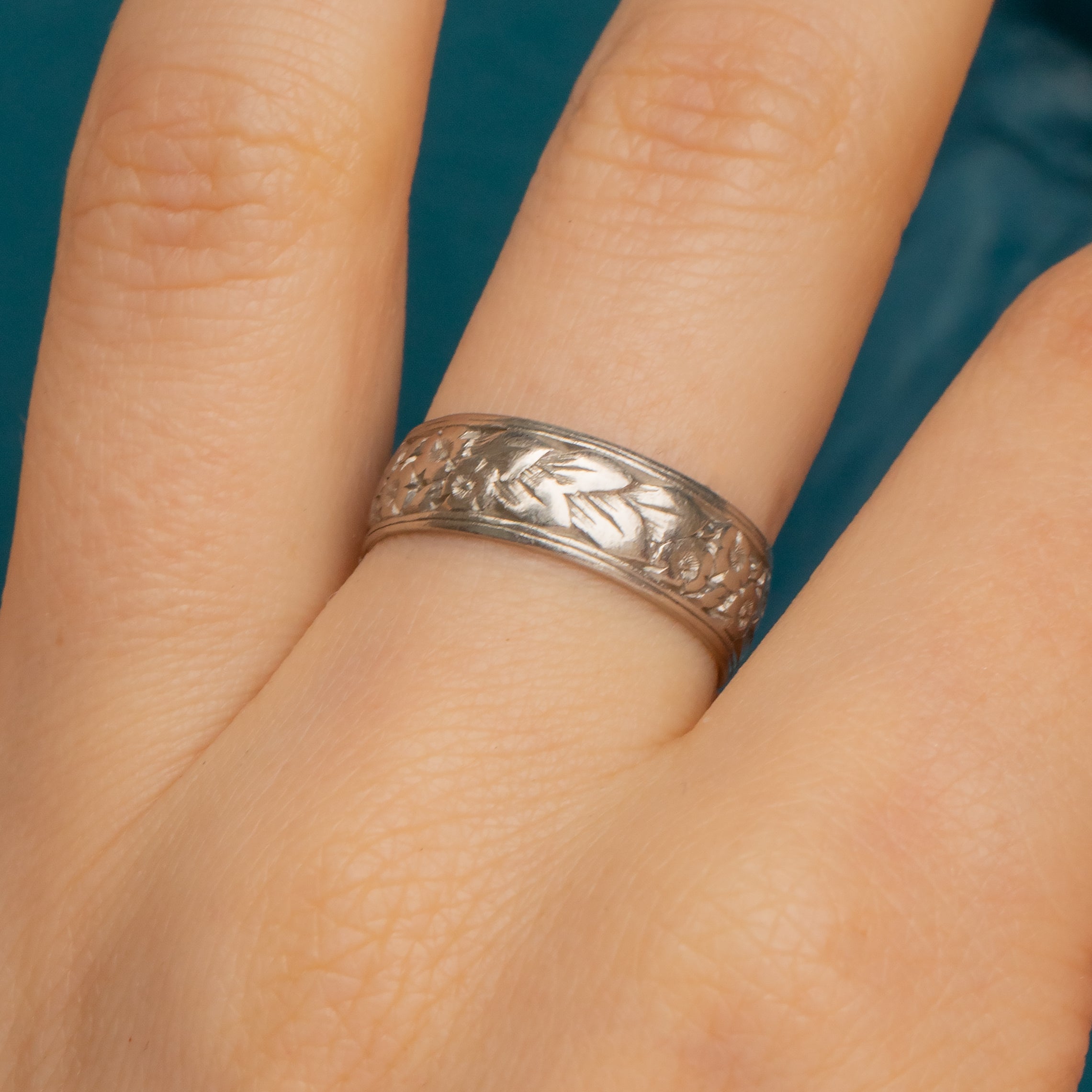 This antique Platinum orange blossom engraved ring is quite the statement piece! Measuring 6mm wide, every inch of her bright, chunky Platinum band is adorned with delicate orange blossom engravings.