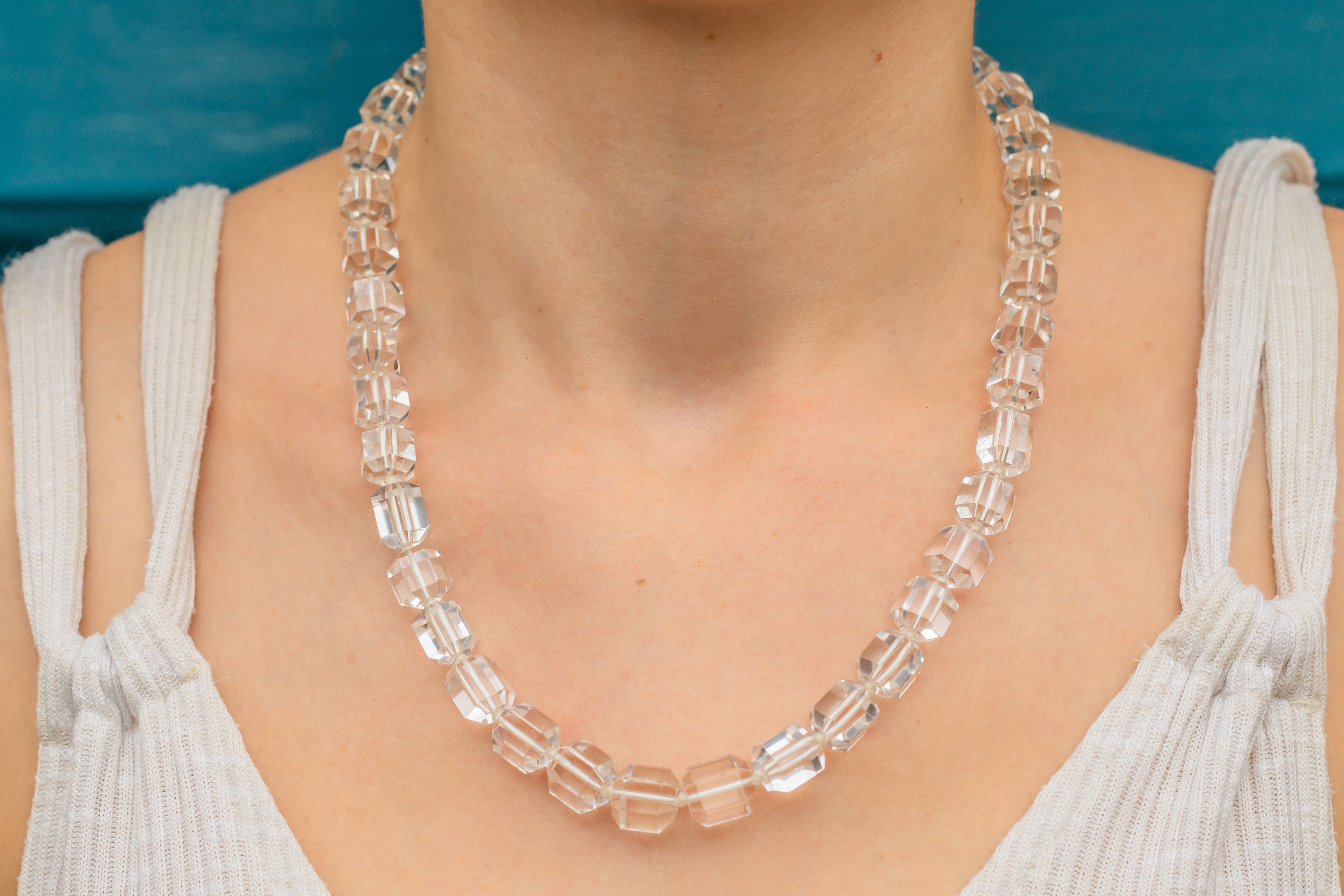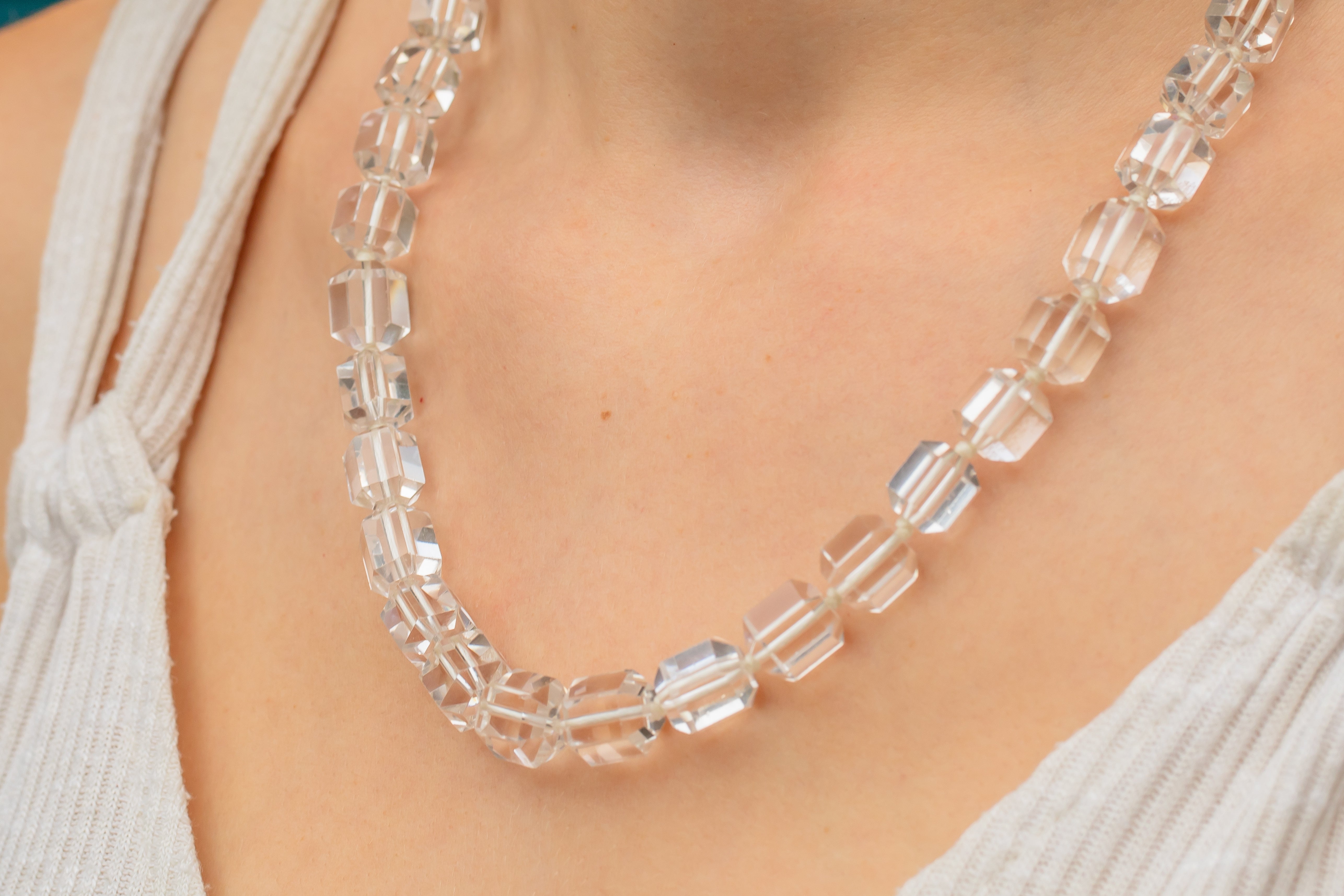 VERY GOOD. This Art Deco Rock Crystal beaded necklace is in very good condition. All of the beads are firmly connected and well-strung, with the Sterling Silver clasp also in fine working order! A few of the Rock Crystal beads have some minor abrasions after being worn and adored over many years but nothing significant. The Rock Crystals have been strung with thought and care, with a little knot between each of the stones for secure wear. This Art Deco item has lasted impeccably well through time and she remains a stunning and impactful piece!