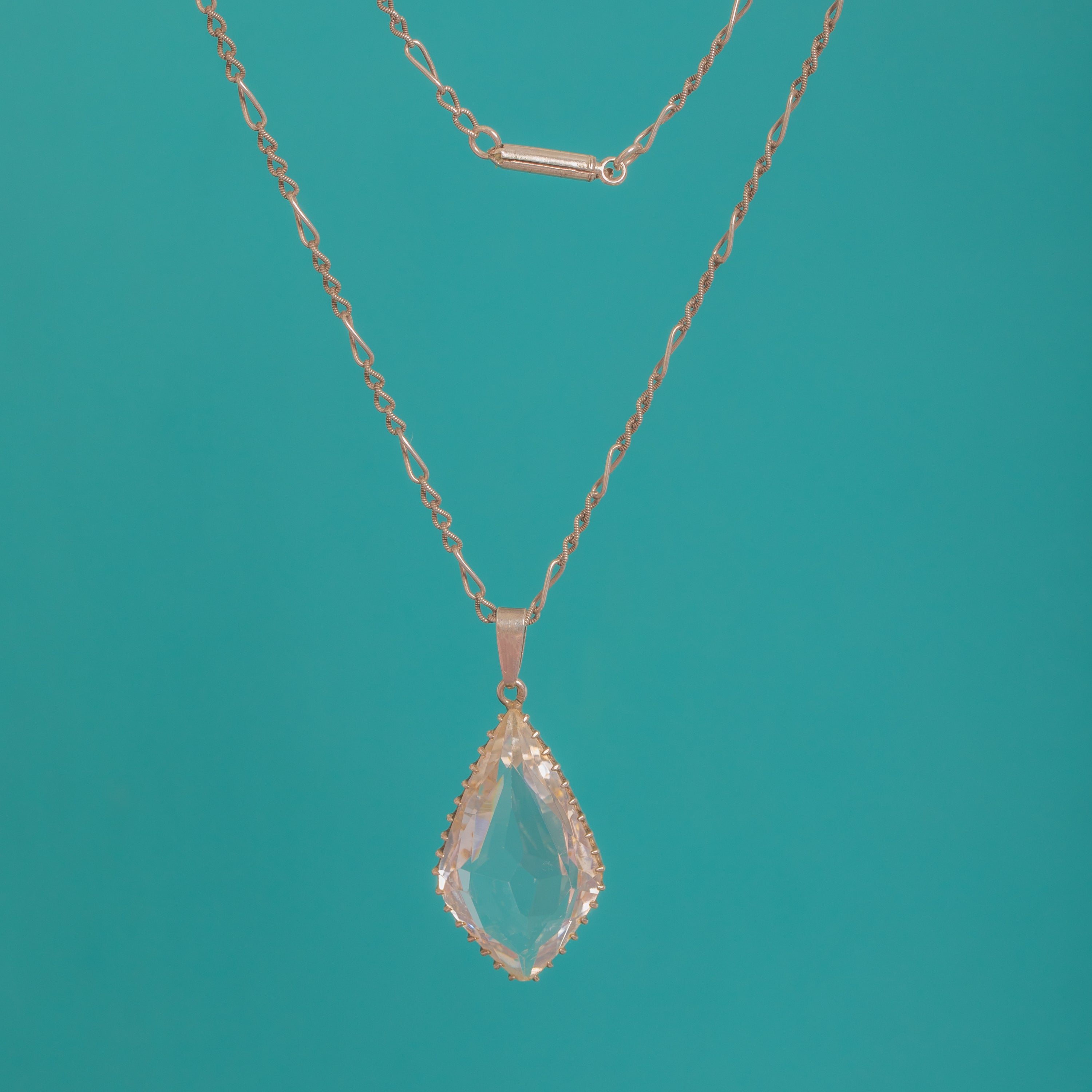 VERY GOOD: The Rock Crystal is bright with minor edge and facet abrasions commensurate with age, presenting lively sparkle. The Sterling Silver setting is secure with even teeth and a gentle antique patina; the chain and clasp are in good order with light surface wear from use. No visible repairs.