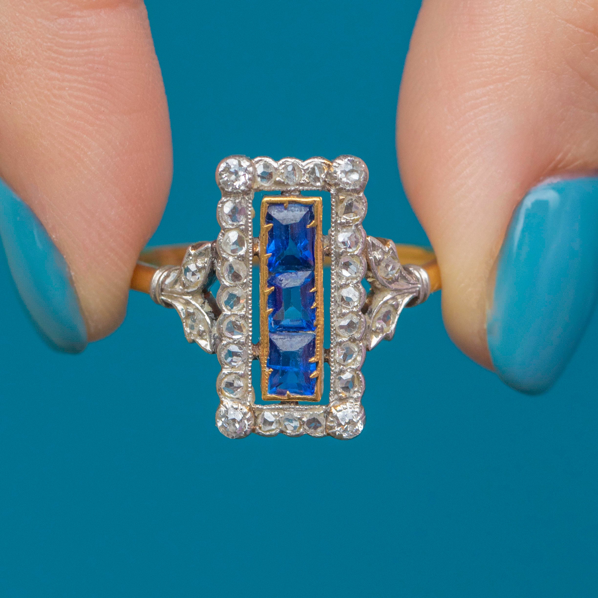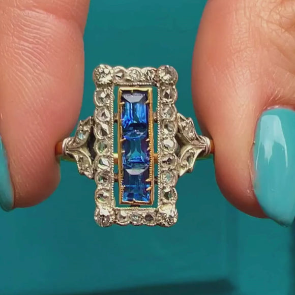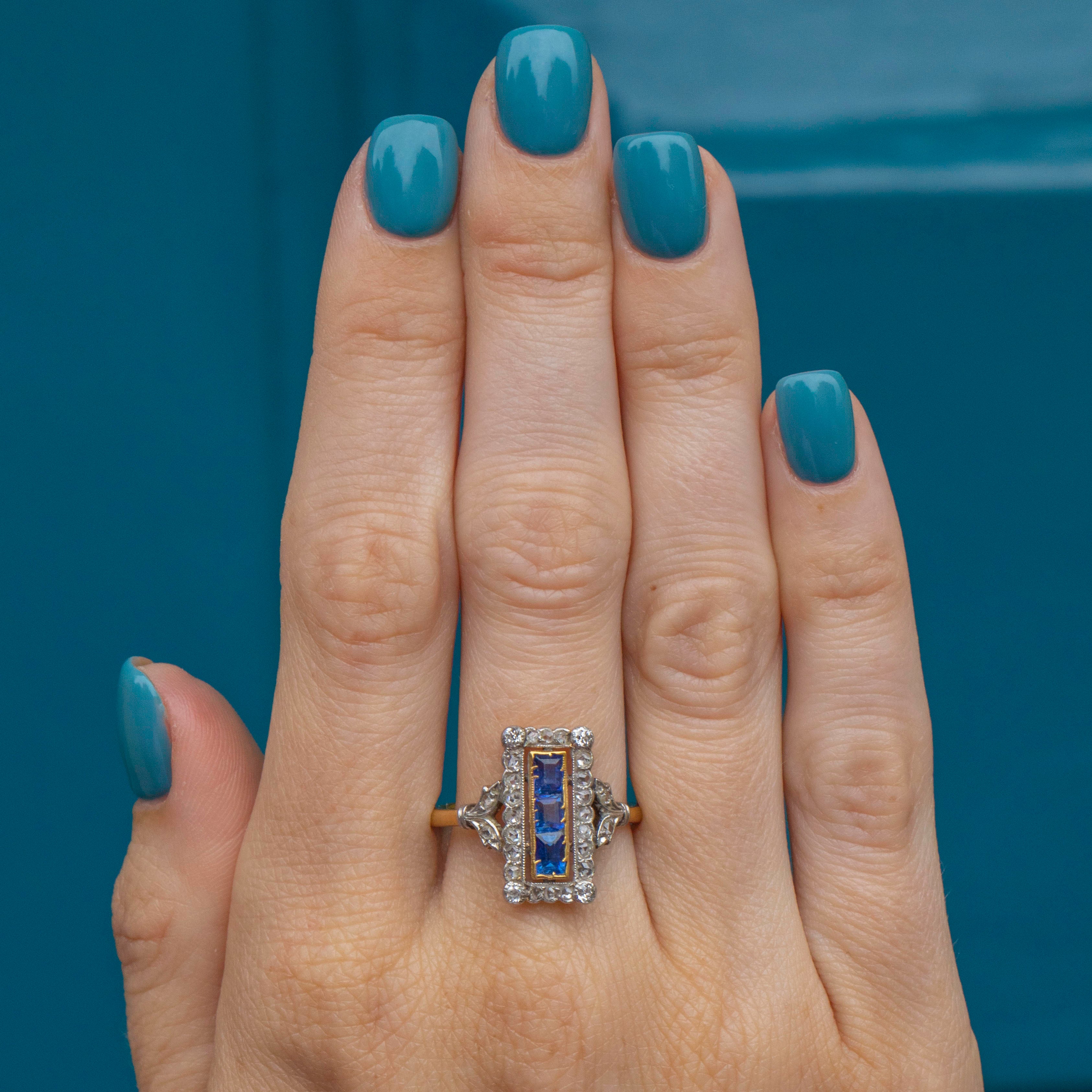 The three vivid Sapphires, with a combined weight of 0.60ct, will instantly draw your eye and the dazzling rose-cut Diamonds provide a wonderful sparkling accent. Providing you with excellent finger coverage, this spectacular piece of Art Deco craftsmanship is set to become your most coveted treasure!