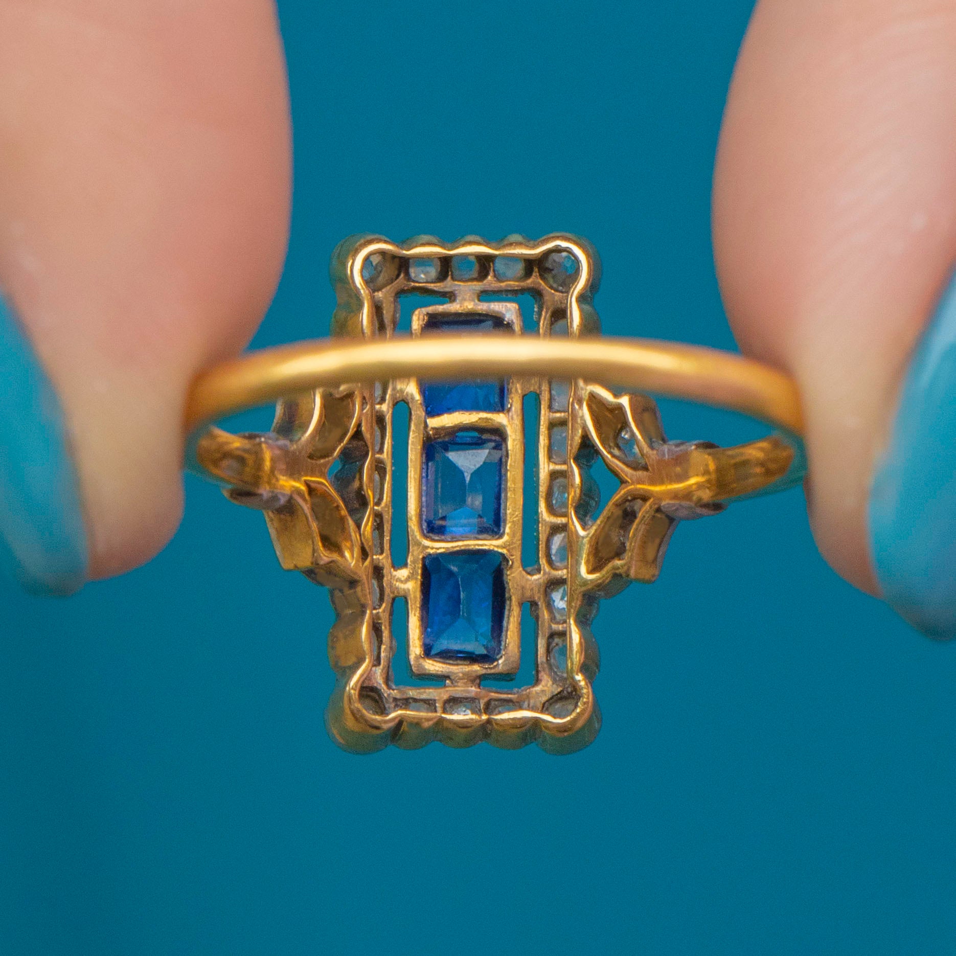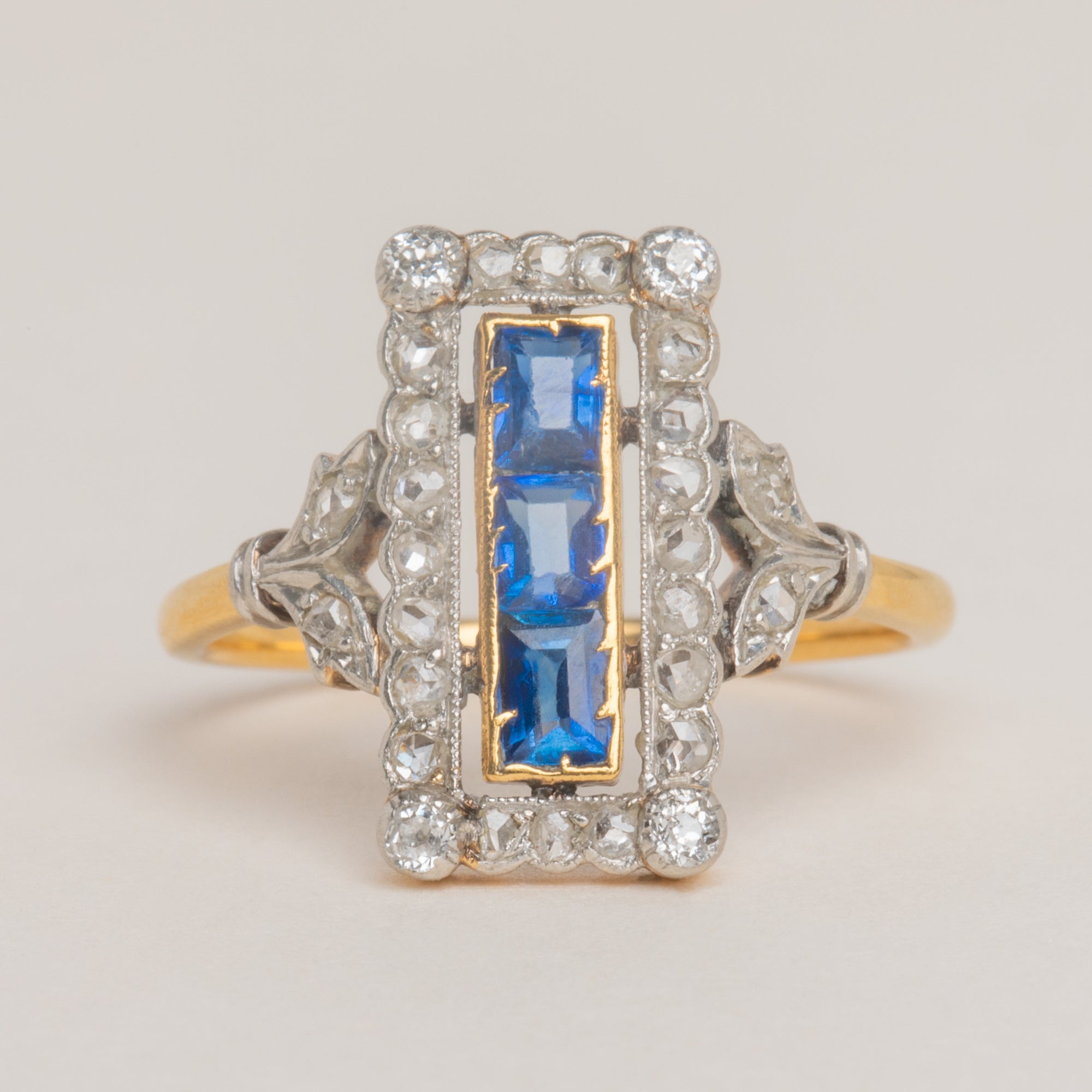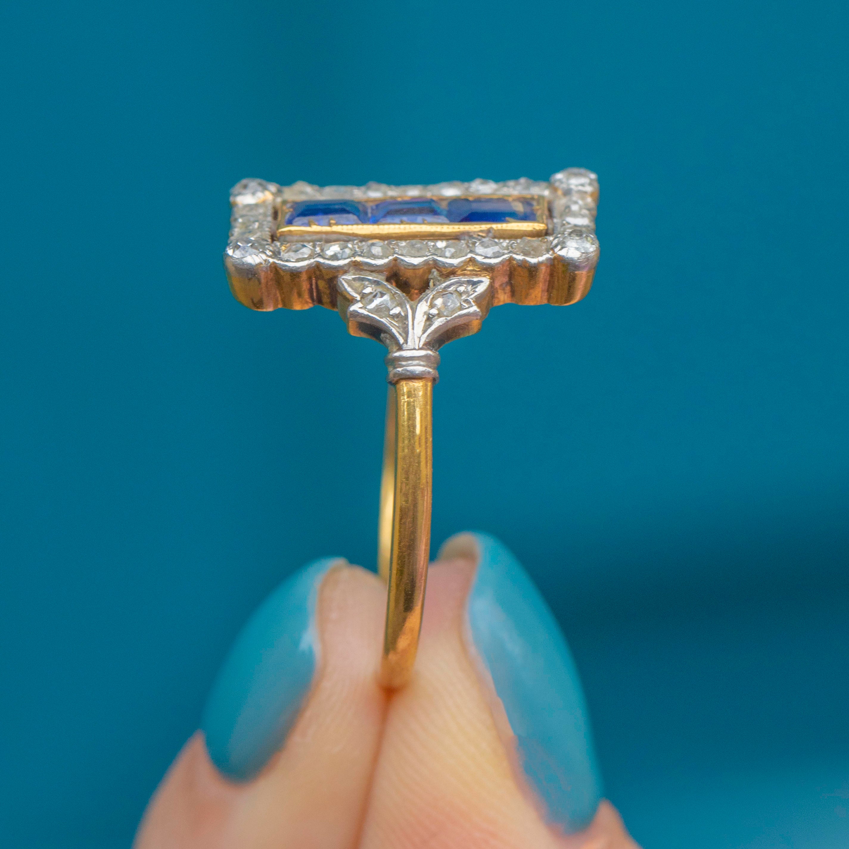 The three vivid Sapphires, with a combined weight of 0.60ct, will instantly draw your eye and the dazzling rose-cut Diamonds provide a wonderful sparkling accent. Providing you with excellent finger coverage, this spectacular piece of Art Deco craftsmanship is set to become your most coveted treasure!