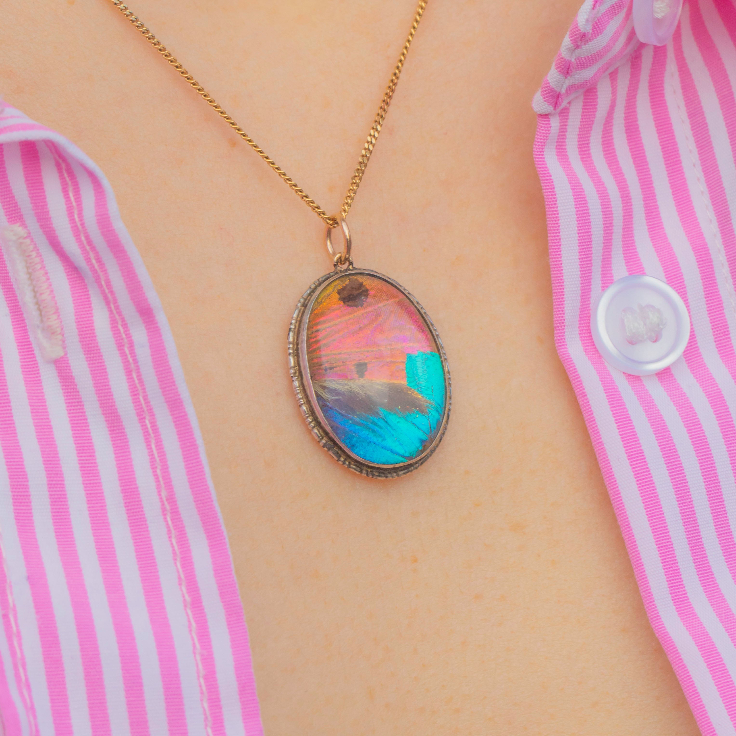 The iridescent wings are encased in a Silver bezel setting and framed by a textured border in classic Art Deco style. The generous size and vibrance of this antique butterfly wing pendant will ensure that you stand out from the crowd when its adnornig your décolletage!