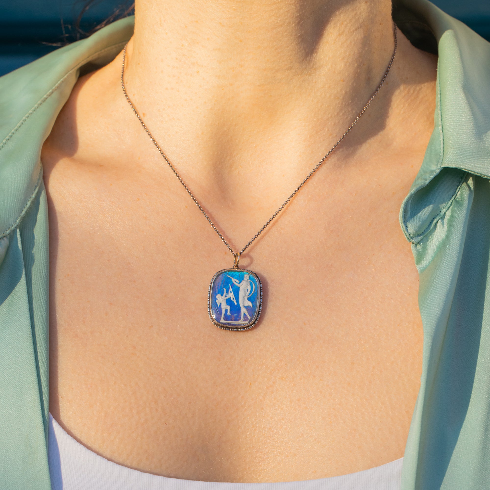 Encased in Sterling Silver, the cool colour palette of this antique Silver pendant ensures it pairs effortlessly with a variety of outfits. Radiating Artemis's strength and mystery, with the cherub's playful energy, this Silver pendant is destined to be a captivating conversation starter wherever you go!