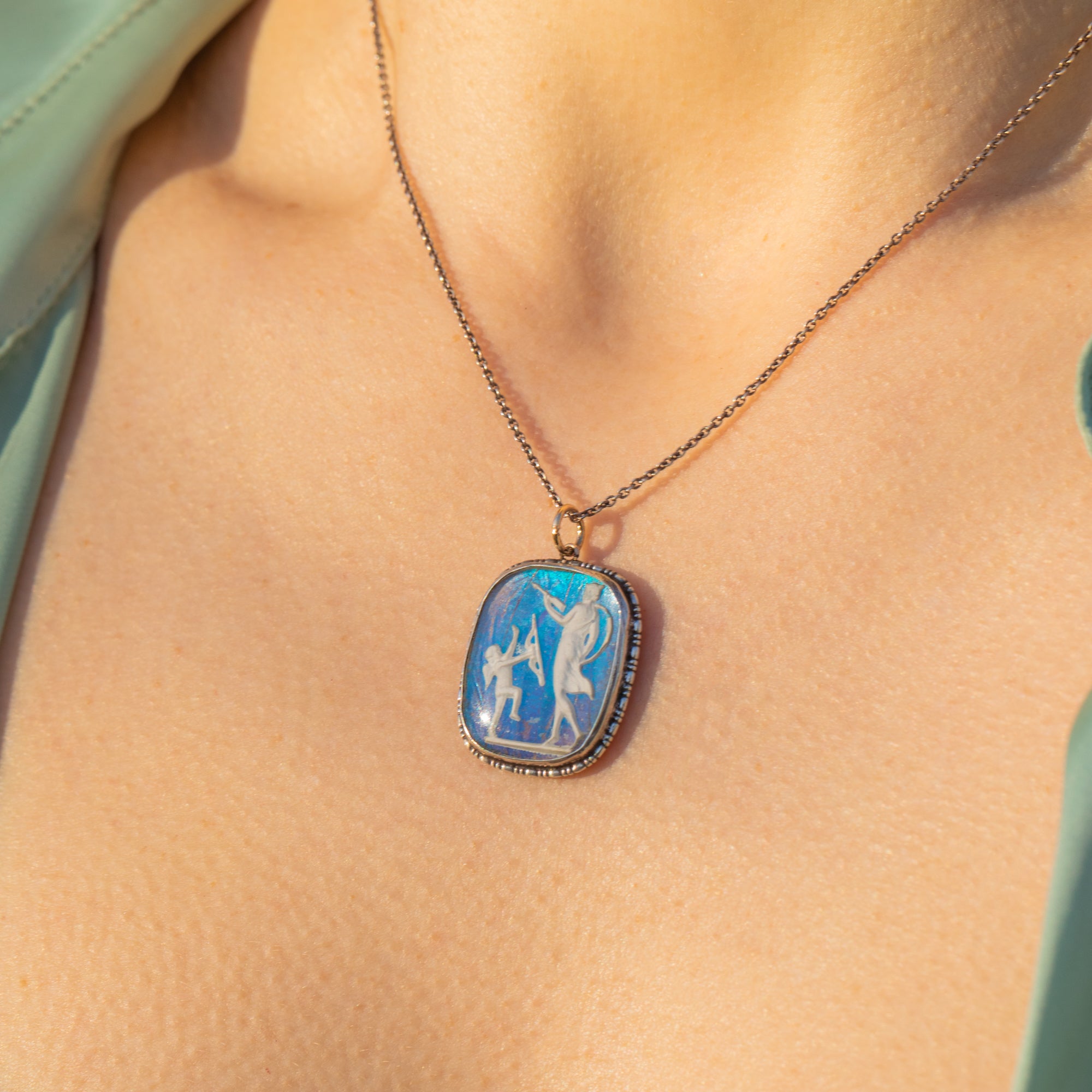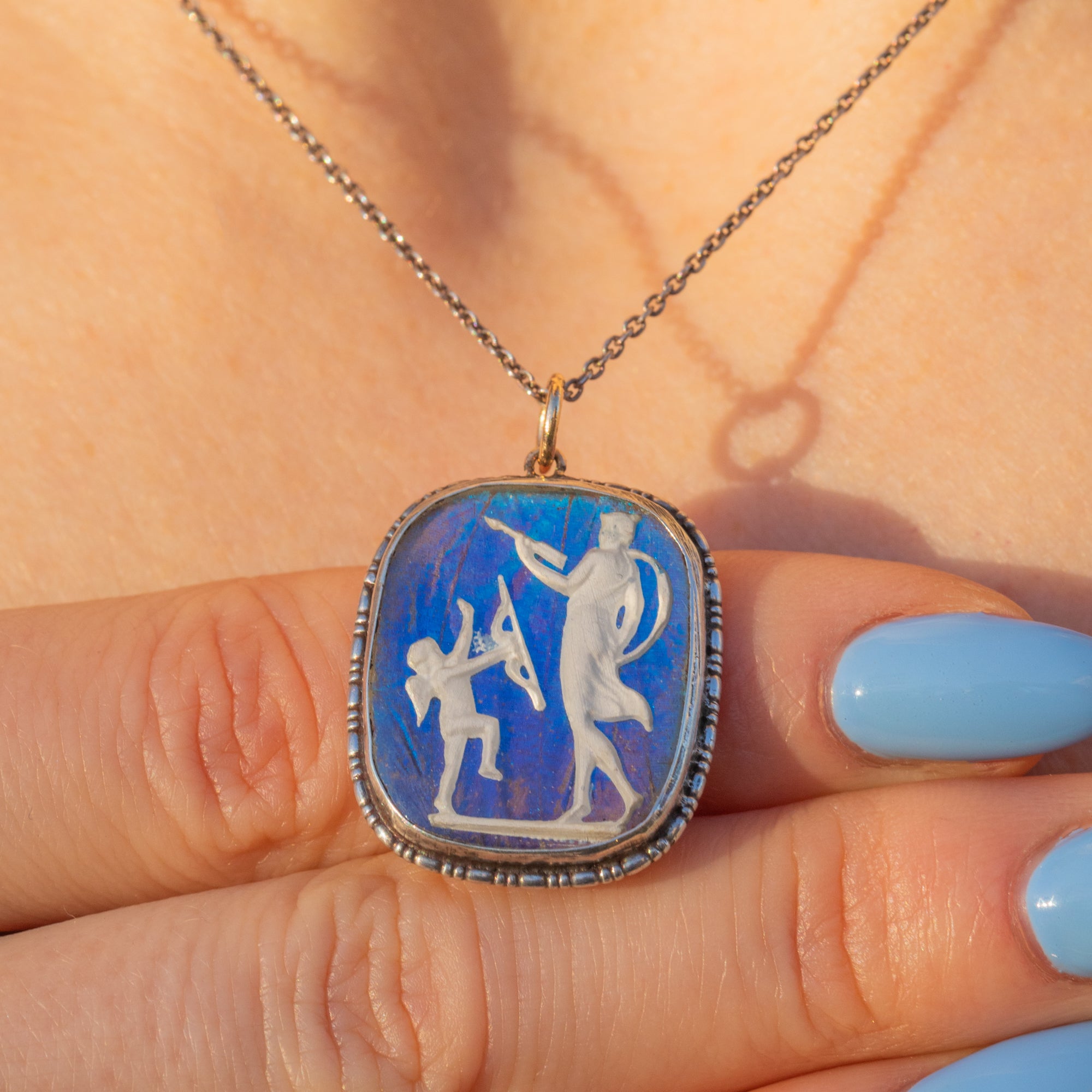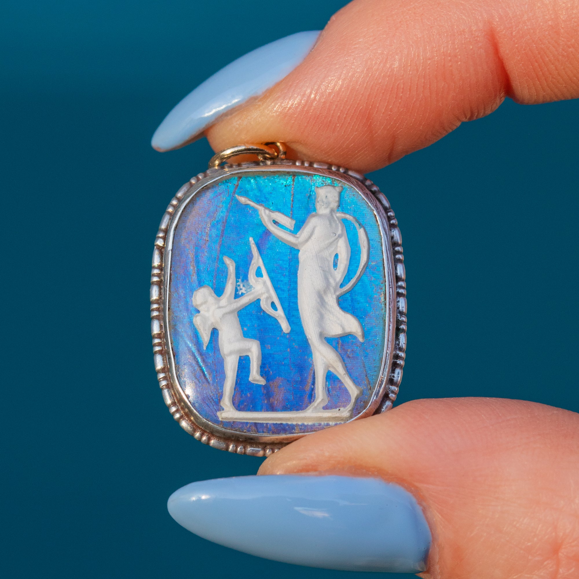 We love this Art Deco Silver butterfly wing pendant! Using the natural beauty of a shimmering electric blue Morpho butterfly wing as a background, a crisp motif of the Goddess Artemis and a cherub stands in front, creating a striking contrast of shimmering beauty.