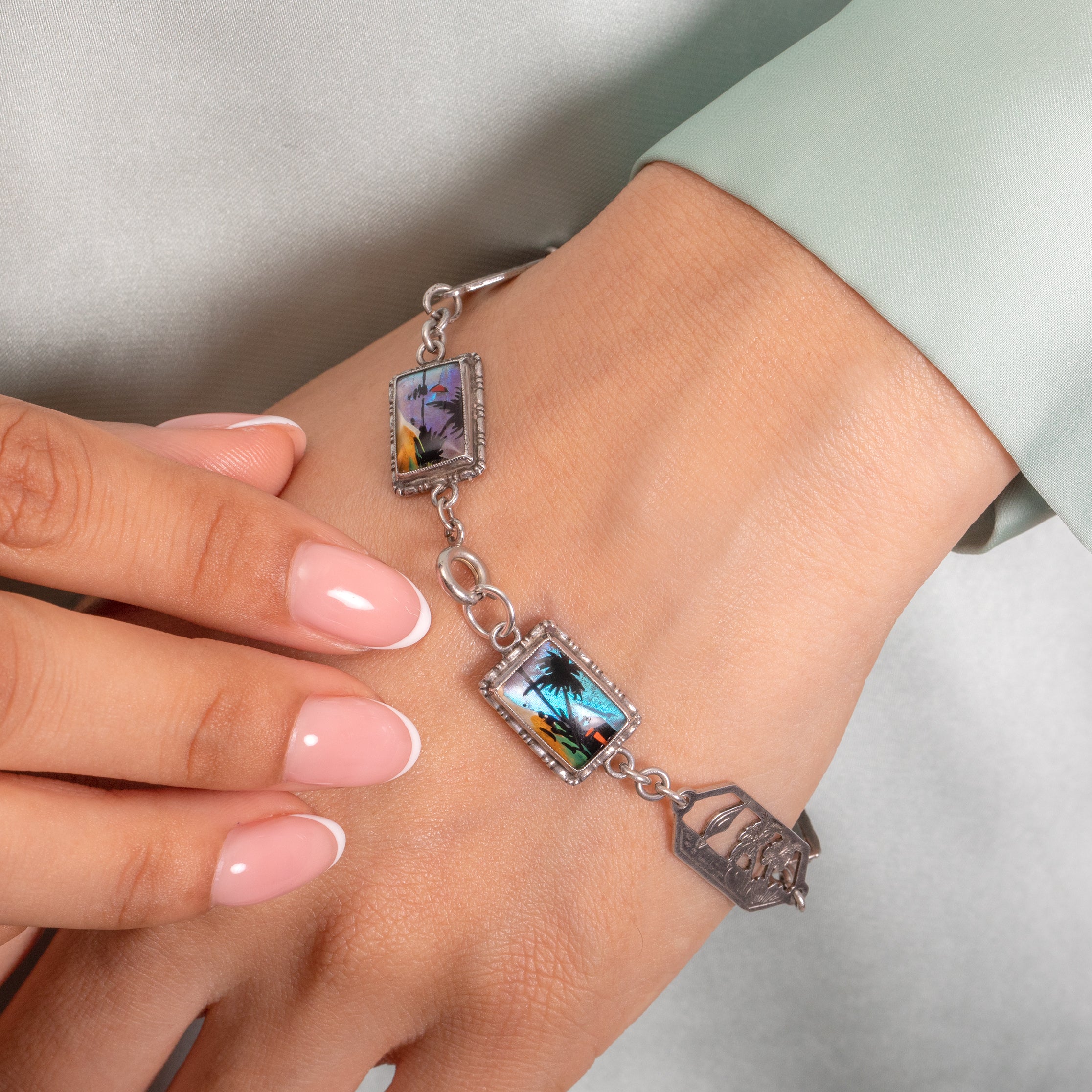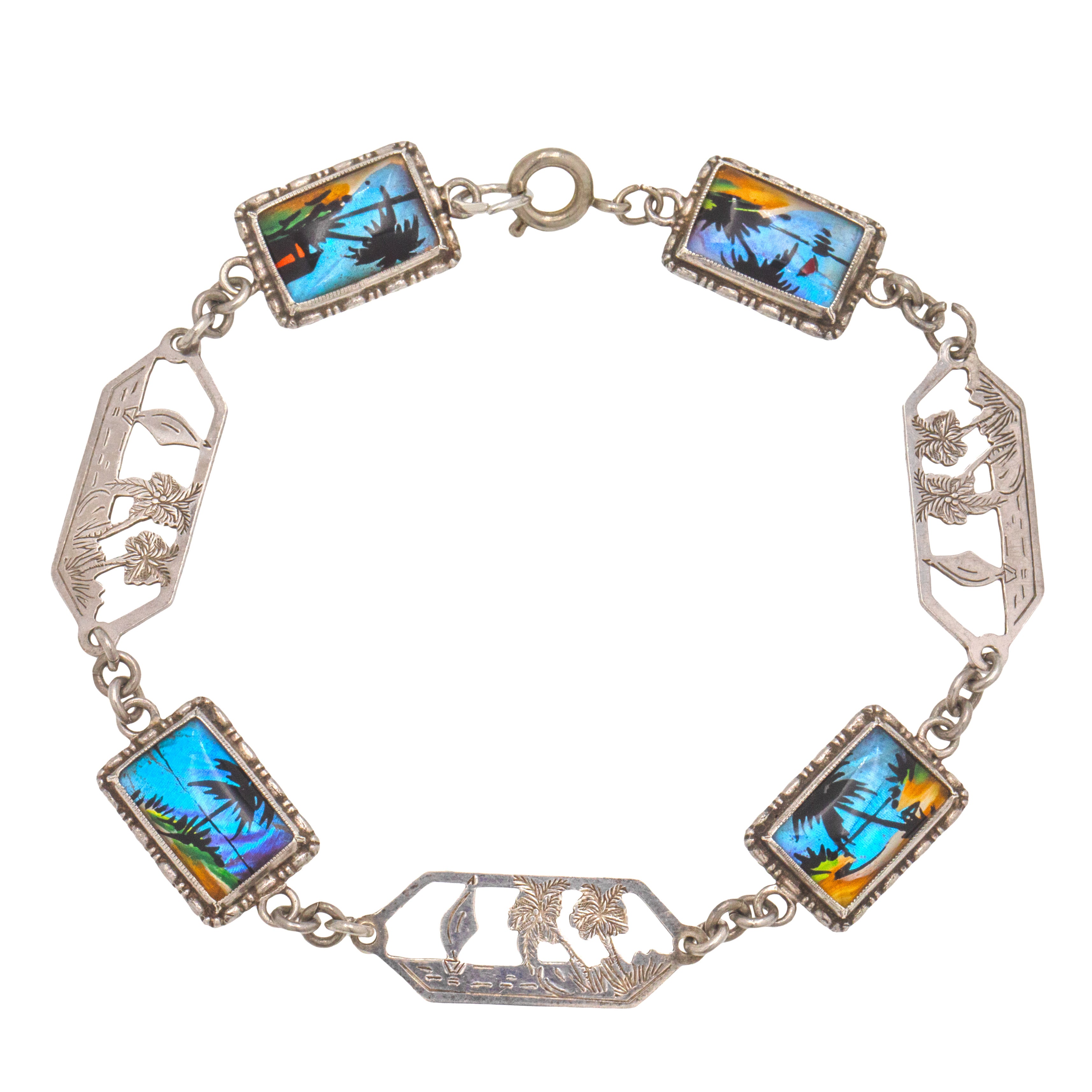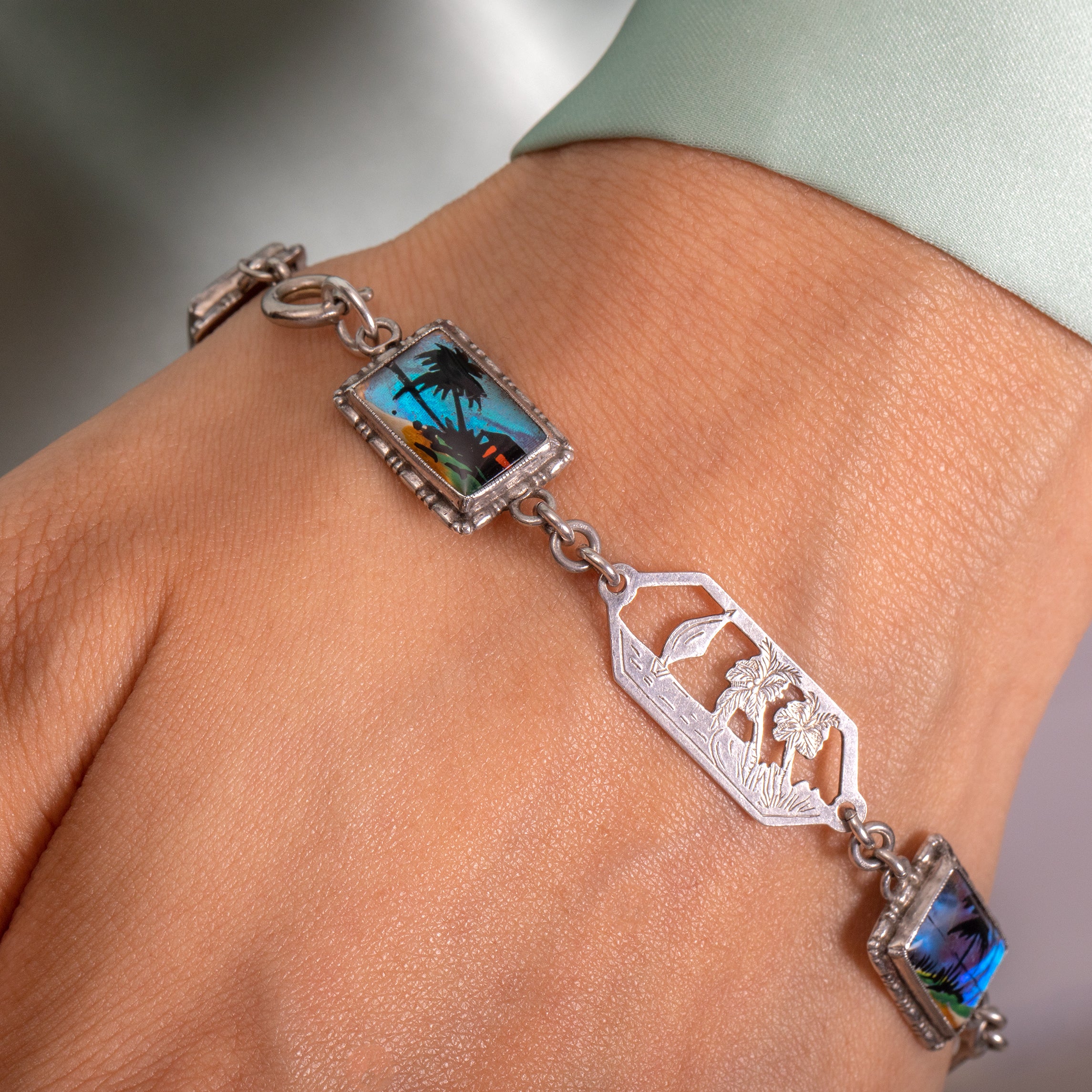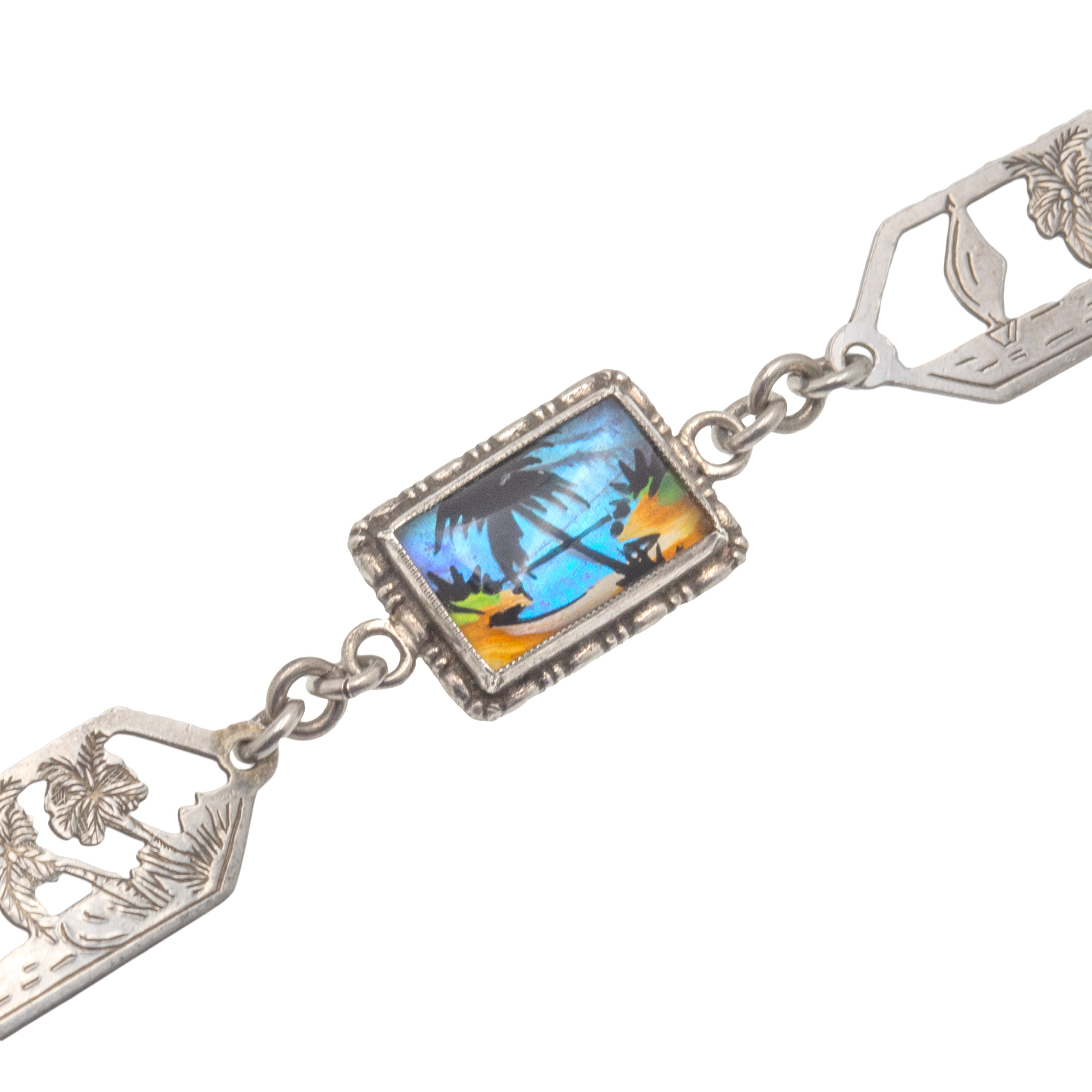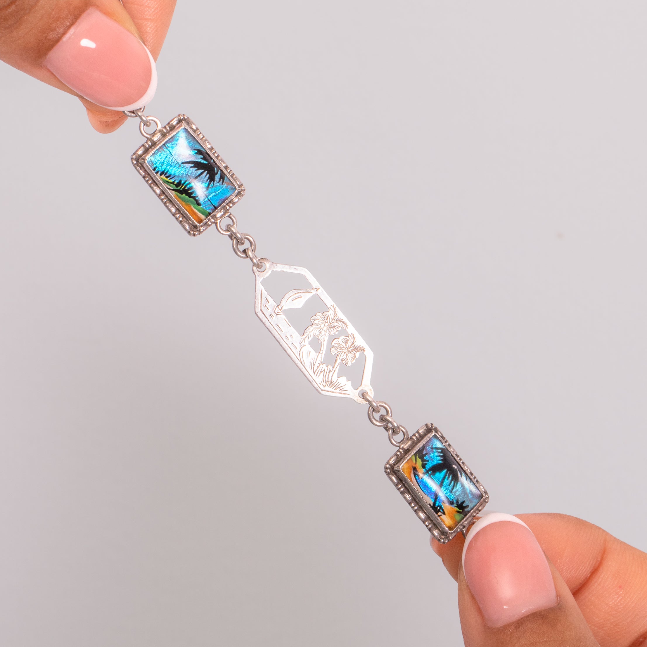 Four of the links feature a Morpho butterfly wing with an intricately painted tropical scene, alternating with intricately cut-out and engraved links creating a striking tropical-inspired bracelet that will instantly transport you to warmer climates!