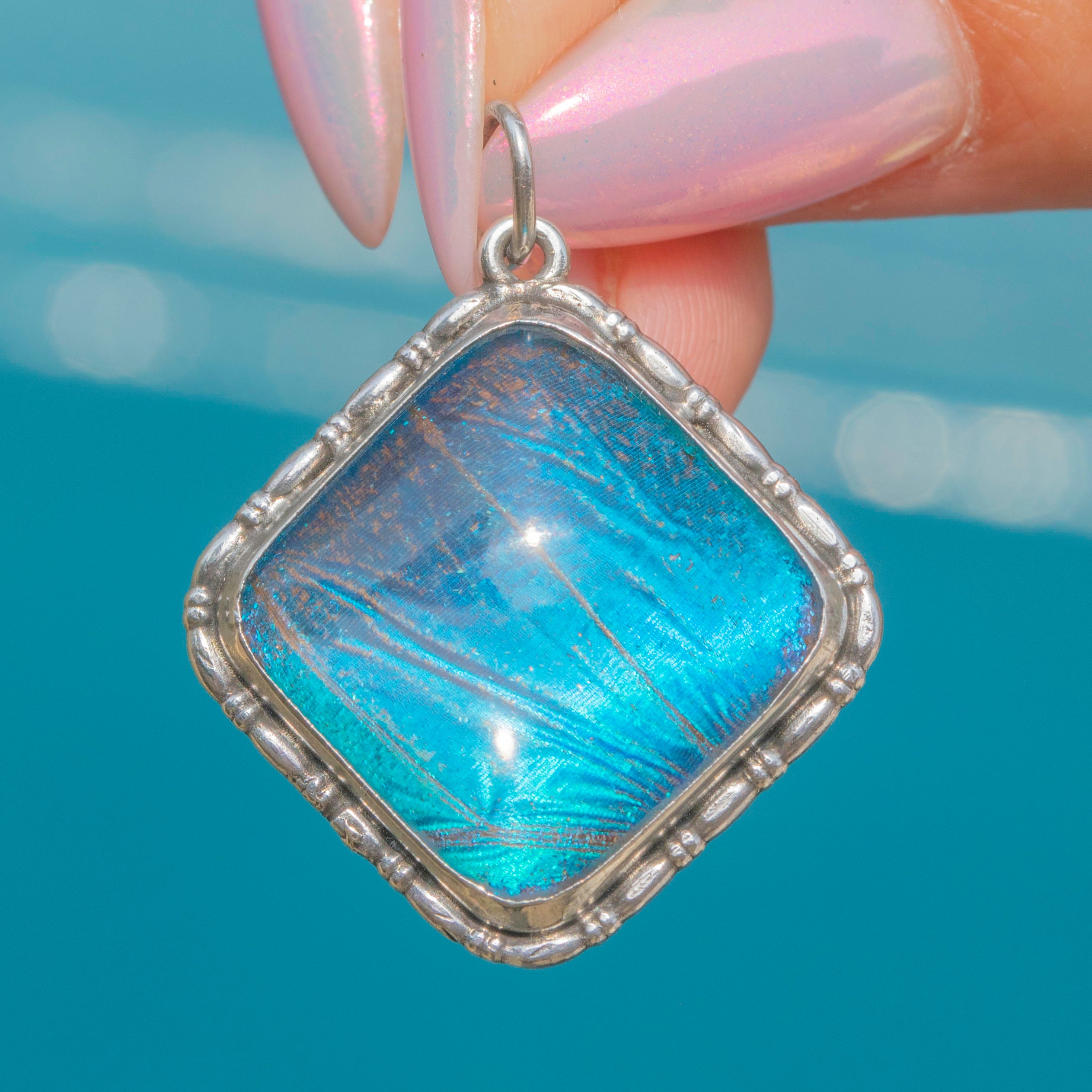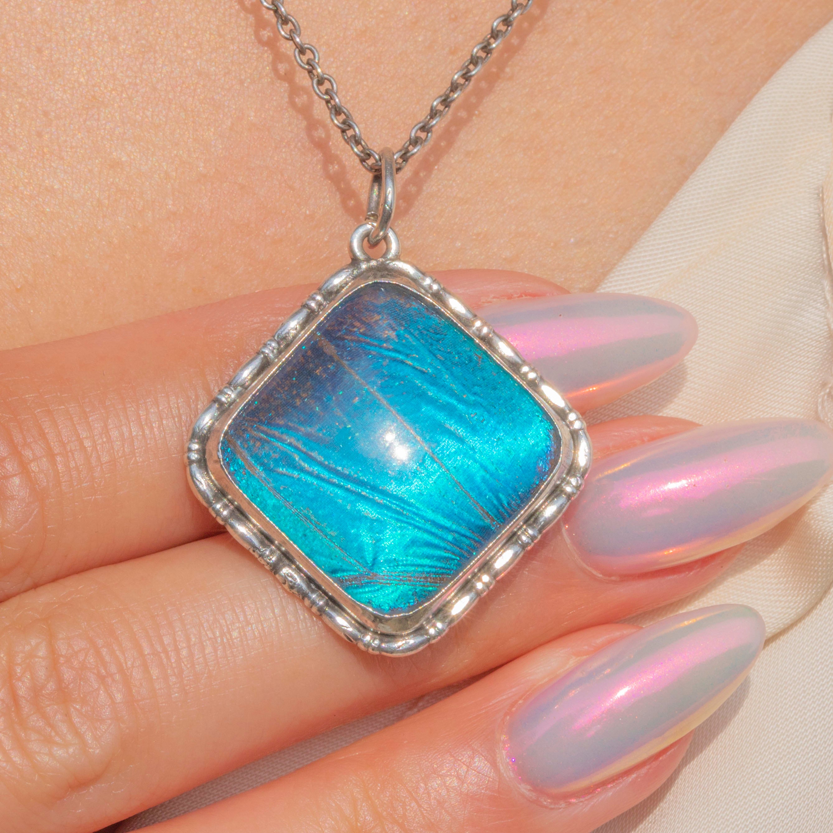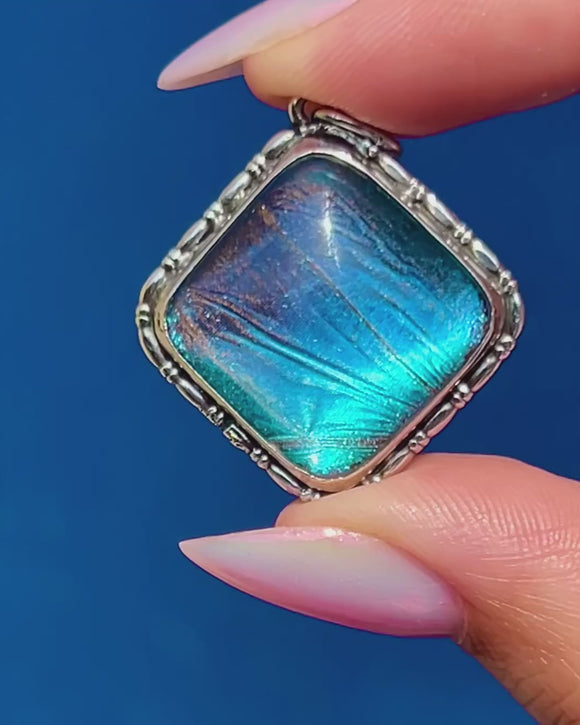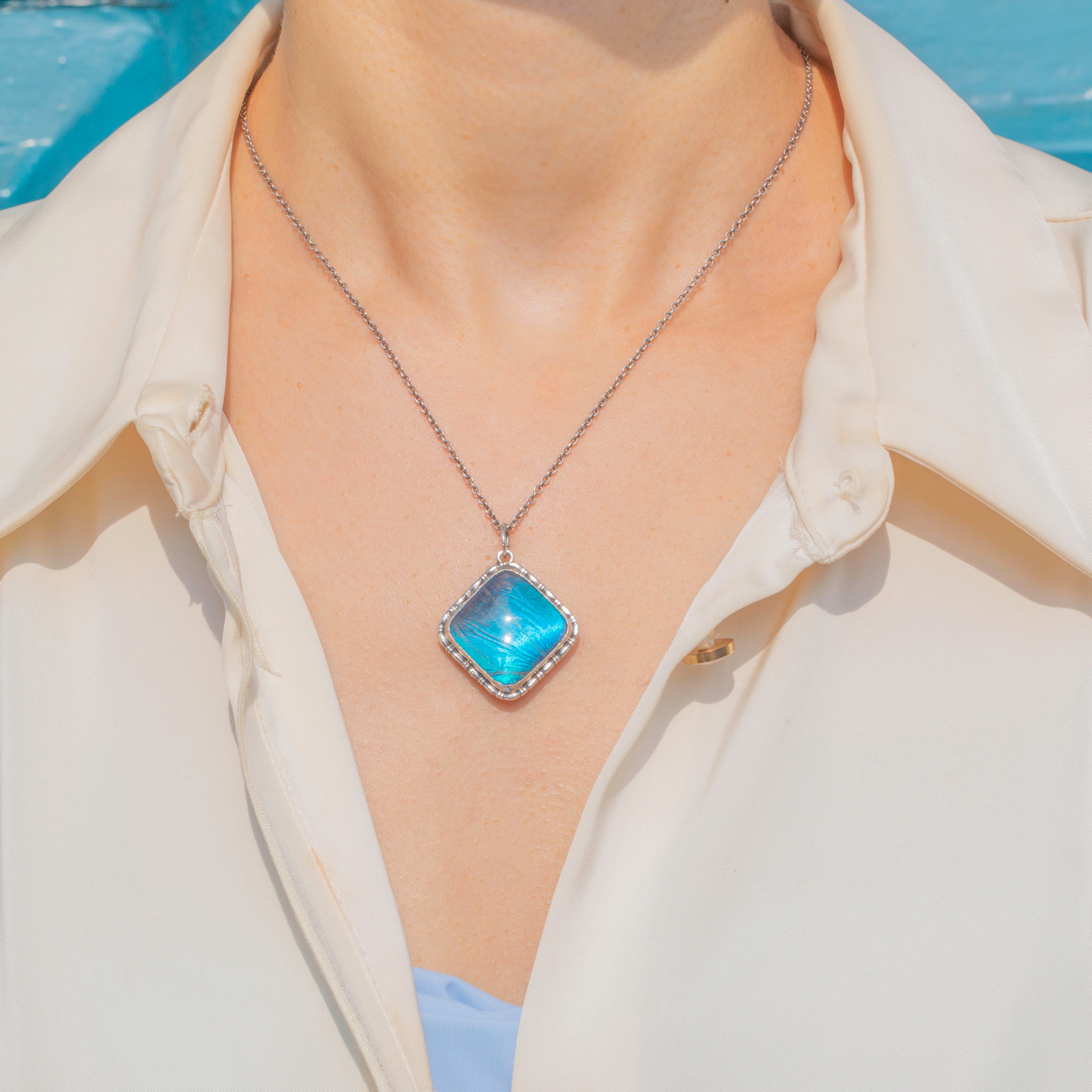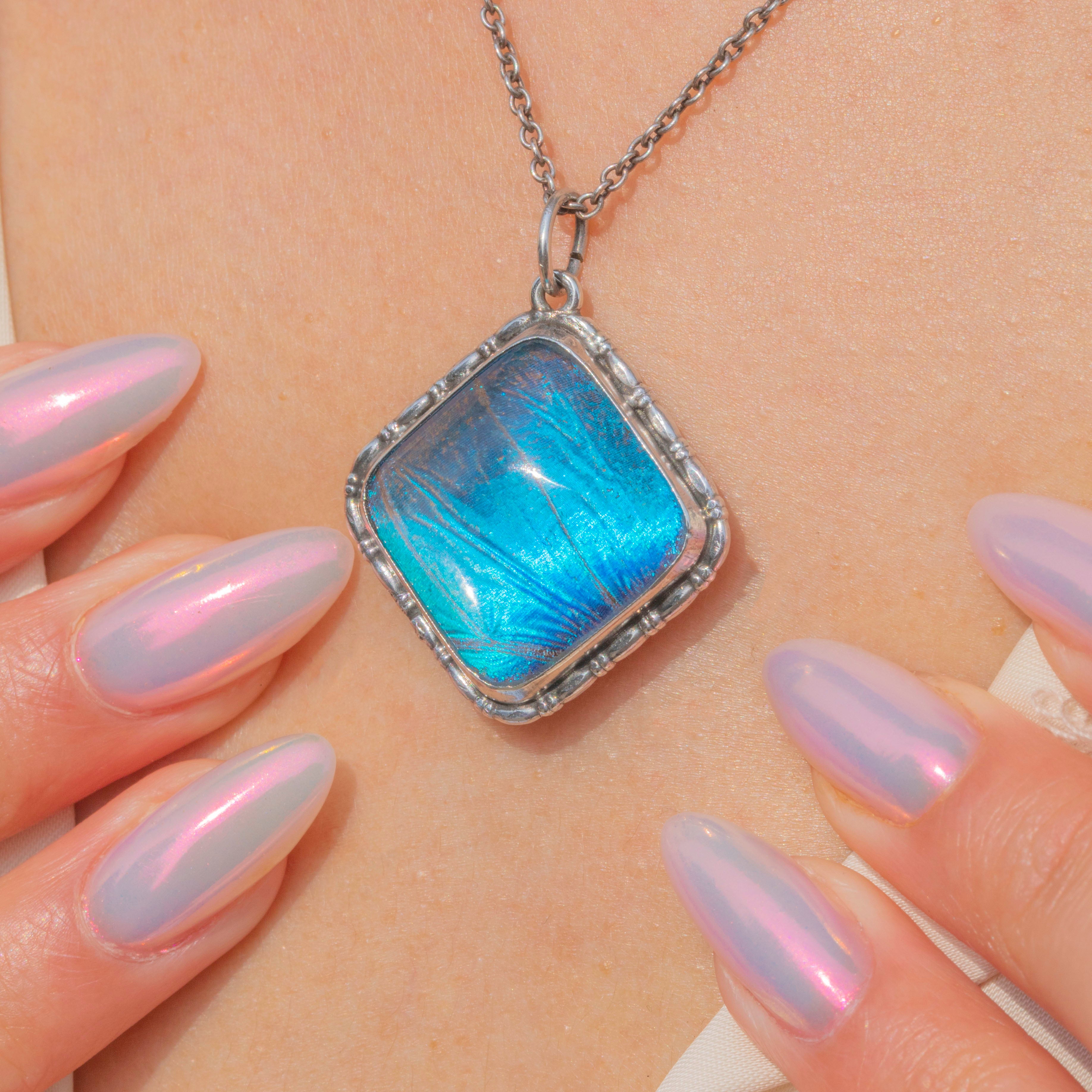 This Art Deco Silver Butterfly Wing square pendant is a captivating piece! The vibrant blues that the Morpho wing exudes add a burst of colour that will elevate any outfit.