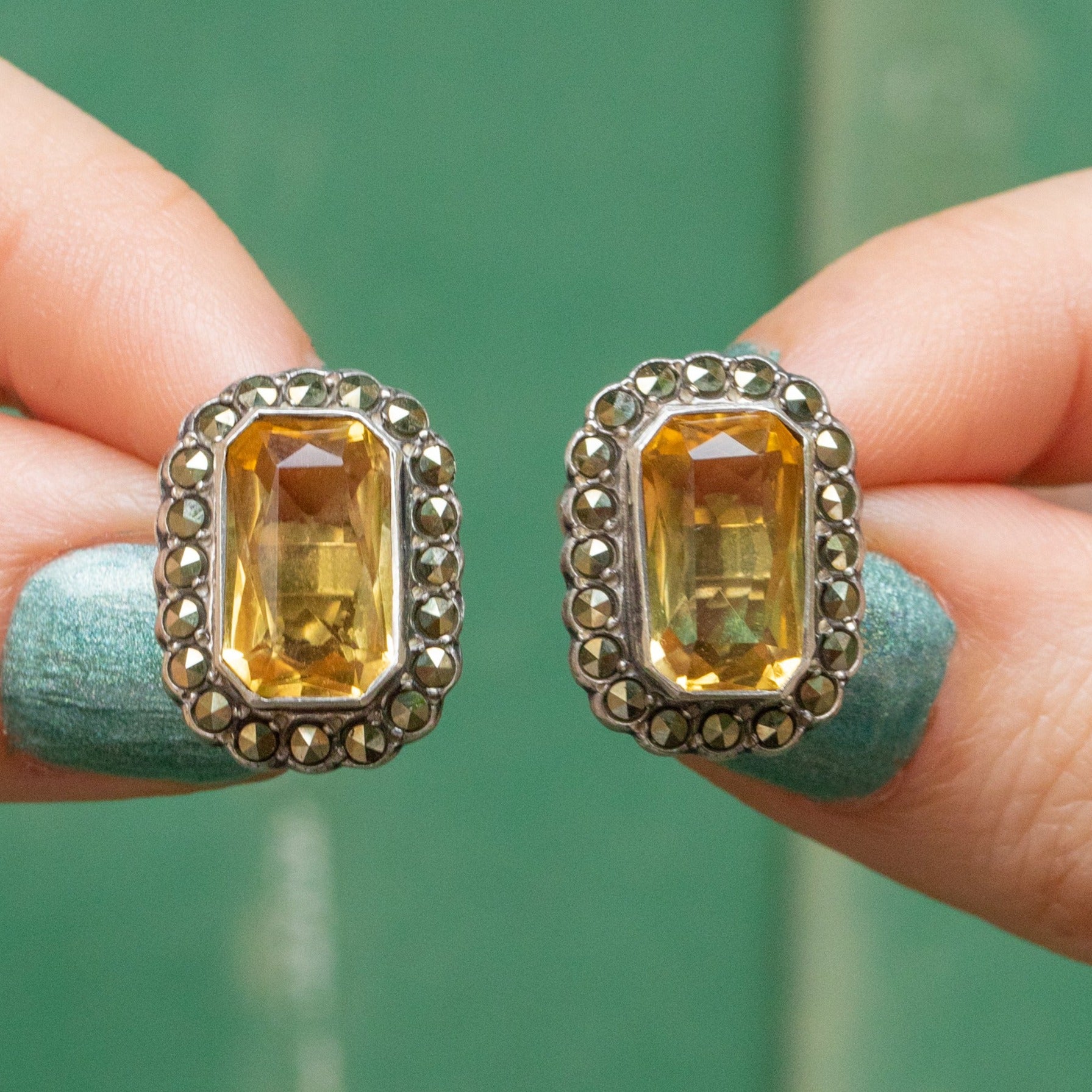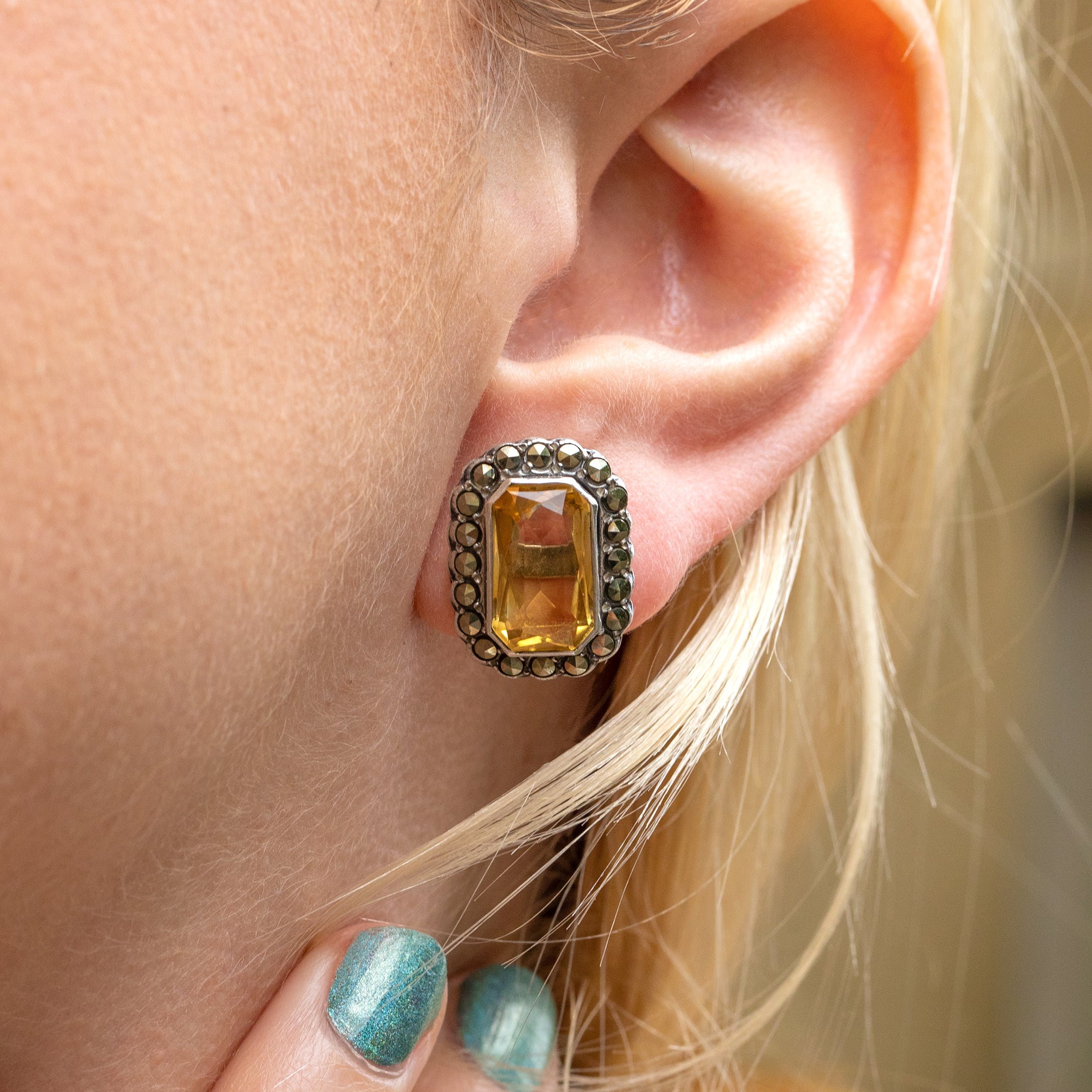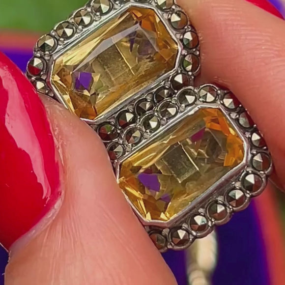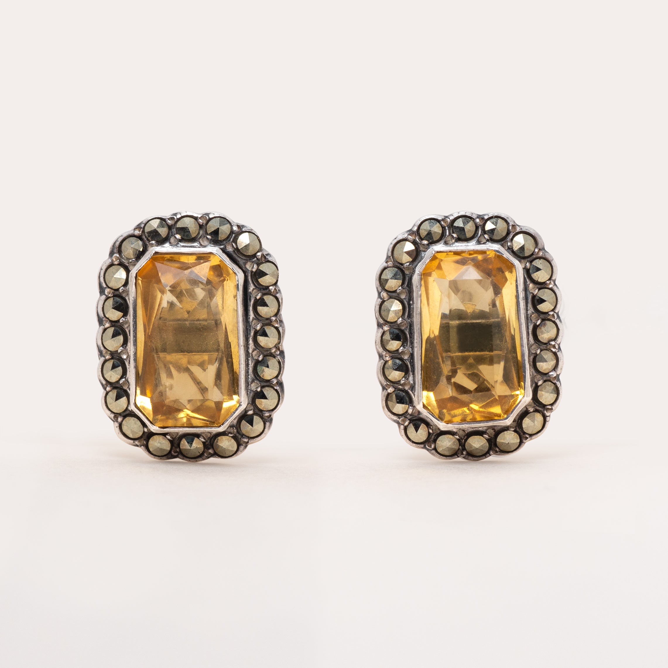 Art Deco Silver Citrine & Marcasite Stud Earrings, 6.00ct