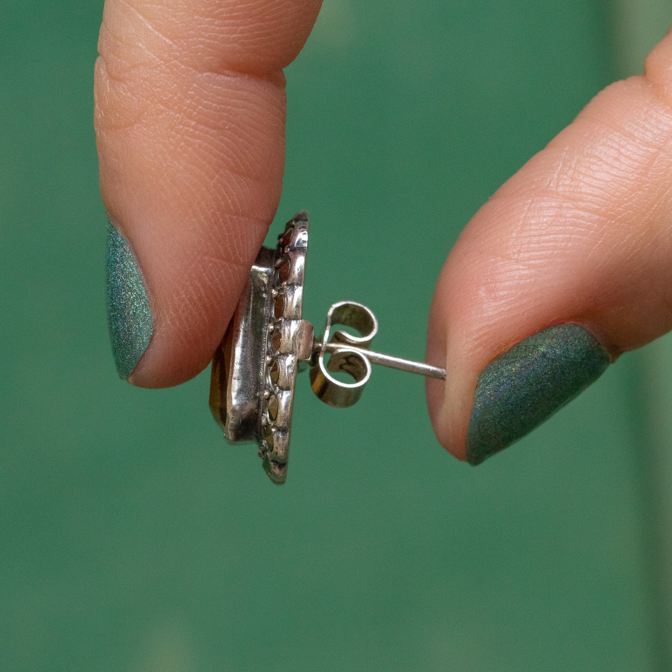 EXCELLENT. These Art Deco Silver Citrine & Marcasite stud earrings are in excellent condition. The Citrines has are set securely and are free from chips or abrasions. The Marcasite is all present and correct, and the stud backs allow you to wear these earrings with confidence. There is only one small mark of discolouration on the Silver, where these earrings have likely been previously tested.