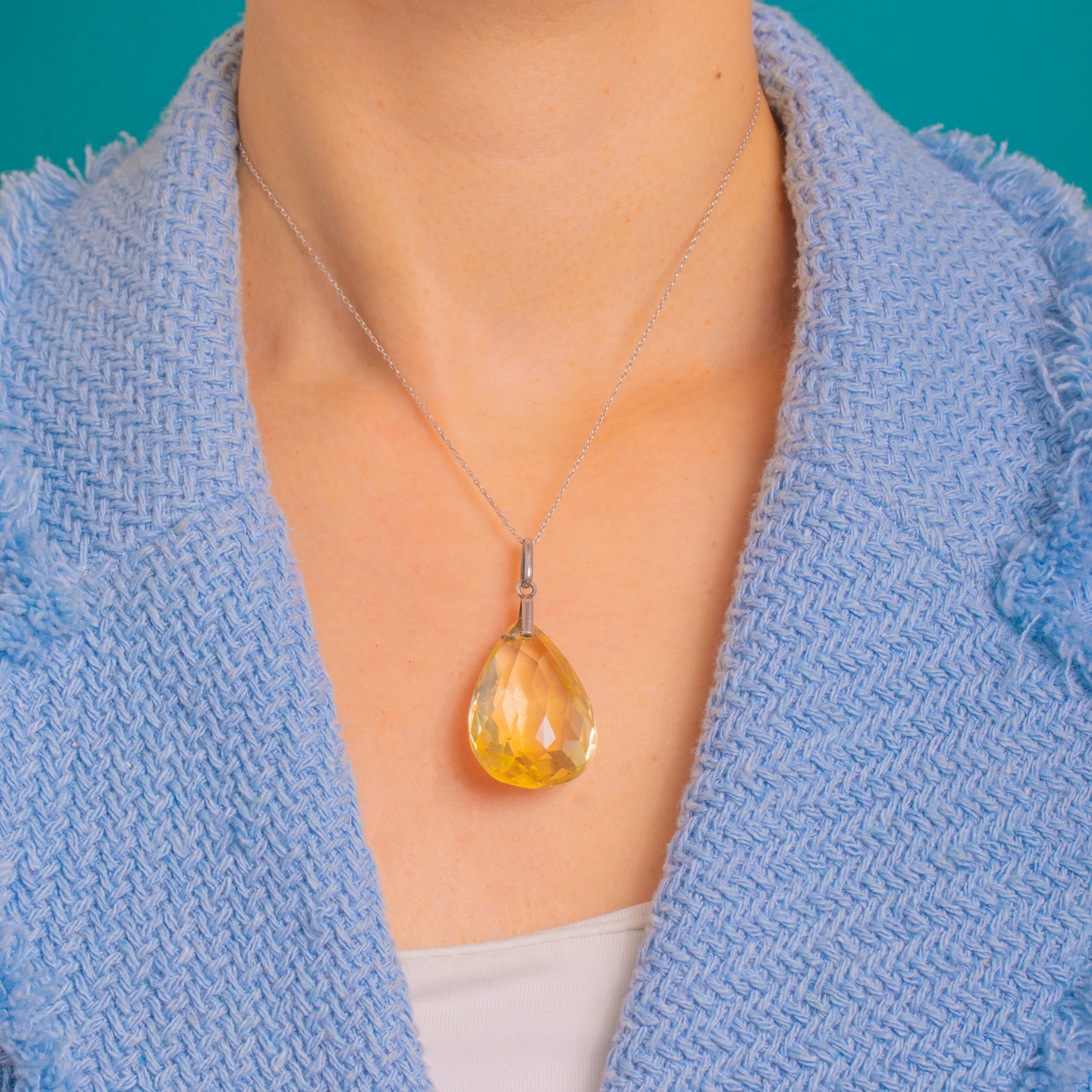 A sleek Art Deco treasure, this Silver pendant showcases a gloriously scaled 40.00ct Citrine pear drop, its crisp, uniform facets cascading with sunlit fire. The pale golden-yellow gem is beautifully open and unbacked, allowing light to dance through every plane for a luminous, refreshing glow.