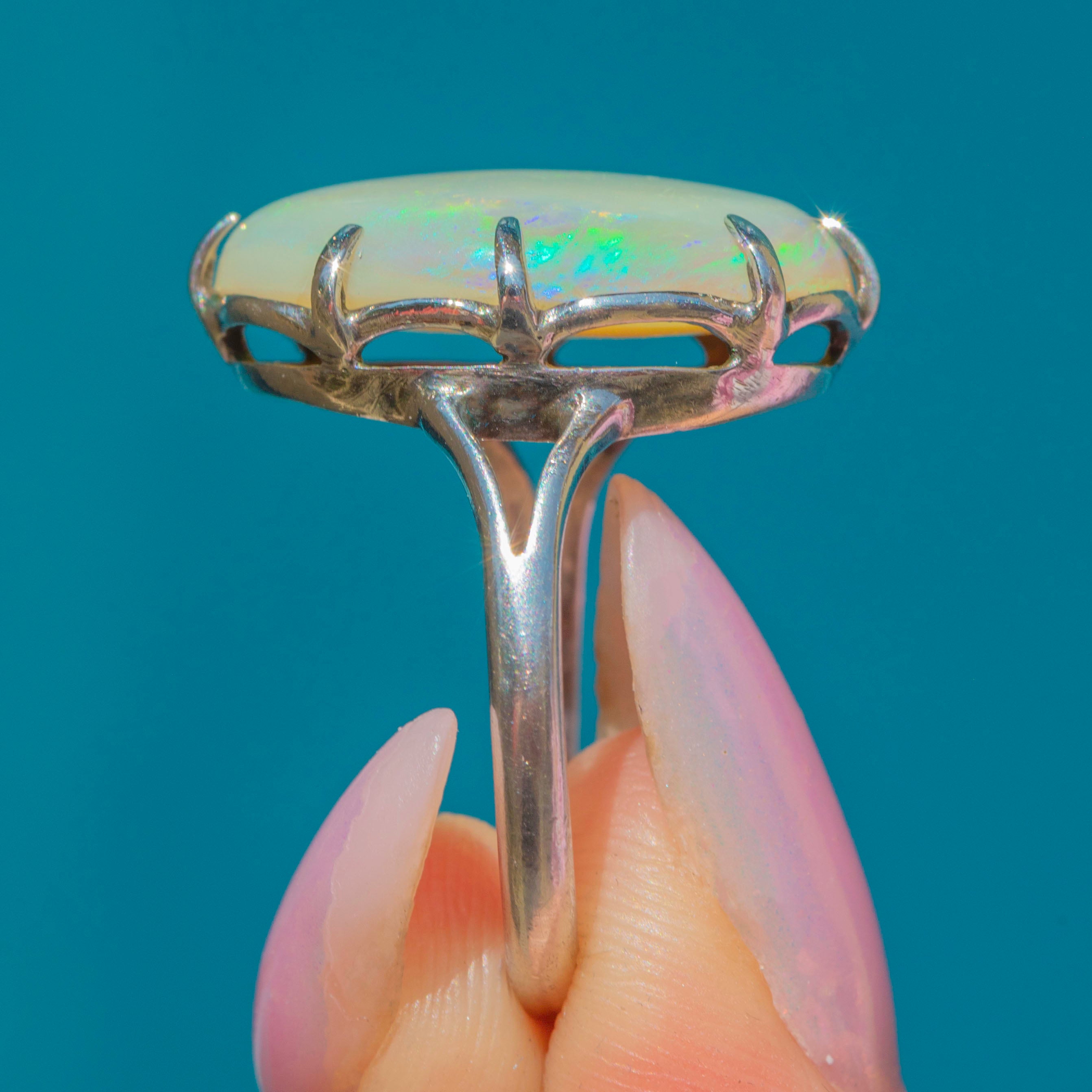 The large oval Opal is hugged by lustrous Silver claws and complete with a glossy band. Providing exceptional finger coverage, this iridescent Art Deco ring is sure to impress from every angle!