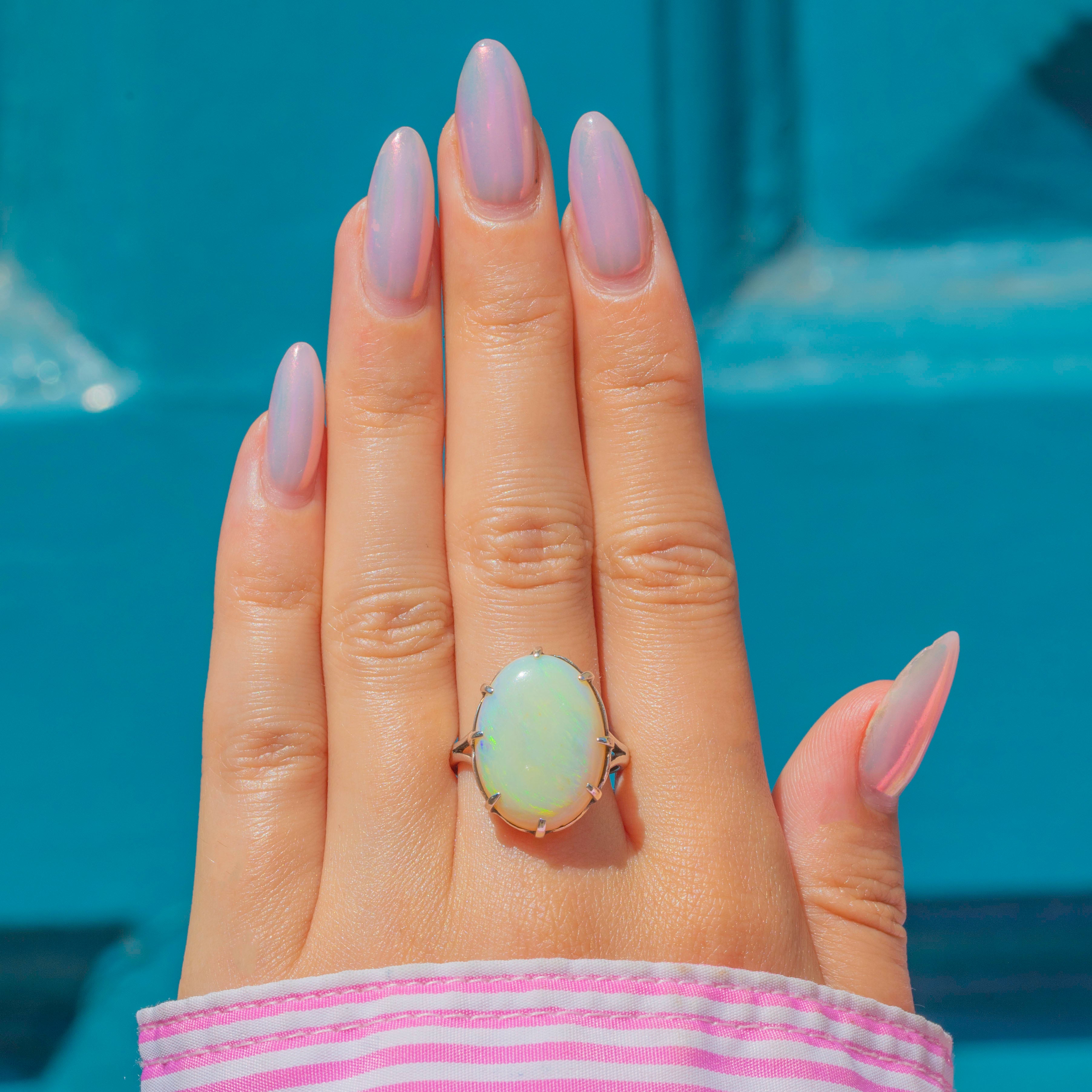Art Deco Silver Opal Cabochon Dress Ring, 4.60ct Natural Solid Opal
