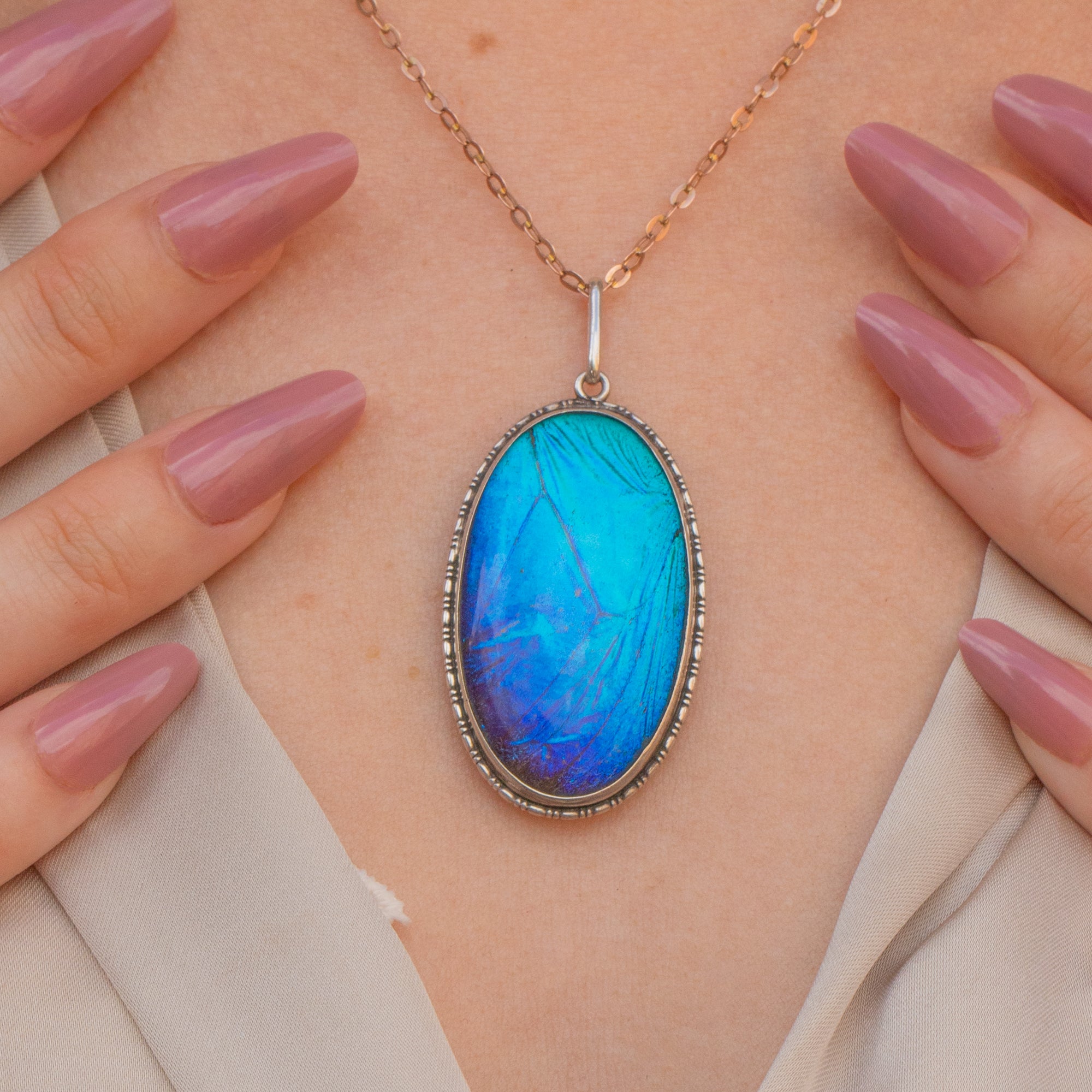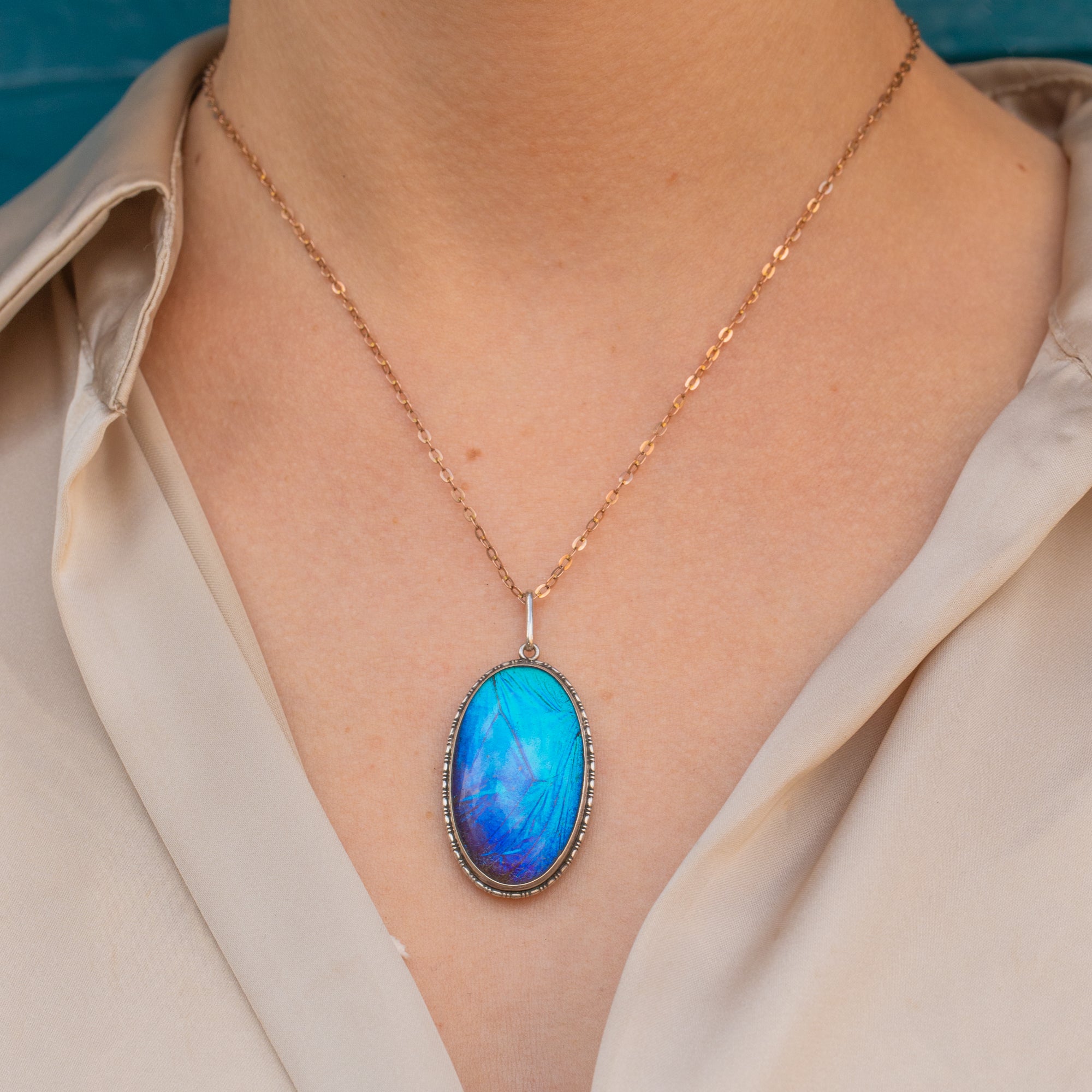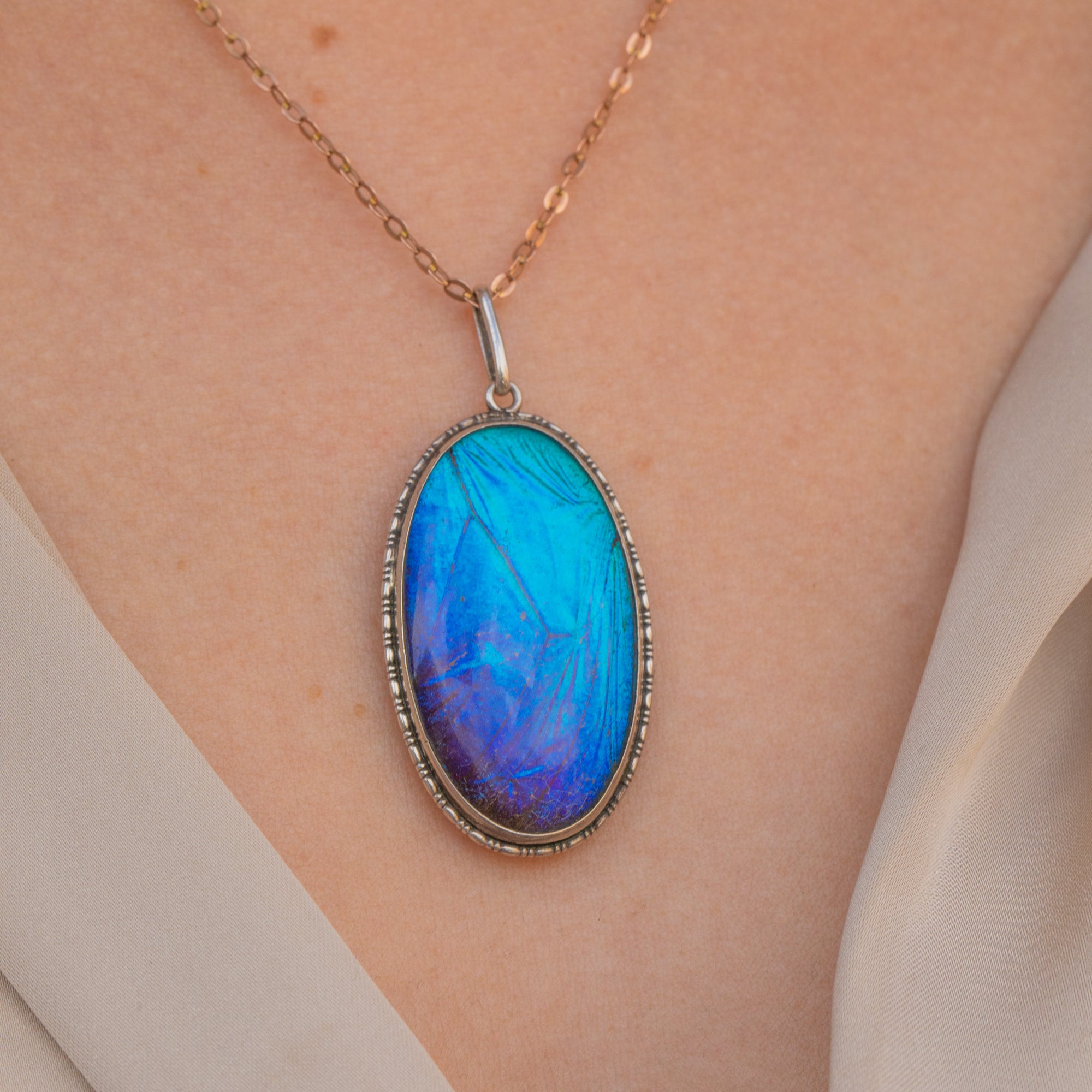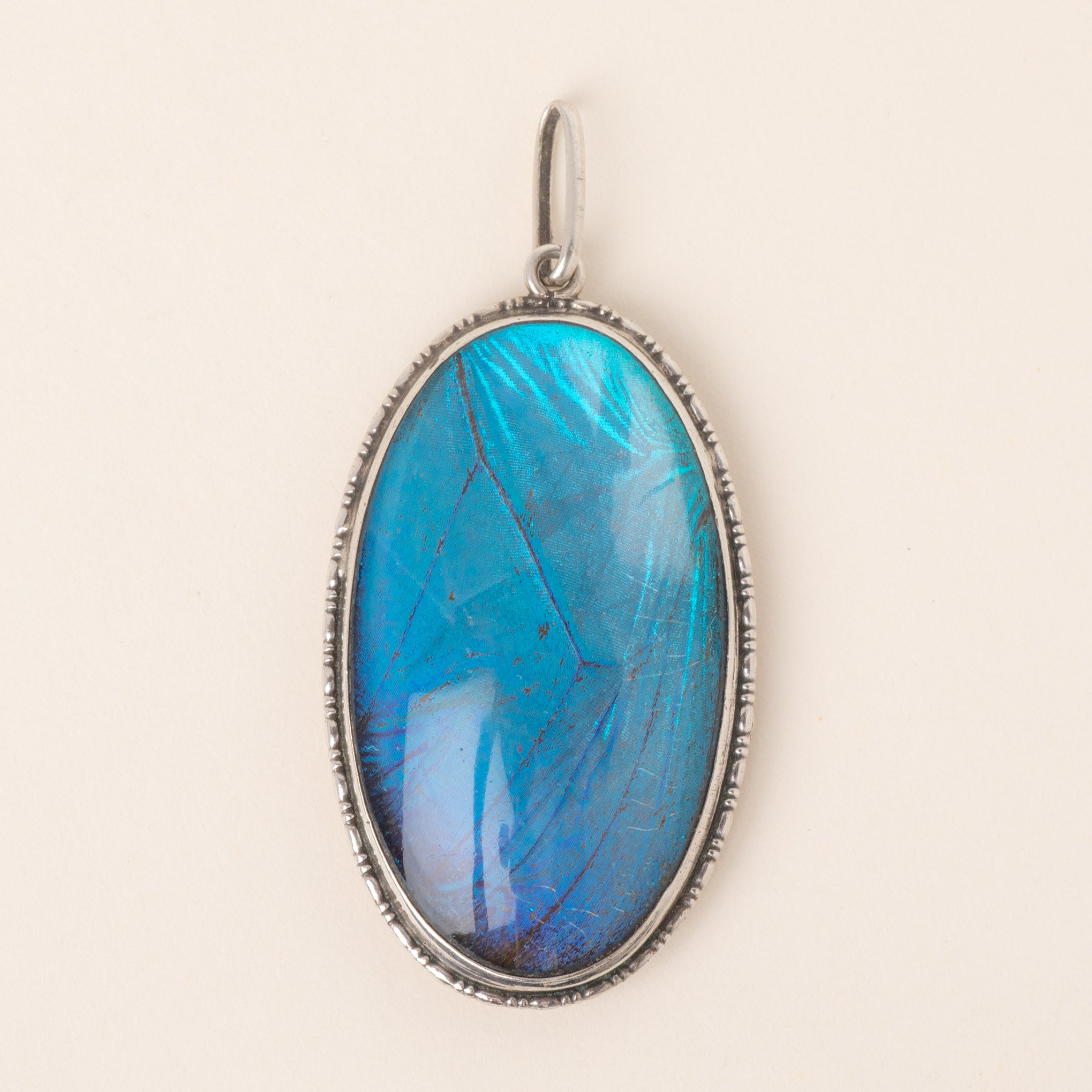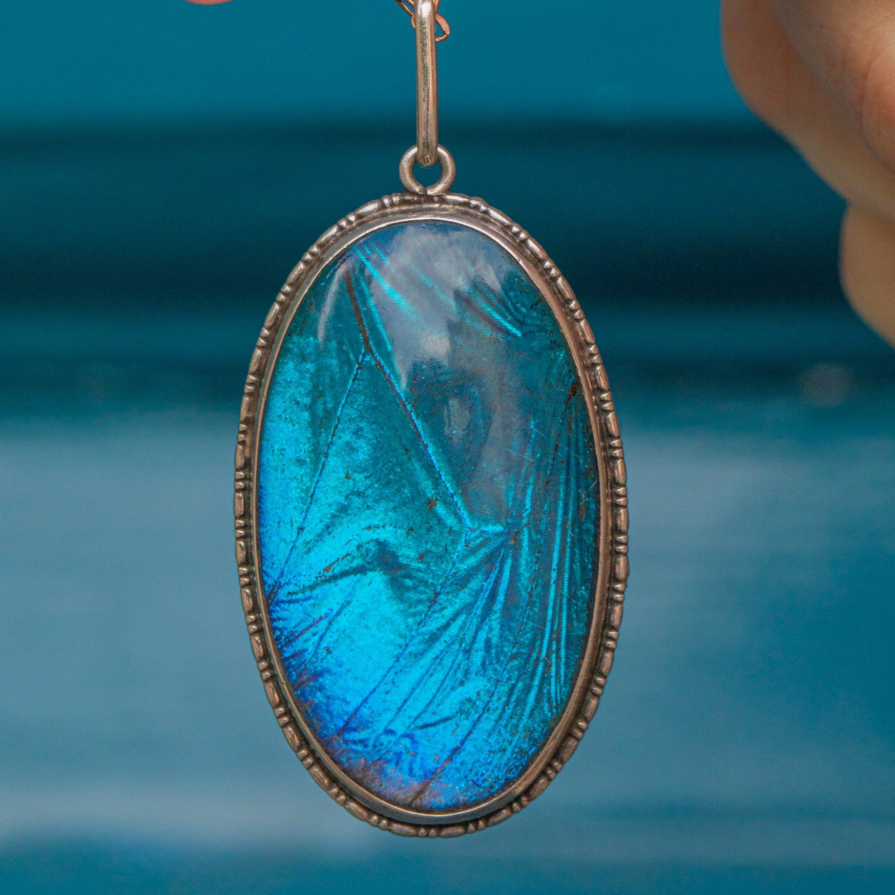 This pendant contains the neo-tropical Morpho blue butterfly wing, a species of butterfly that was native to Peru. The spectacular Butterfly wing is proudly displayed in the heart of this pendant, showcasing an array of vibrant greens and blues shimmering across the surface as she catches the light!