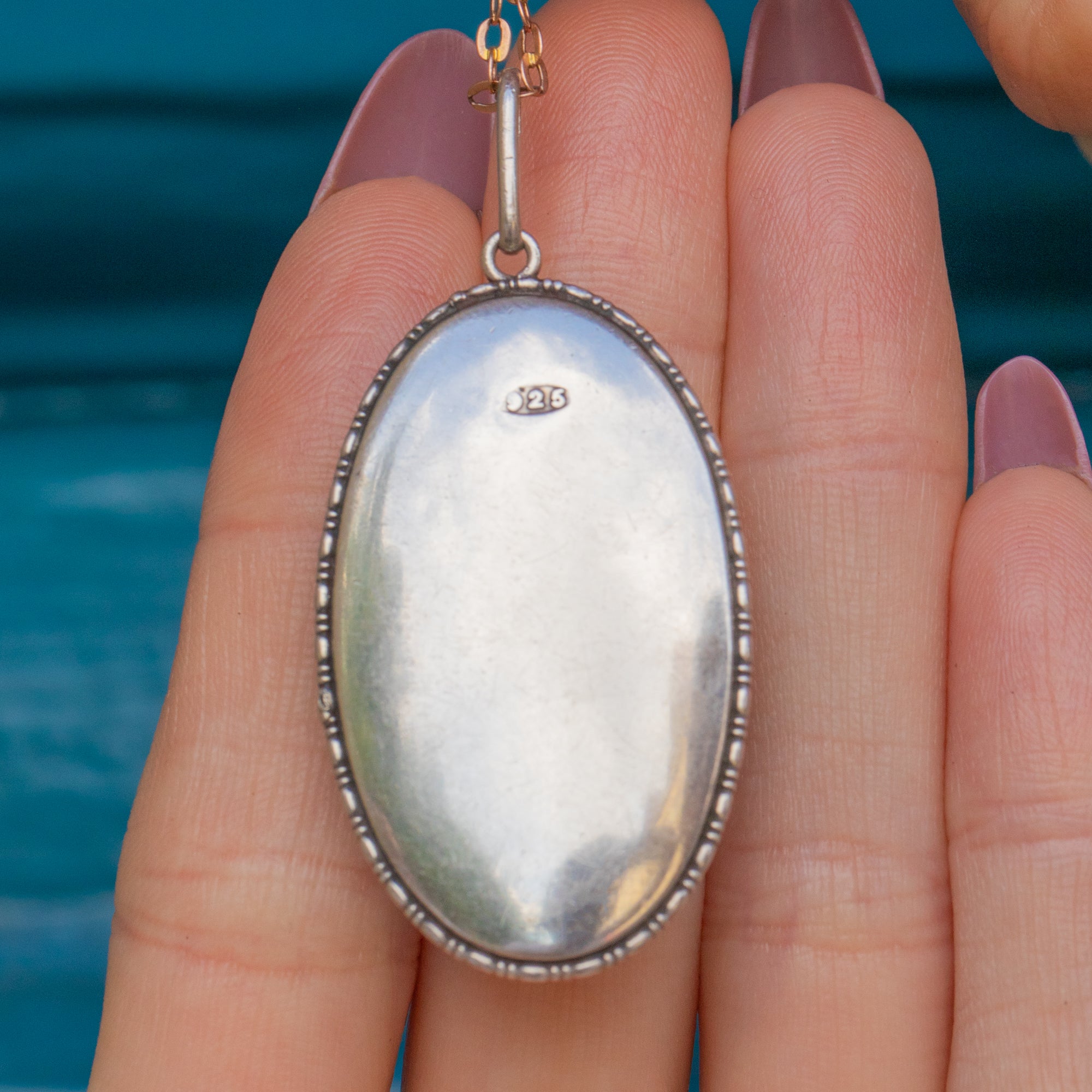 This Art Deco Silver oval Butterfly Wing pendant is an eye-catching and highly collectible treasure from the 1920s. This pendant encapsulates the era's fascination with bold, bright jewellery and "exotic" materials.