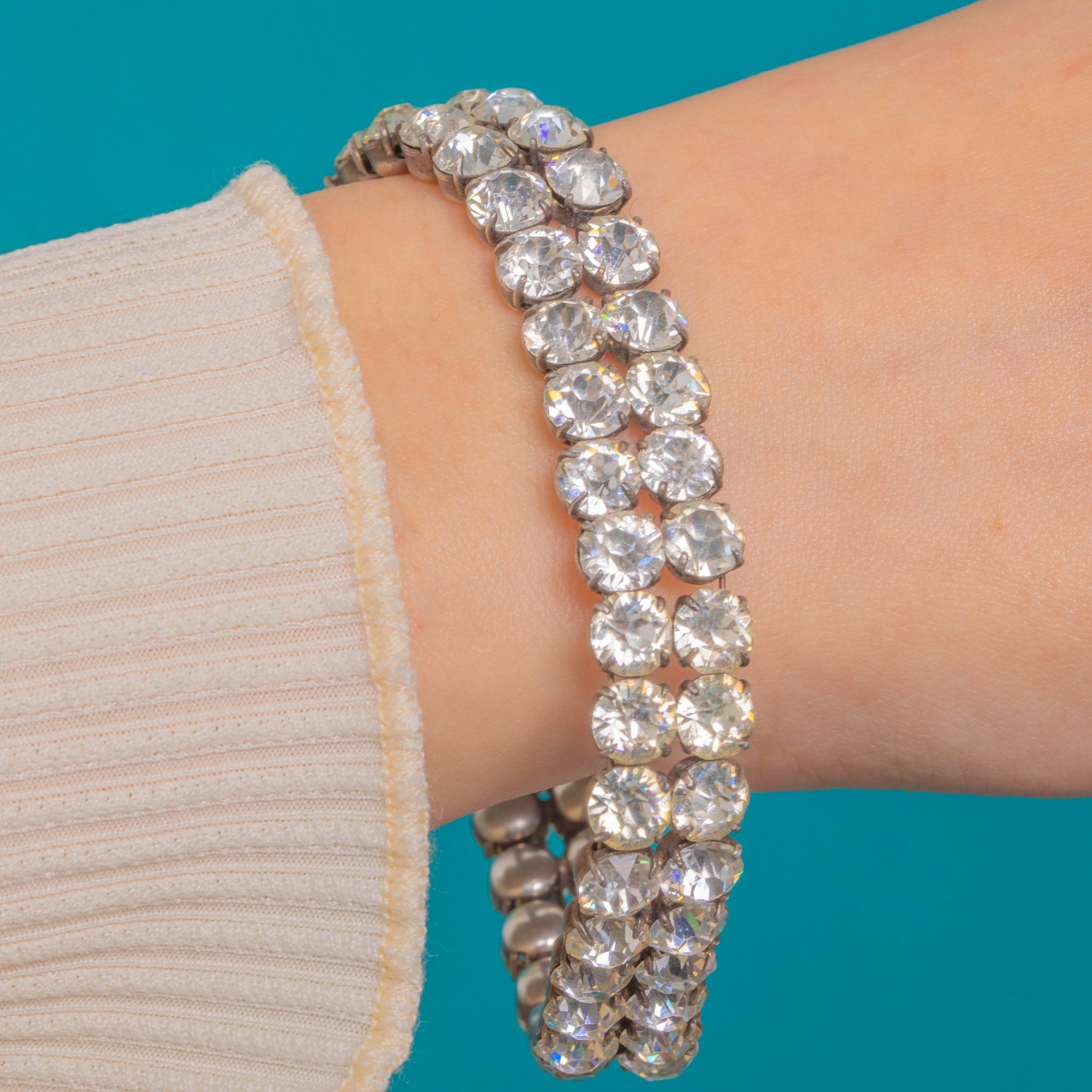 Chic, streamlined and endlessly sparkling, this Art Deco double-row bracelet captures the era’s love of precision and light. Two perfectly aligned rows of bright White Paste stones are nestled in neat, four-prong chaton settings, creating a sleek band of radiance that moves fluidly with the wrist.