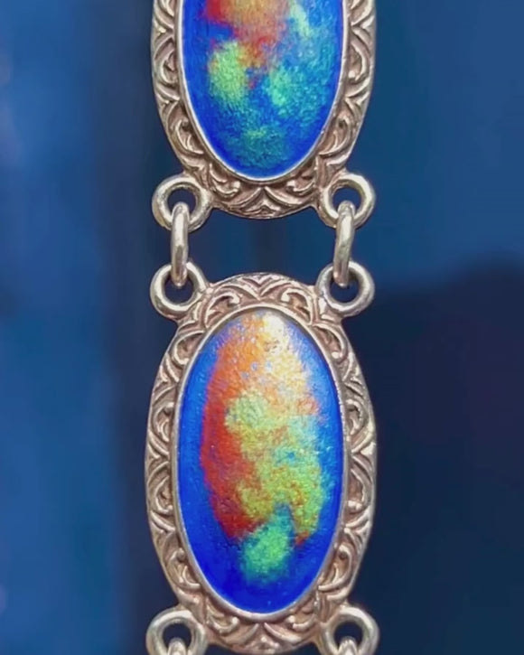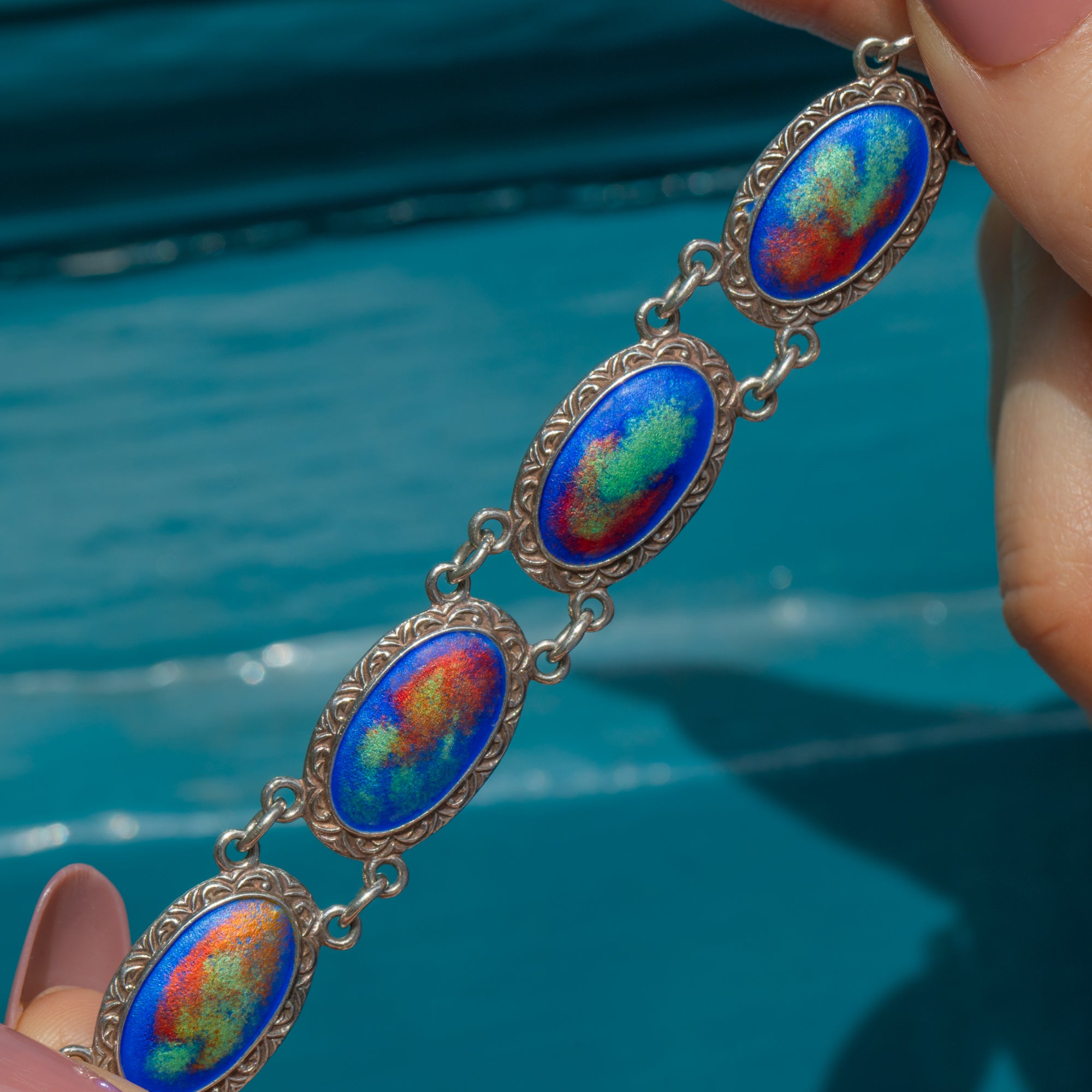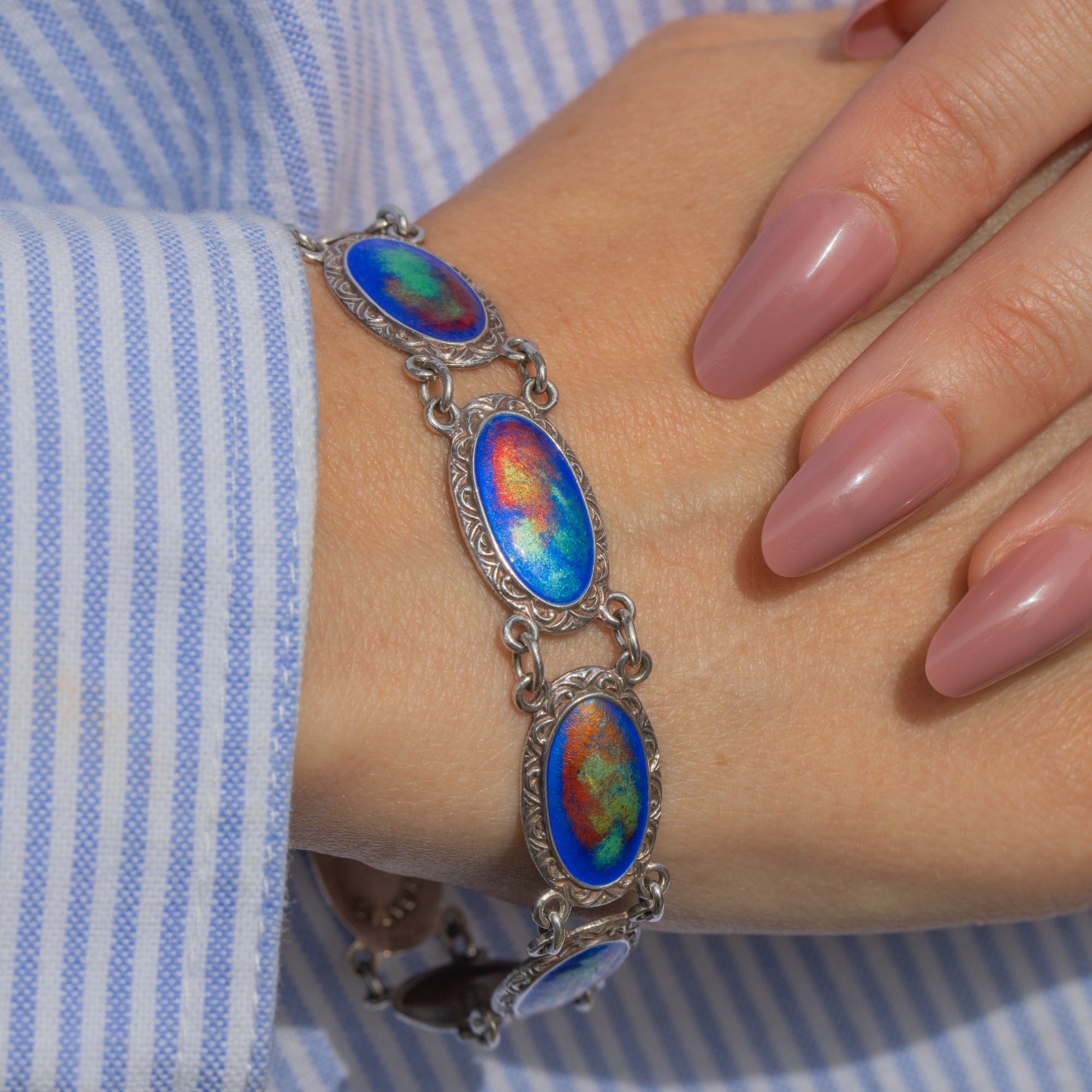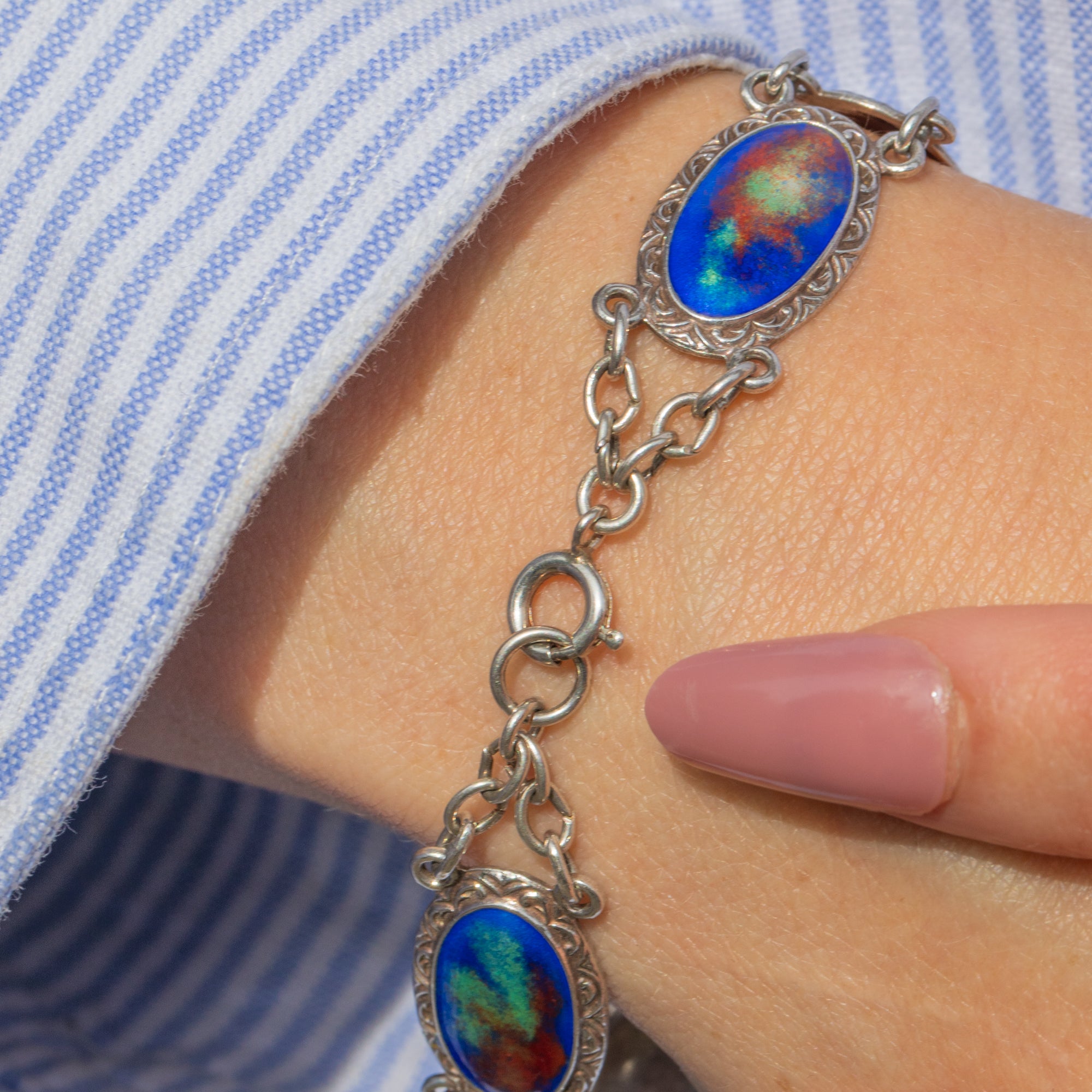 Standout from the crowd with this phenomenal Art Deco Silver peacock Enamel bracelet adorning your wrist! The 6 & 1/2 inch length is made up of ornately engraved links inlaid with vibrant Peacock Enamel that will inject a bold pop of colour into your collection.