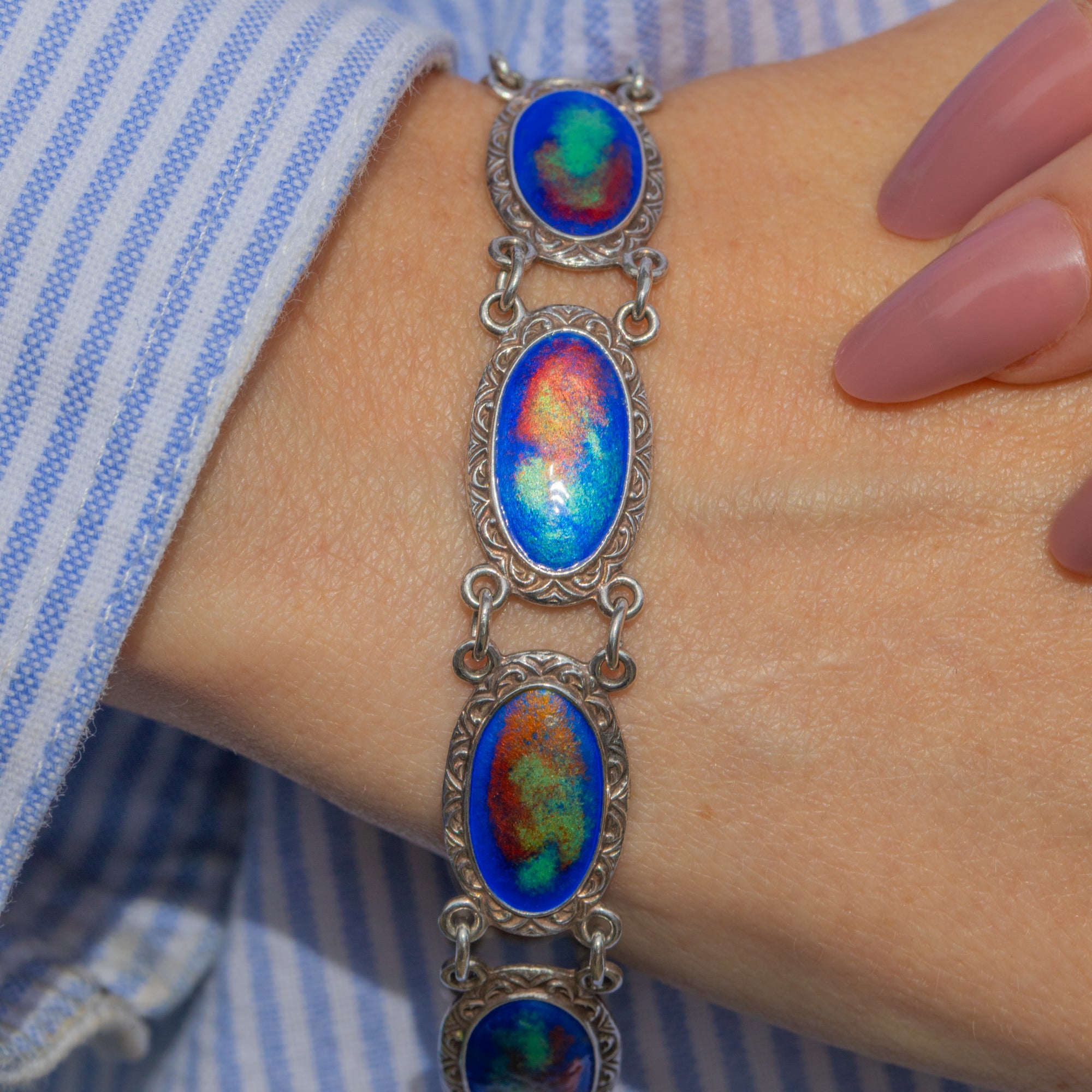 EXCELLENT. We are pleased to offer this Art Deco Silver peacock Enamel bracelet in excellent condition! The Enamel is pristine and free from chips, with vibrant hues throughout. The Silver is bright with a light patina having accrued within the details making the colours pop, each link stamped 'SILVER' on the back. The clasp is in lovely condition allowing you to wear this outstanding Deco delight with absolute confidence!