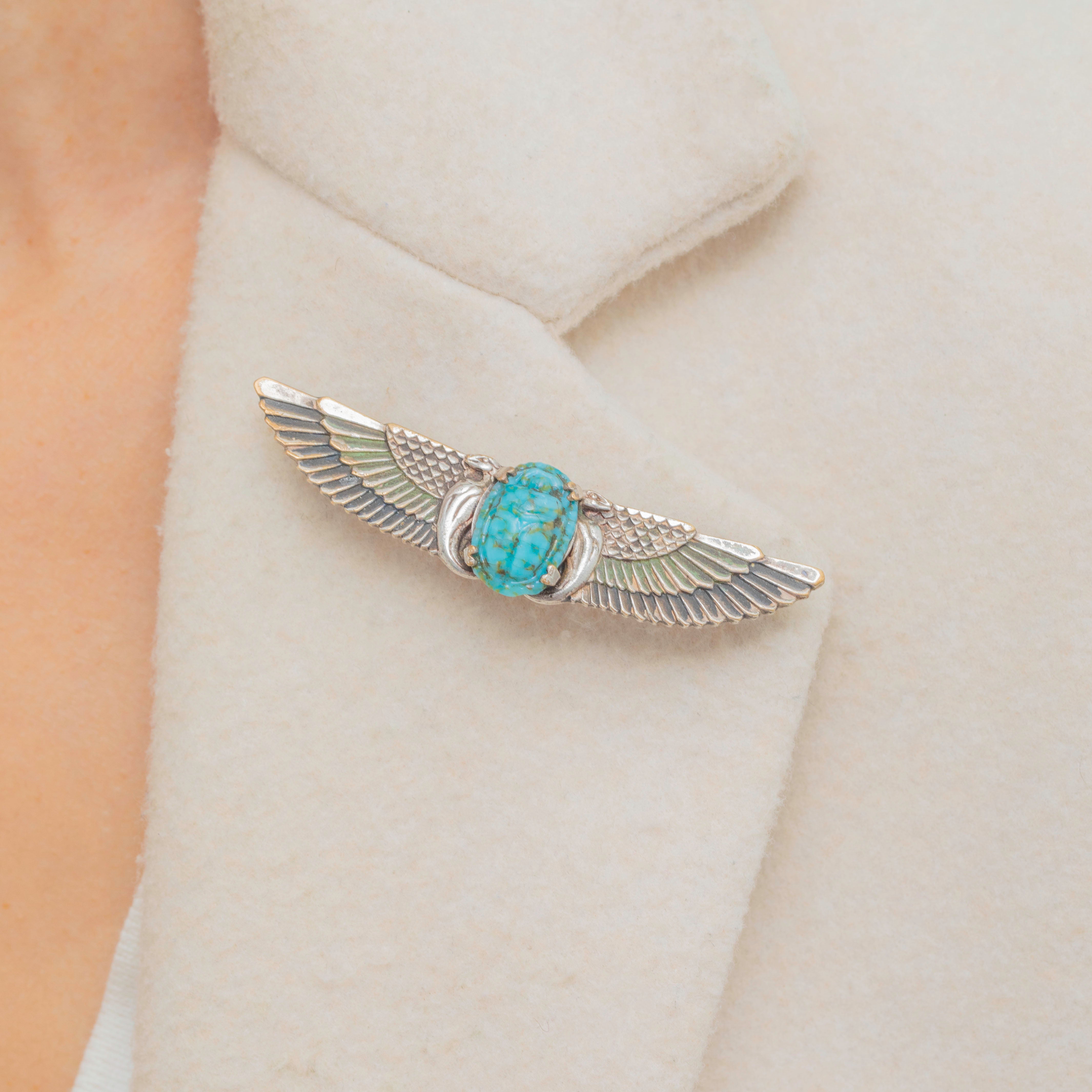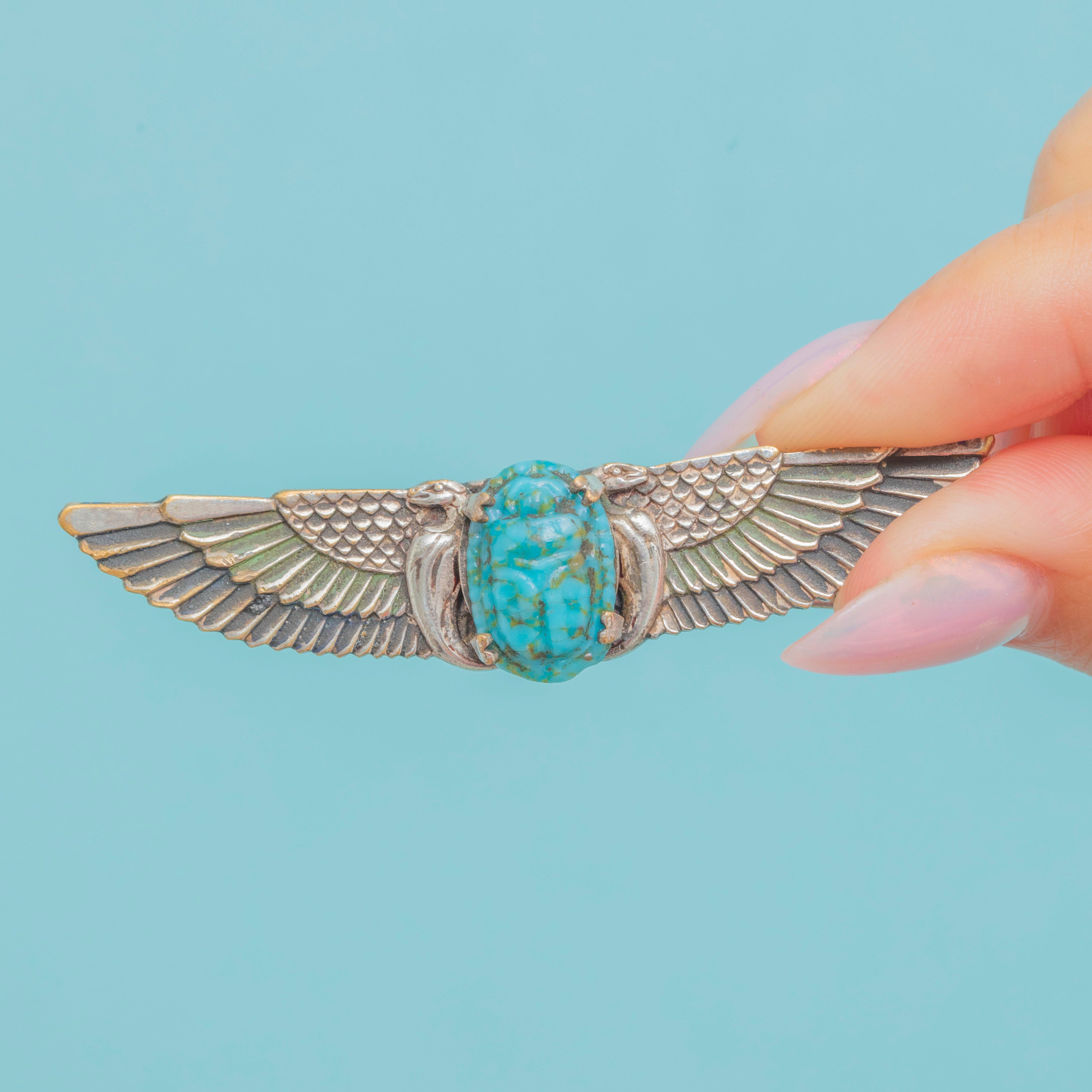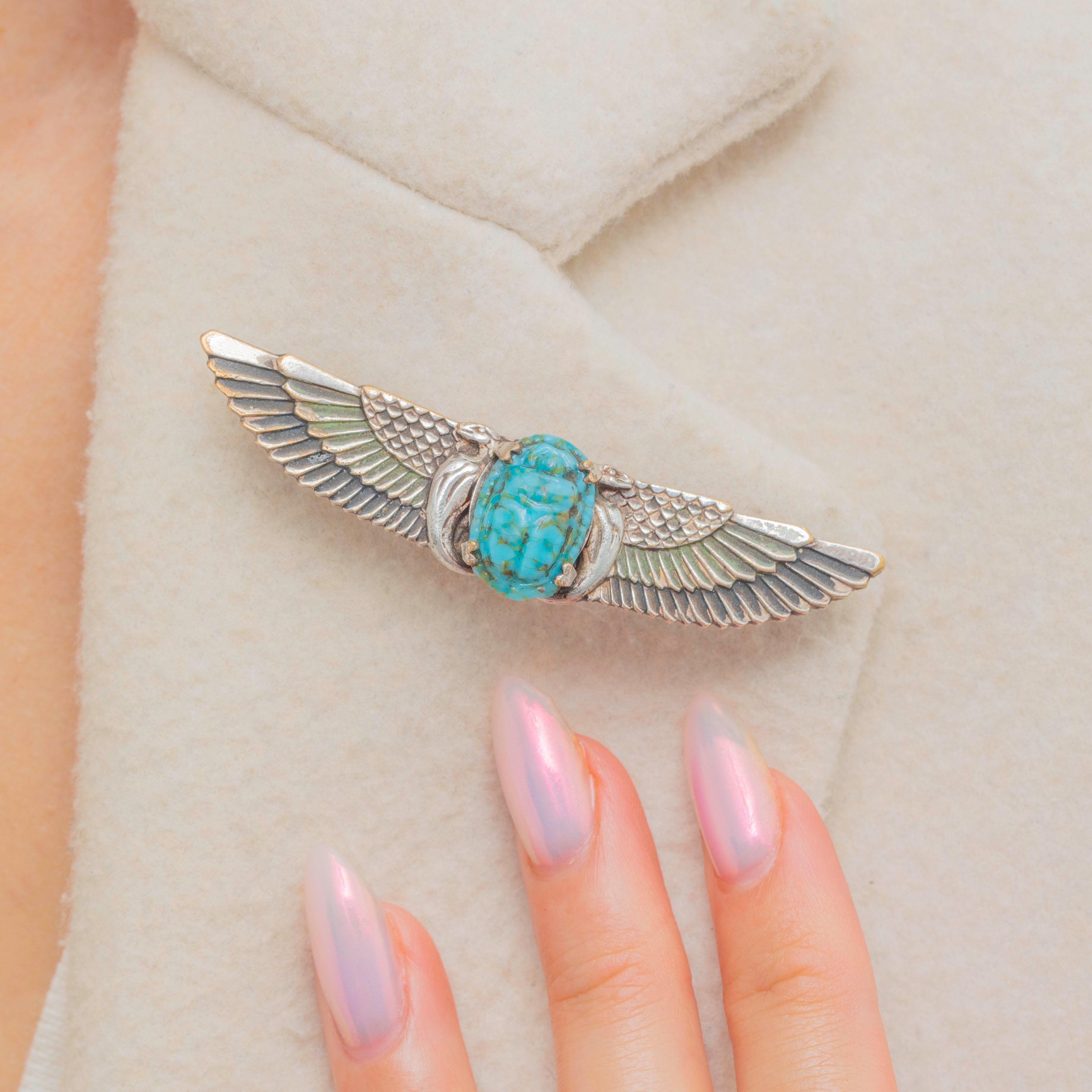 This Art Deco Silver brooch has been formed into a striking scarab beetle, symbolising protection and renewal, inspired by ancient Egyptian motifs. At the centre of the piece sits an intricately carved Turquoise stone, adding a vivid pop of colour that contrasts beautifully with the cool tones of the Silver setting.