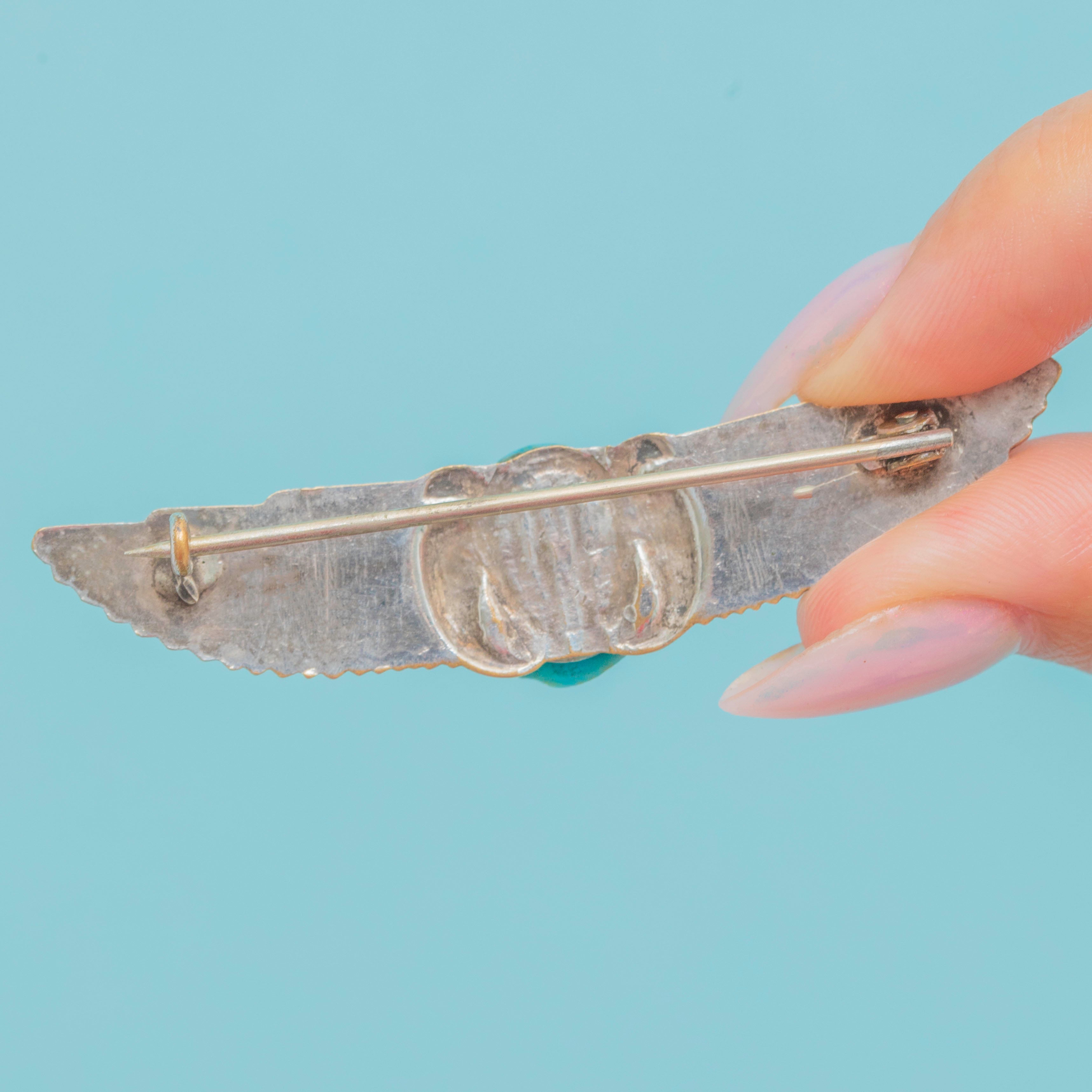 VERY GOOD: This Art Deco brooch is in very good condition, with mild surface wear consistent with age and careful use. The Silver remains well-preserved with no significant dents or scratches. The Enamel detail on the feathers of the wings has worn over time, but it still adds a lovely accent. The Turquoise is securely set with no visible surface wear. The clasp is a little loose, but still functions well. Overall, the piece presents beautifully and is ready to wear.