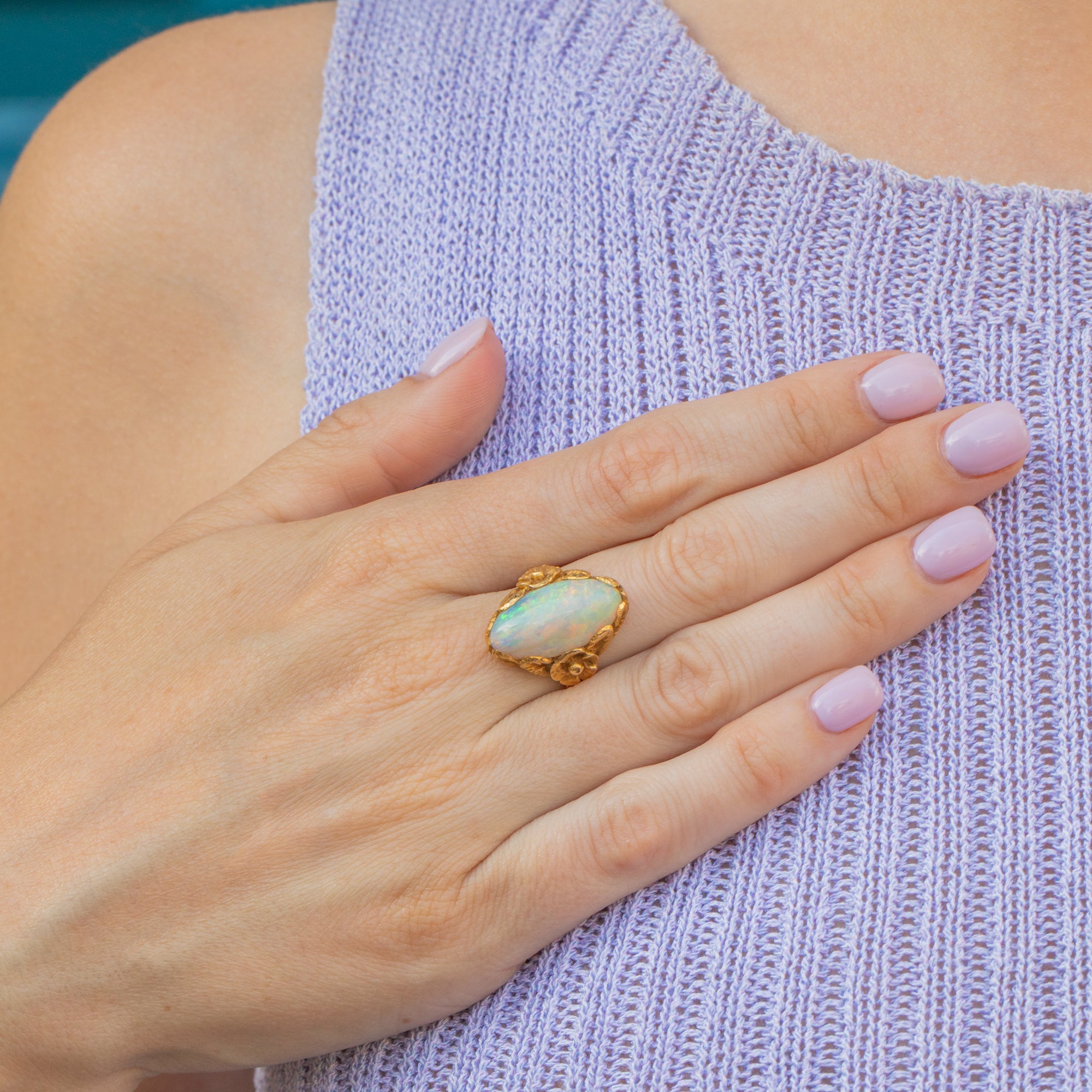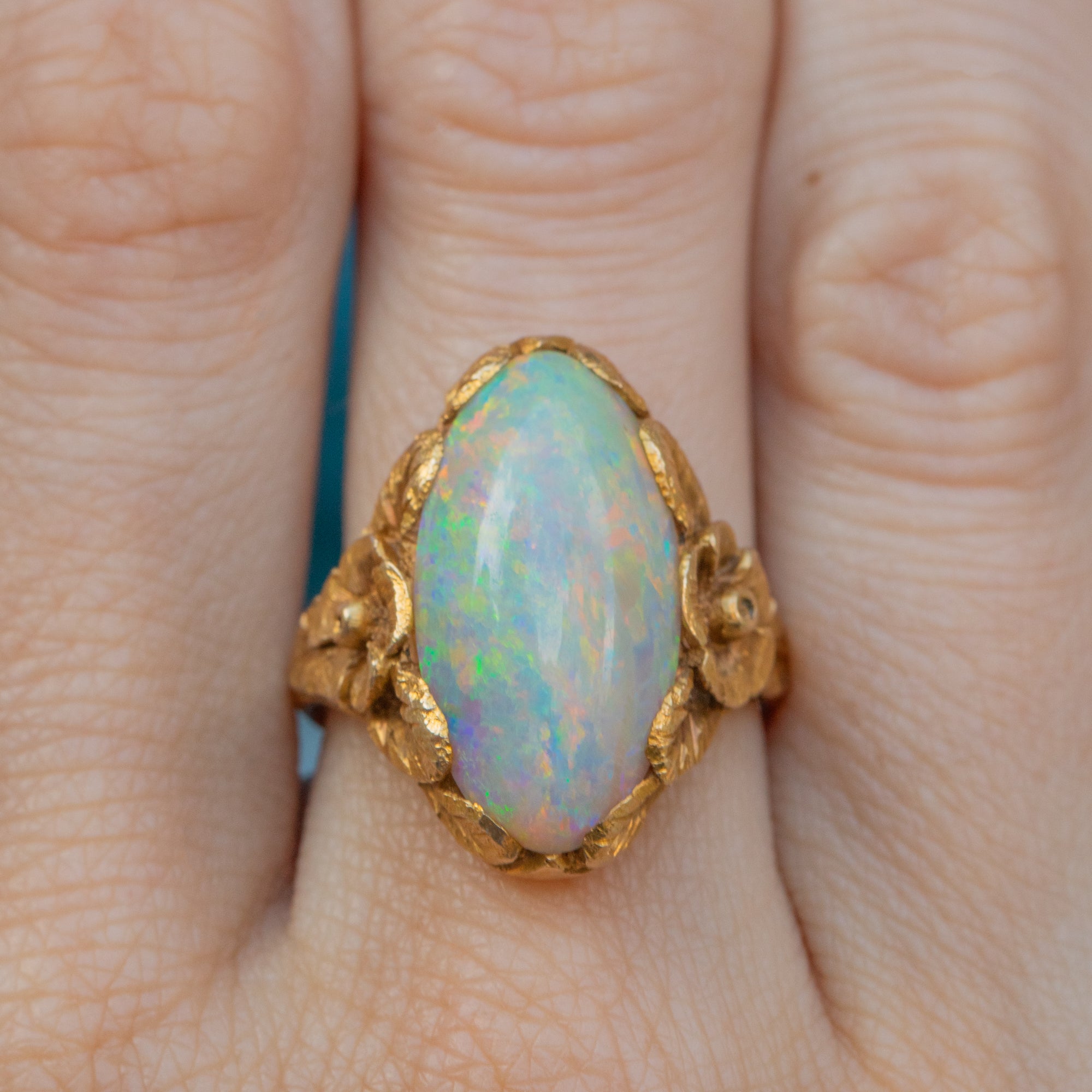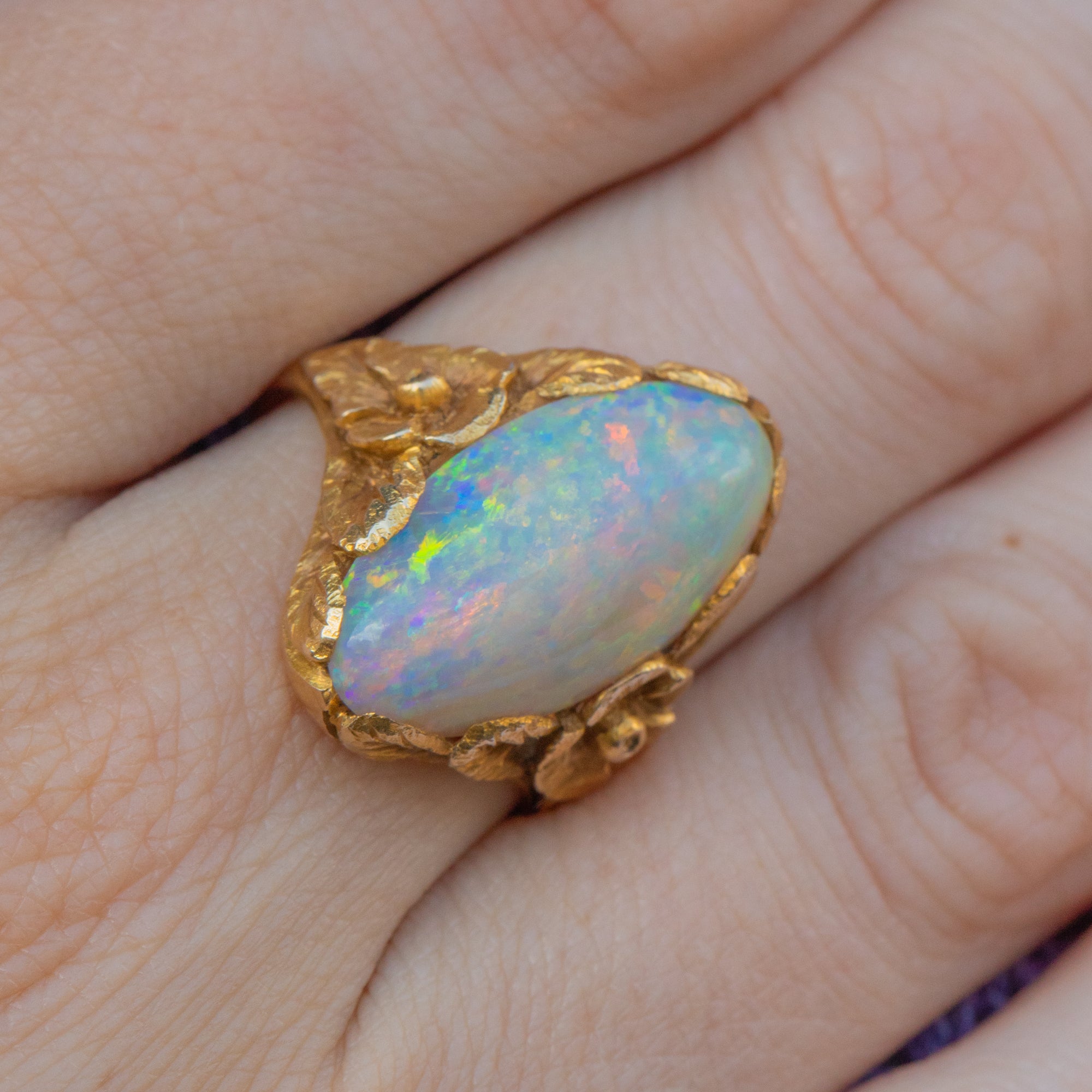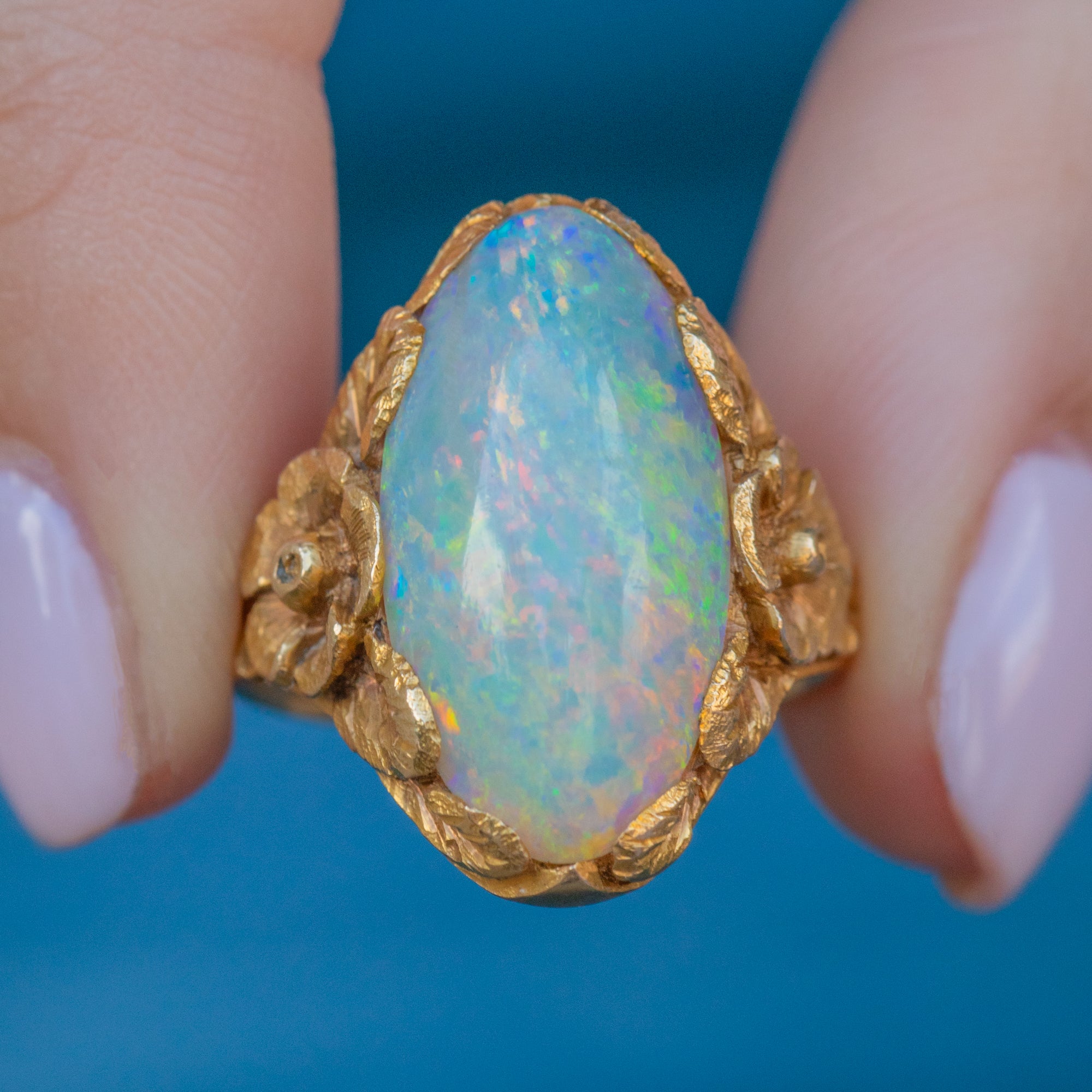 We are swooning over the sheer beauty of this Art Nouveau 15ct Gold Opal cabochon ring! Behold her 4.10ct Opal cabochon, with iridescent shimmers beyond your imagination, possessing a captivating beauty you will never tire of.
