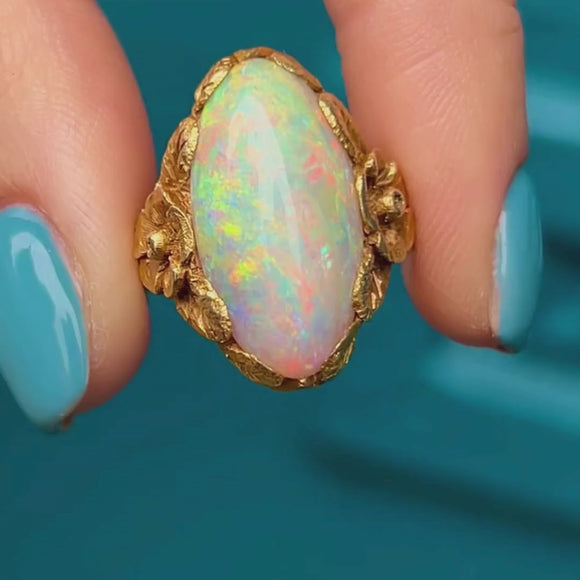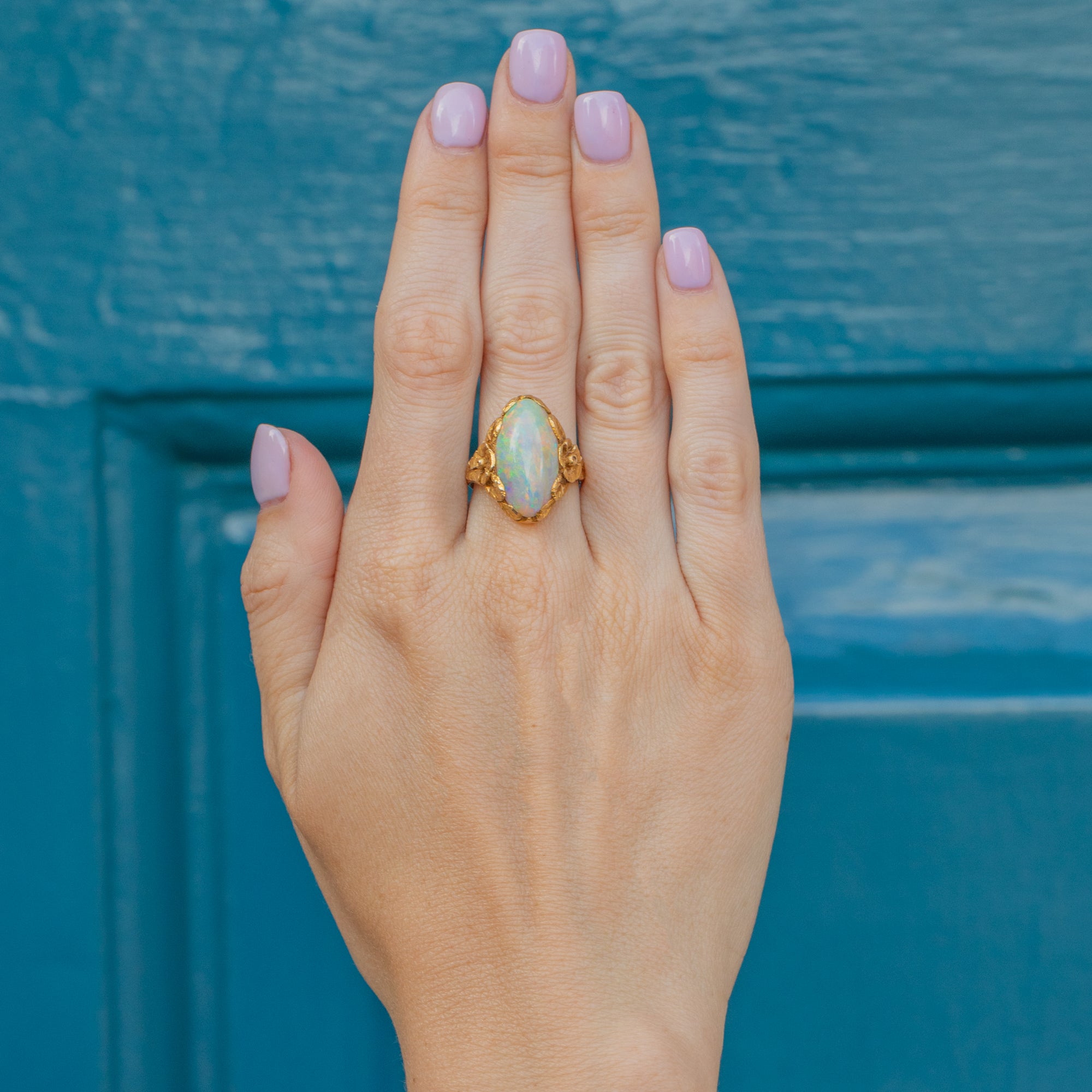 EXCELLENT. We are pleased to present this Art Nouveau 15ct Gold Opal cabochon ring in excellent condition. Her Opal sits securely with a fiery play of colour for you to enjoy for many more years to come. The floral details are crisp and gracefully engraved, bringing the admirable Art Nouveau feel to this Opal ring. The ring band is smooth to the touch and wears comfortably. There's no doubt this antique Opal ring will catch the eye of any onlooker!