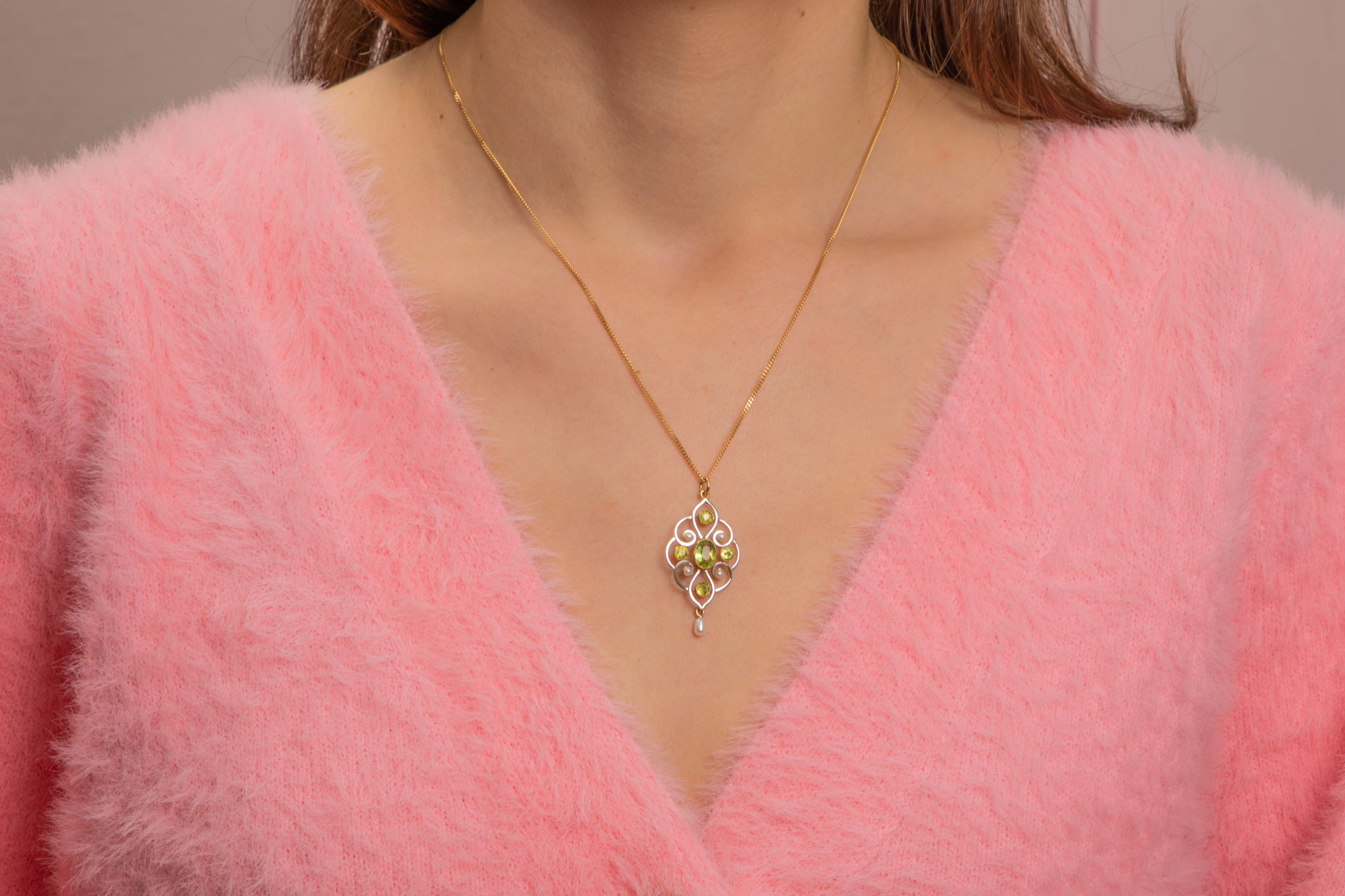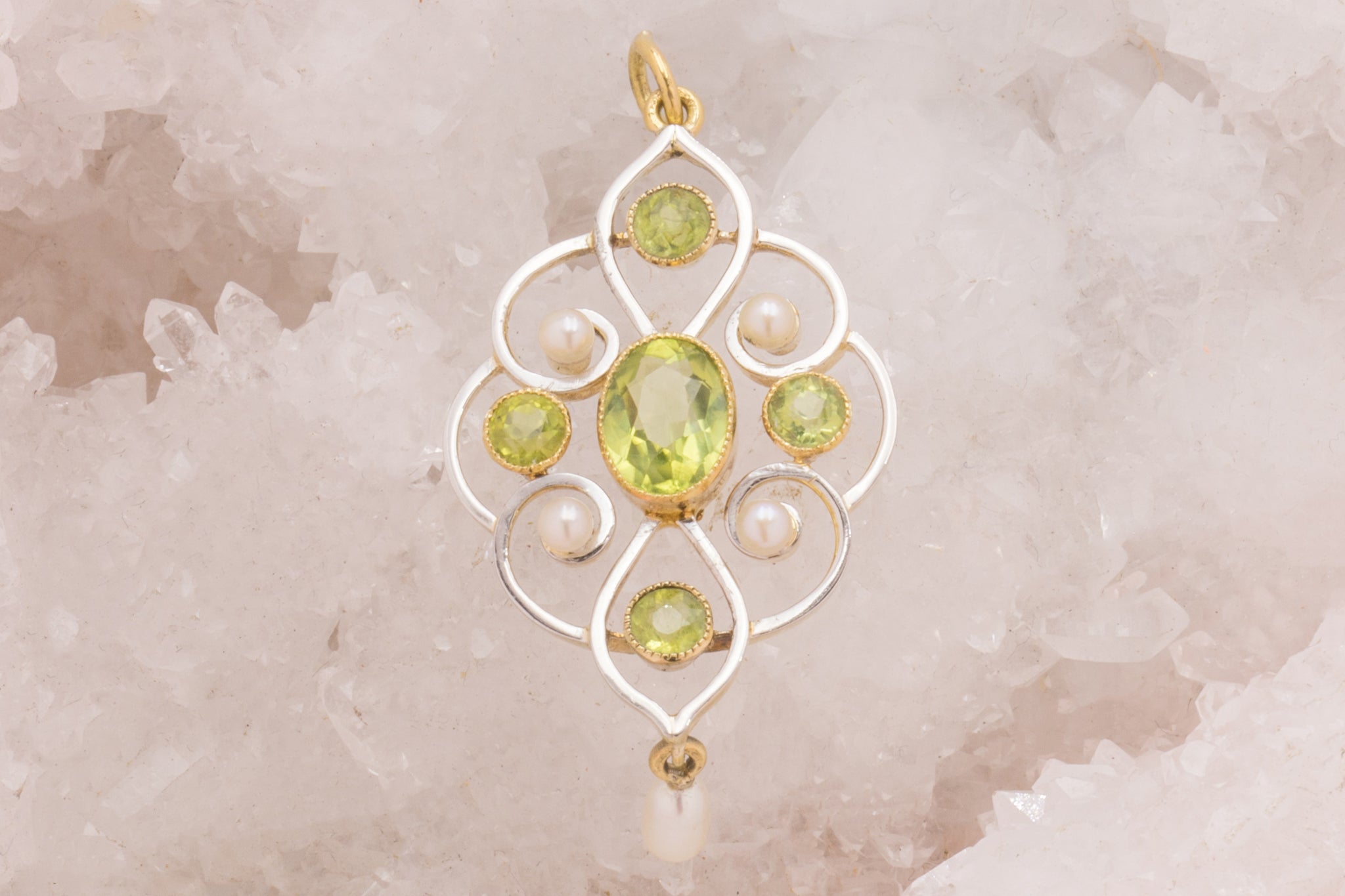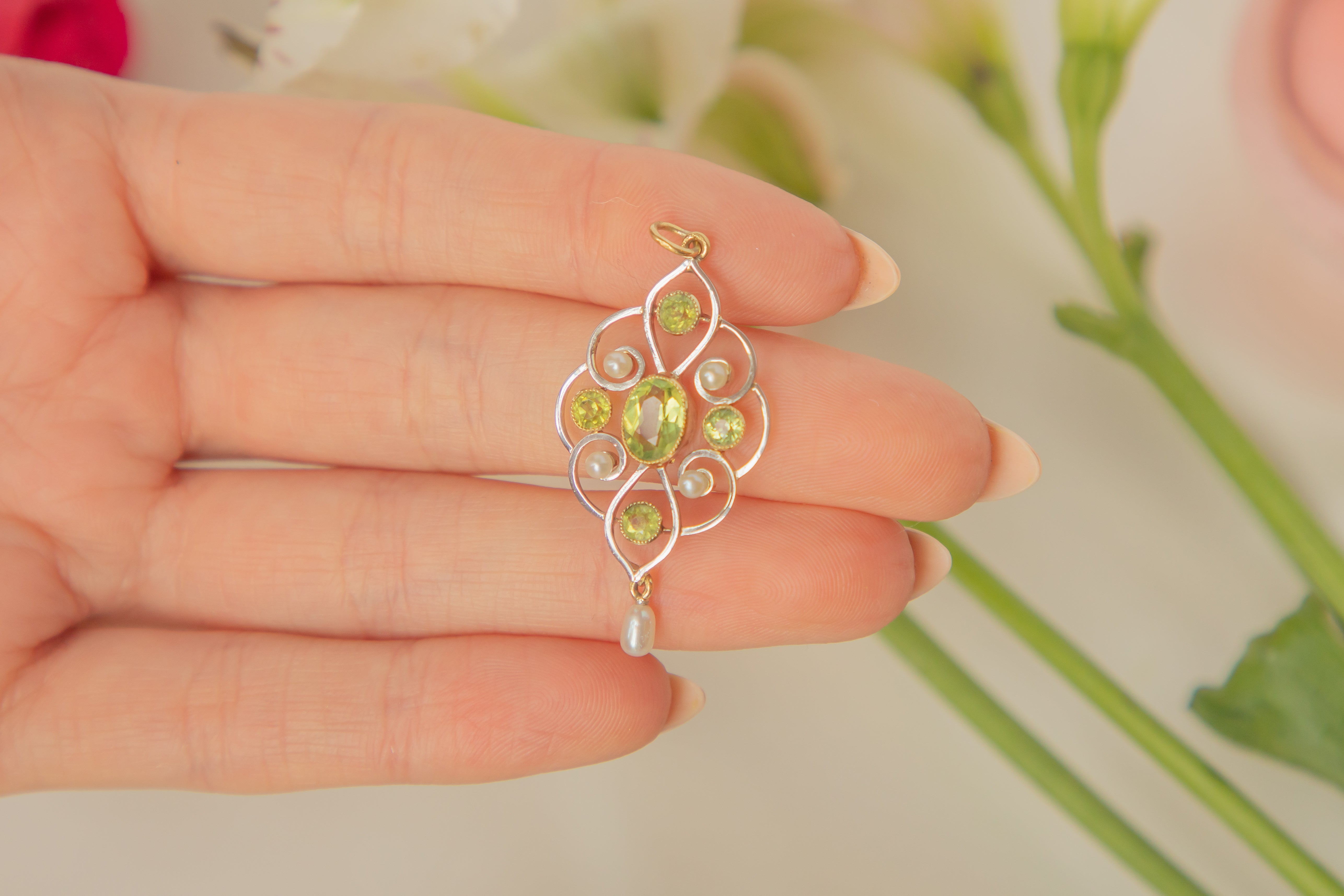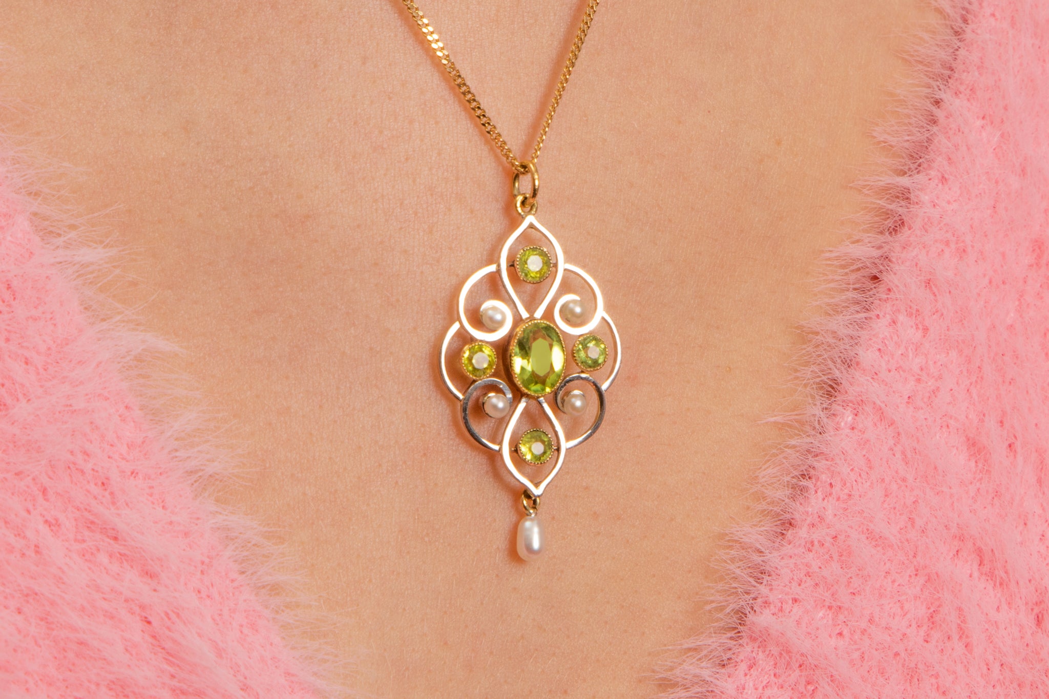 This Art Nouveau 15ct Gold Pearl Peridot Drop Pendant is a captivating piece that exudes elegance and sophistication! Crafted with meticulous attention to detail, this antique pendant features five vibrant Peridot flanked by four luminous pearls, placed with precision between her ornate body.