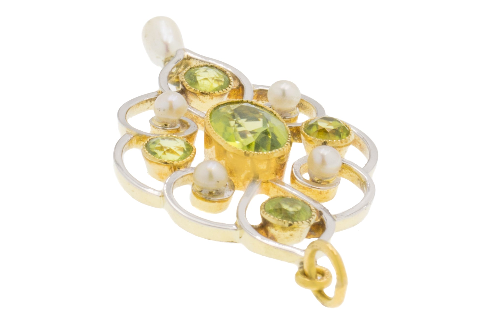 MATERIALS: Tests as 15ct Yellow Gold with a layer of 15ct White Gold on the front, Pearl, Peridot (1.00ct).