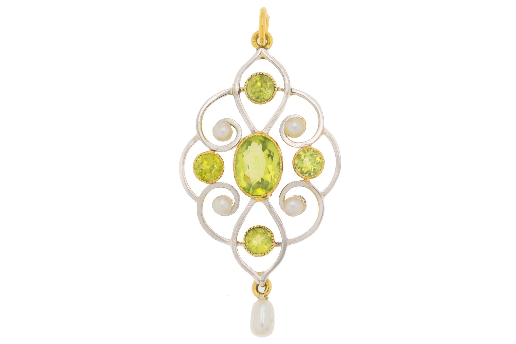 Art Nouveau 15ct Gold Pearl Peridot Drop Pendant, 1.00ct