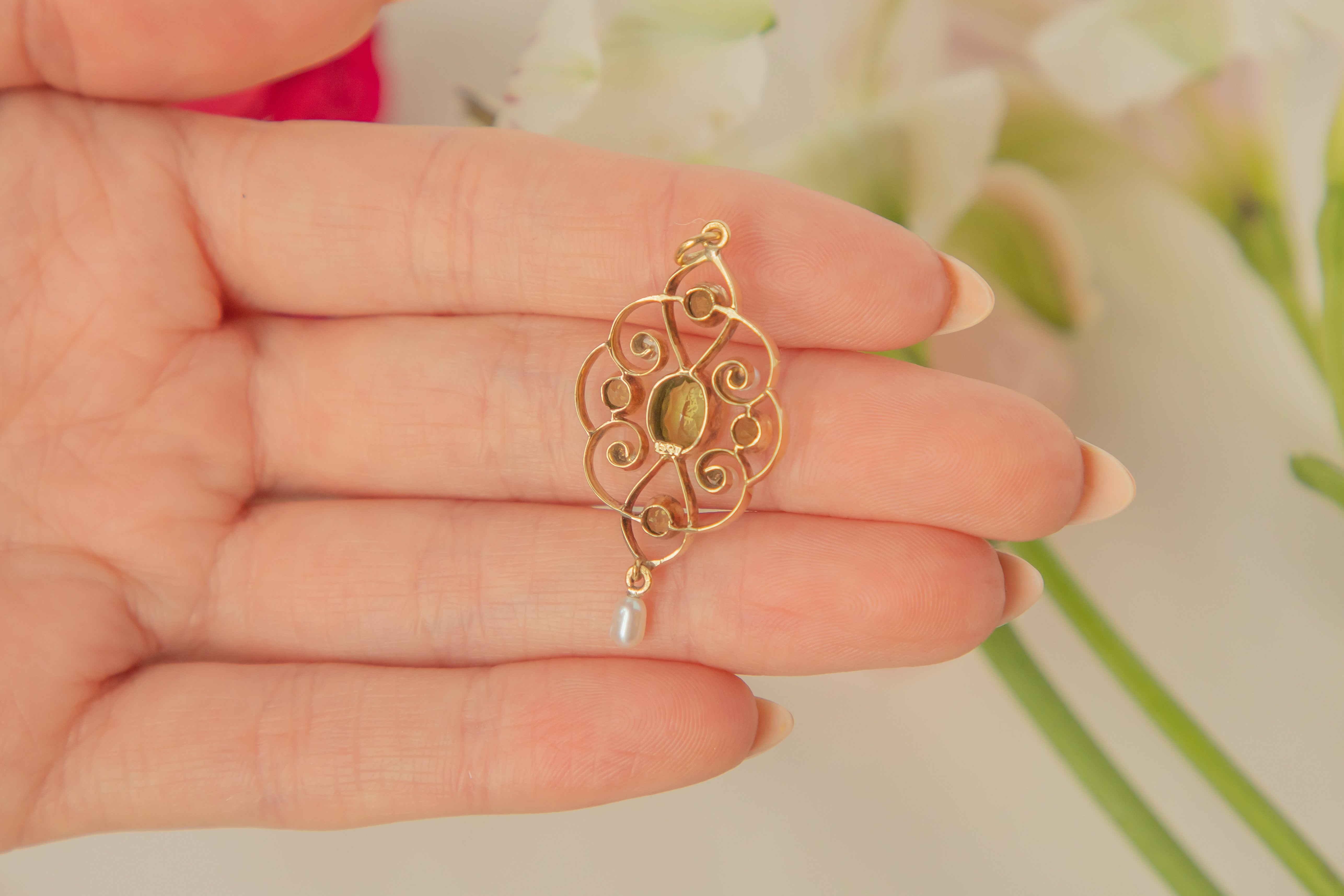 EXCELLENT. This Art Nouveau 15ct Gold Pearl Peridot drop pendant is just delightful. In excellent condition overall, this pendant features vibrant lime green Peridot stones and gorgeous Pearls, all securely set and free from any signs of wear. The 15ct Gold is simply divine, and the shape has kept impeccably well. There is little to no wear to the pendant overall, and there is a discreet antique hallmark on the back!