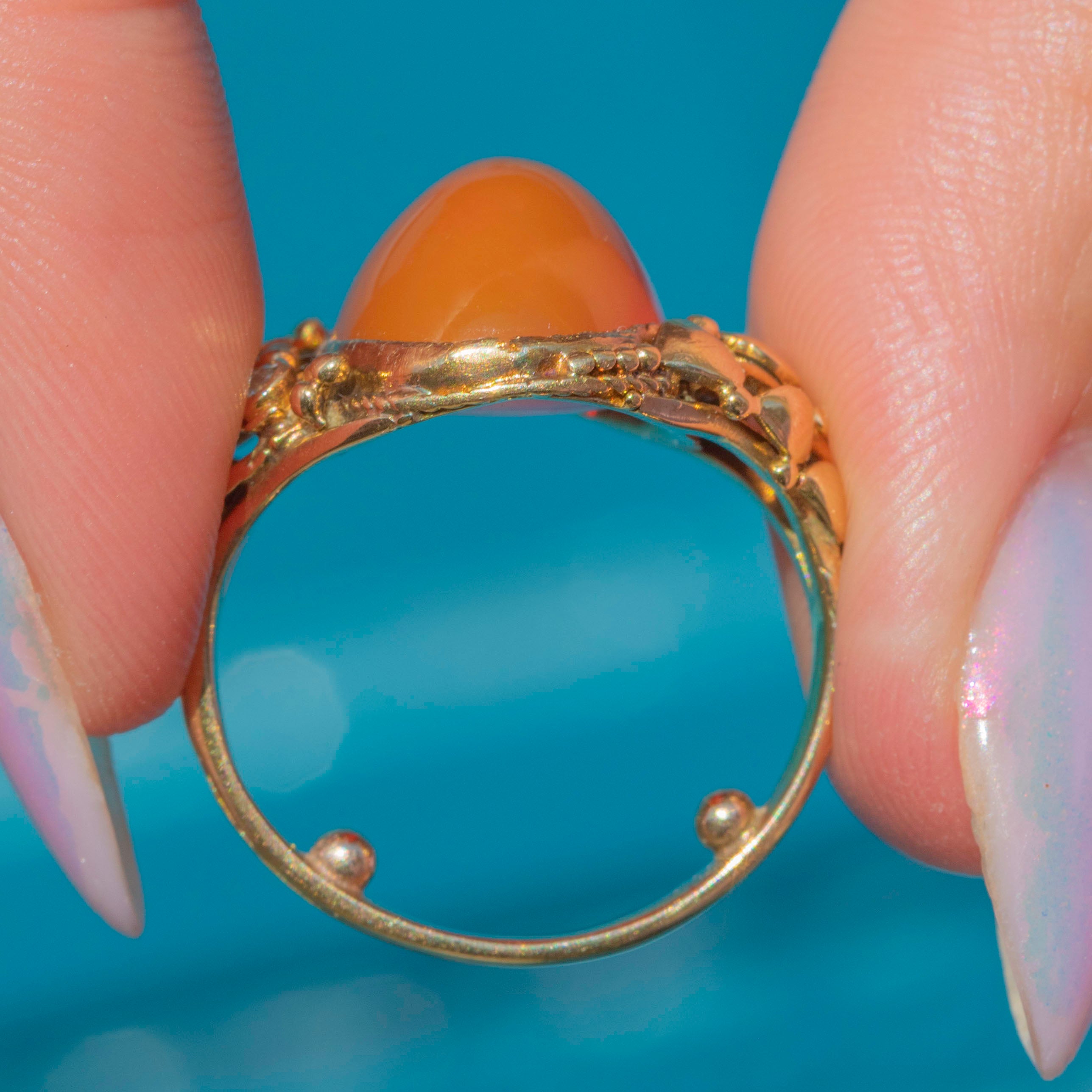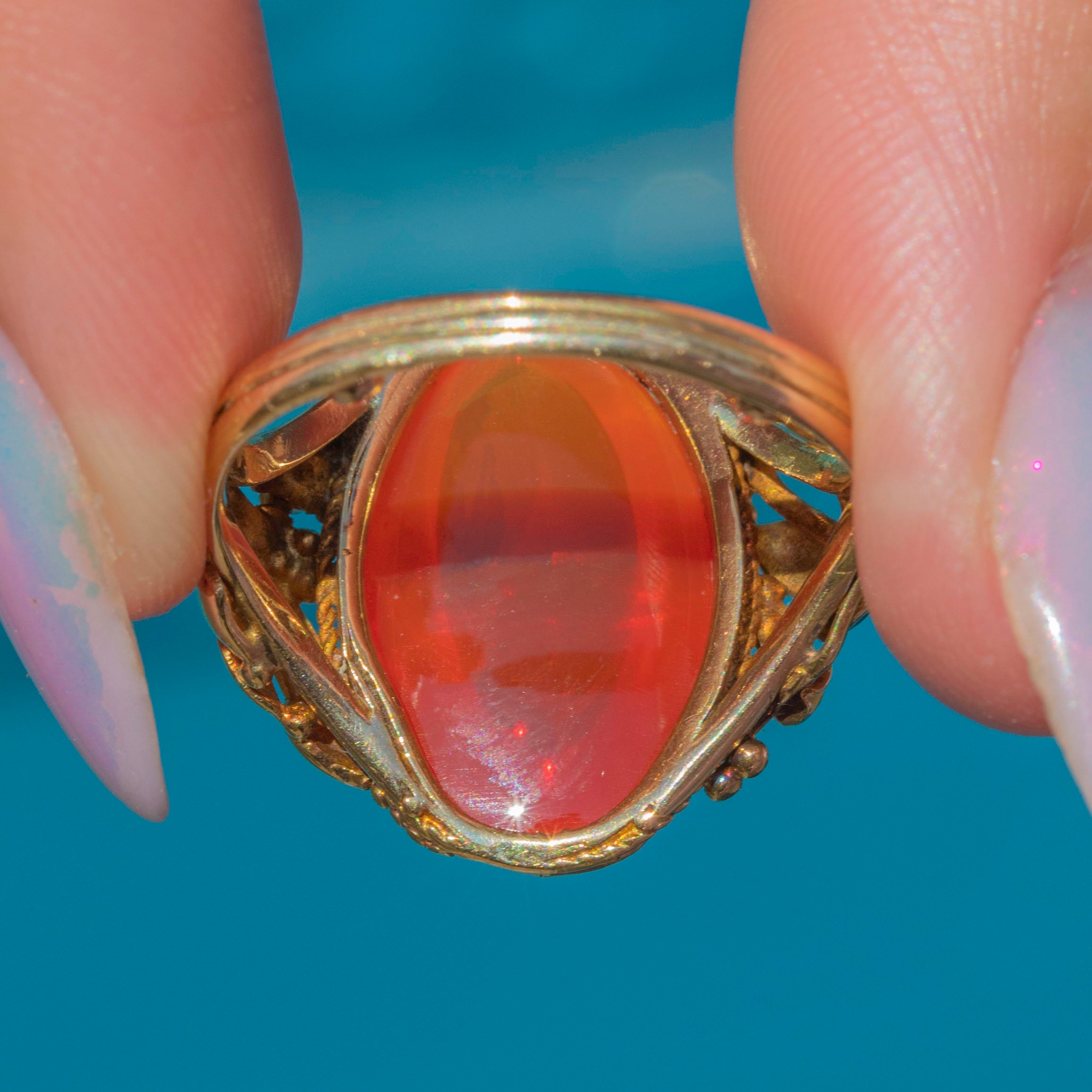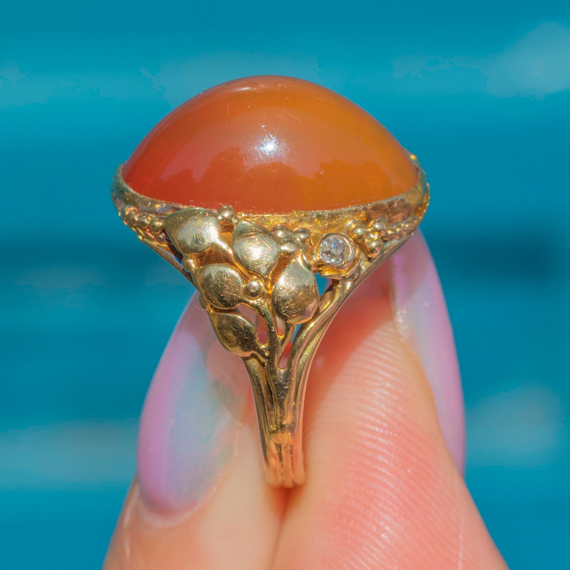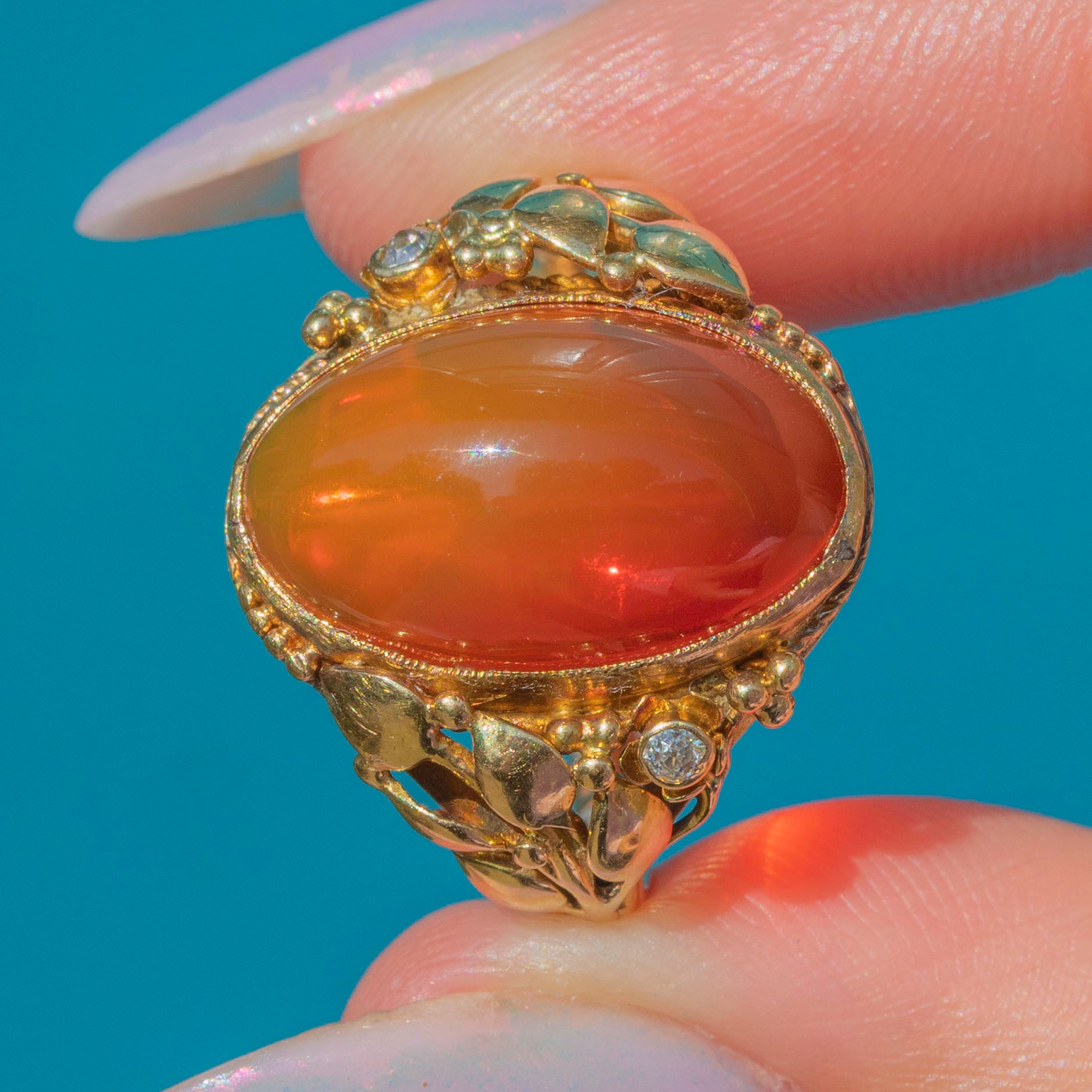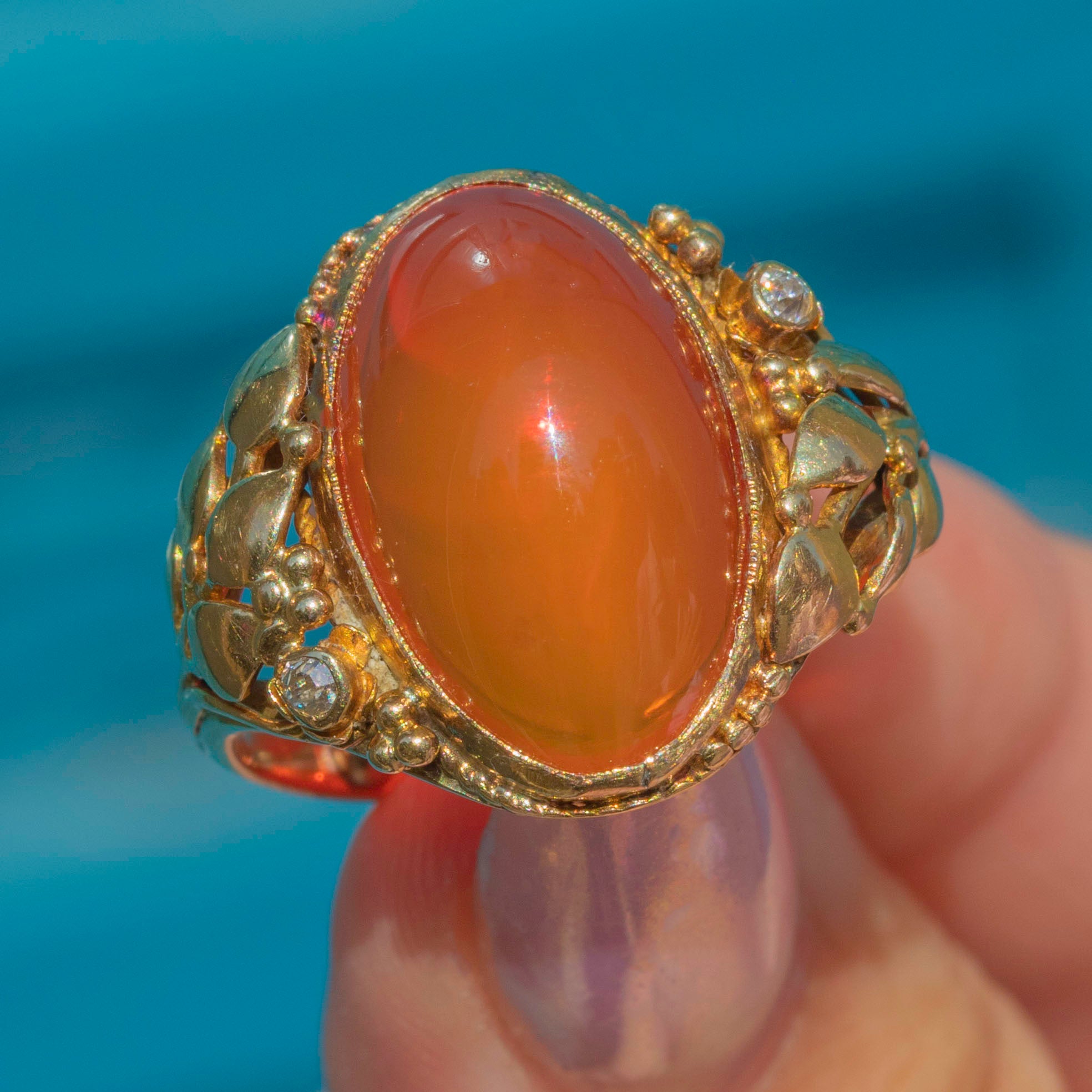 A resplendent Art Nouveau ring boasting a plump 5.60ct fire Opal, flanked by ornately detailed buttery 18ct Gold shoulders.