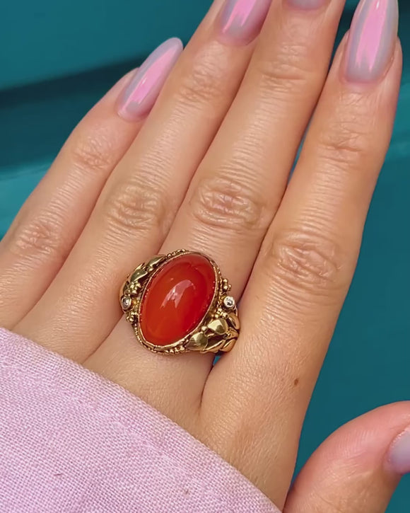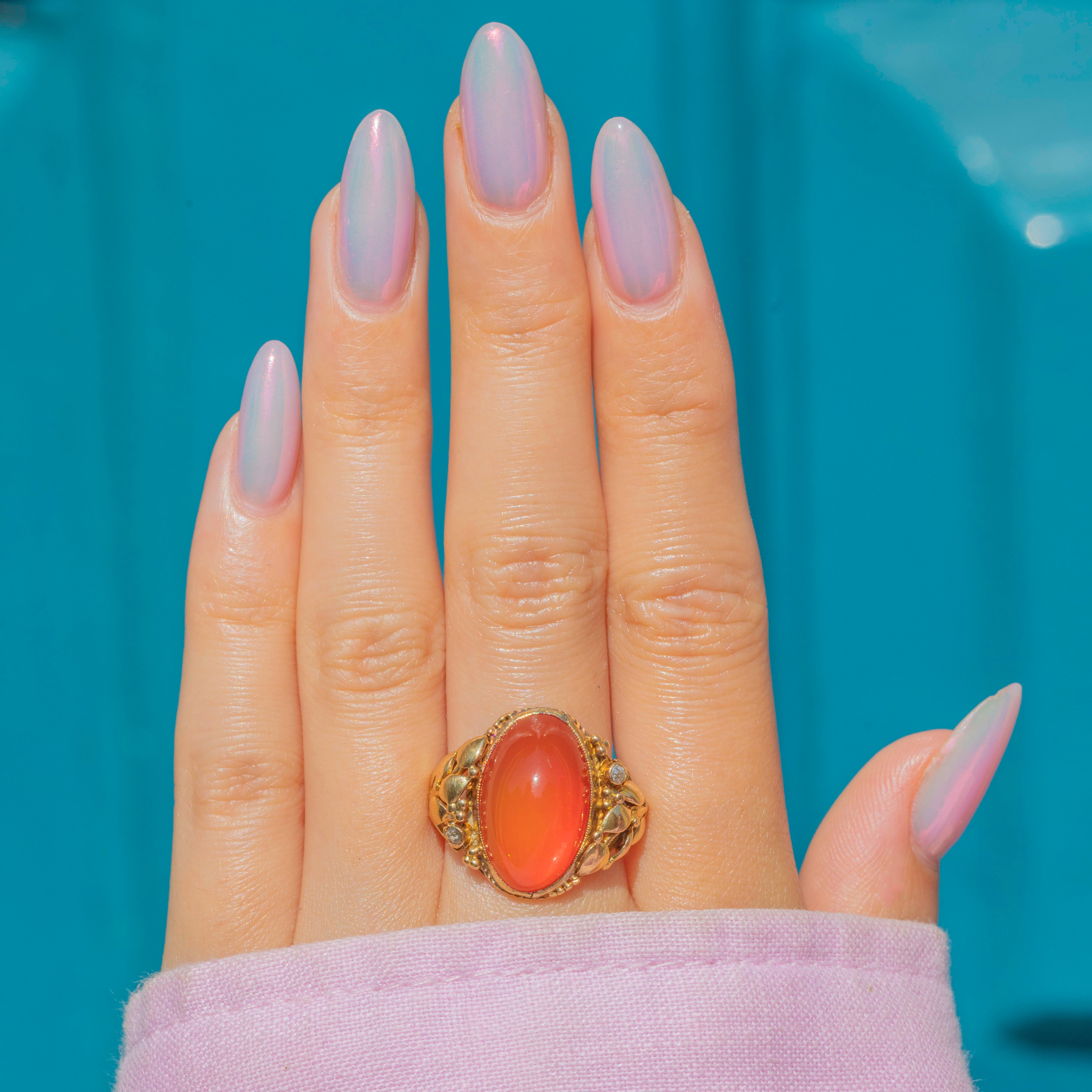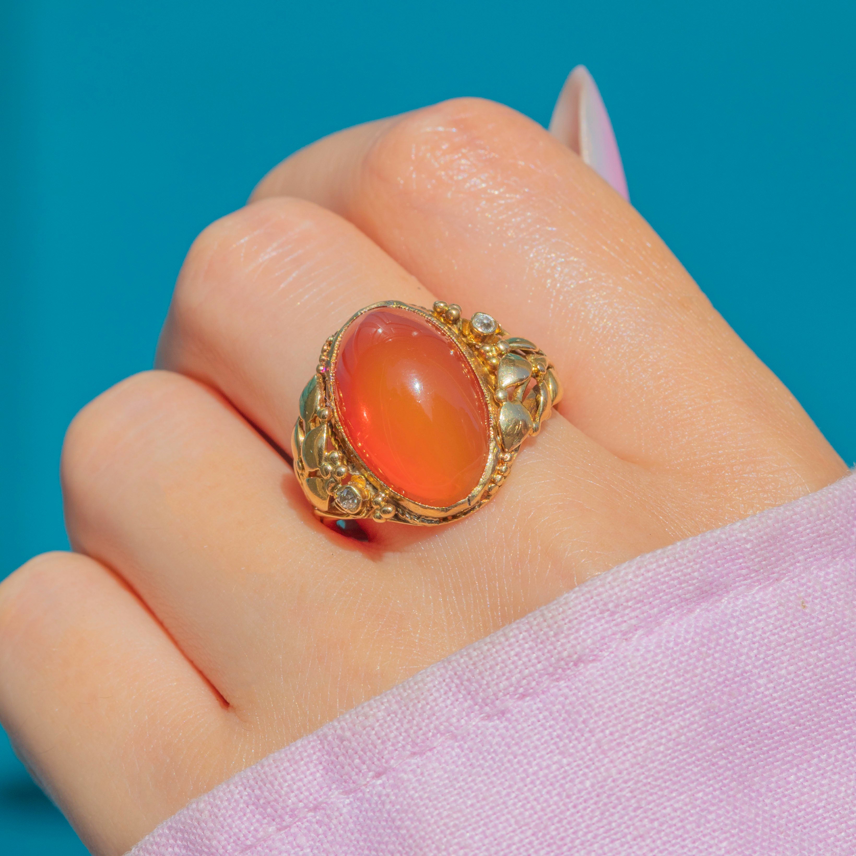Providing ample finger coverage, this saturated Fire Opal cabochon projects a vibrant papaya orange hue and is accented on either side by two twinkling Diamonds in quintessential Art Nouveau glamour. The sumptuous, glossy 18ct Gold completes this ring with undeniable luxury and comfort, making it a fabulous stand-alone piece.