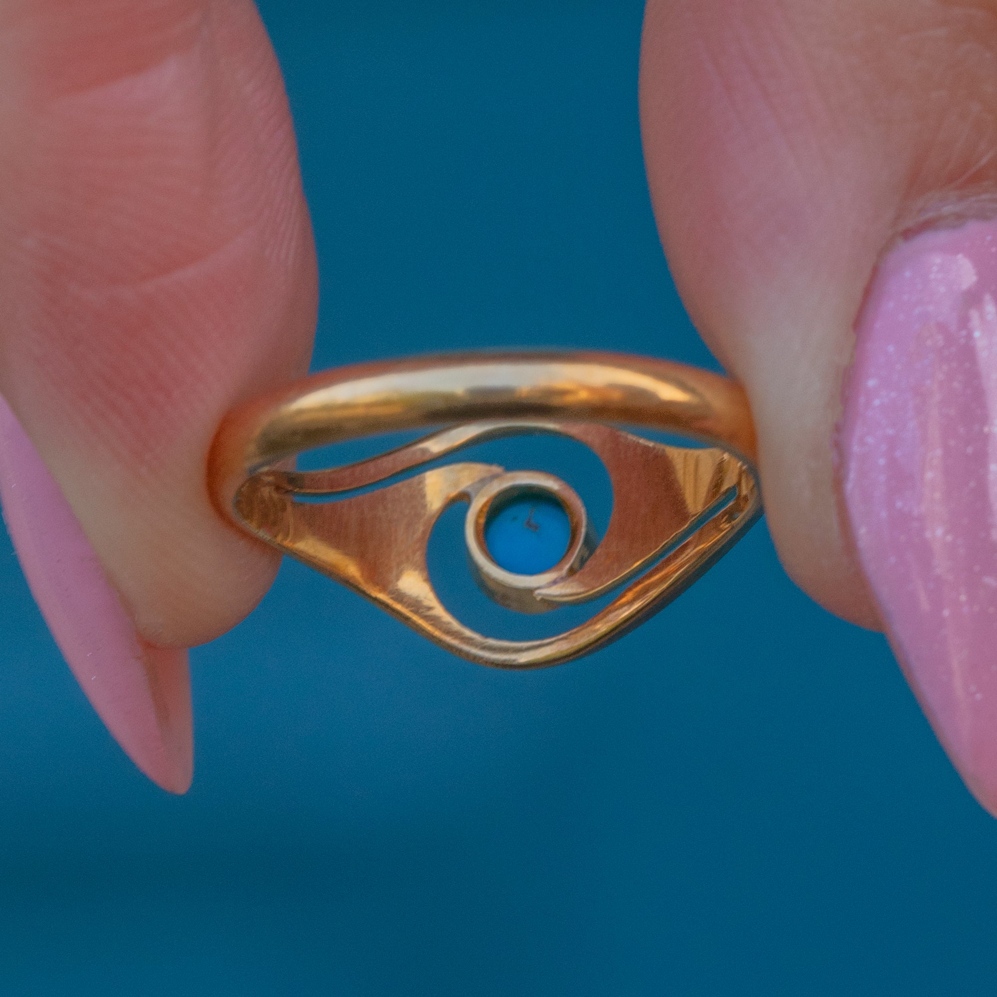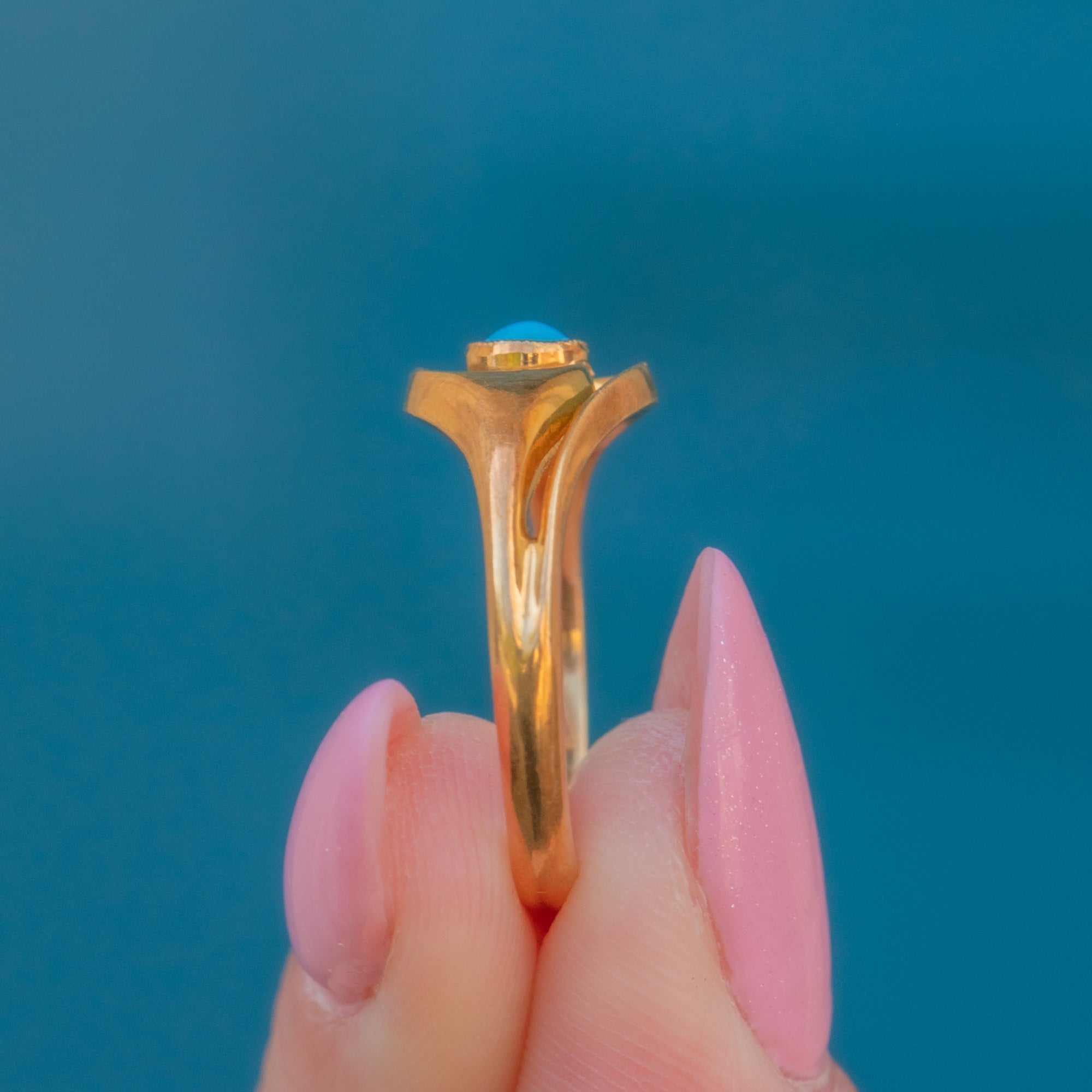 The Turquoise cabochon takes centre stage, its vibrant sky-blue hue perfectly complemented by the richly saturated Gold. The symmetrical twist design is endlessly pleasing to look at and provides wonderful finger coverage.