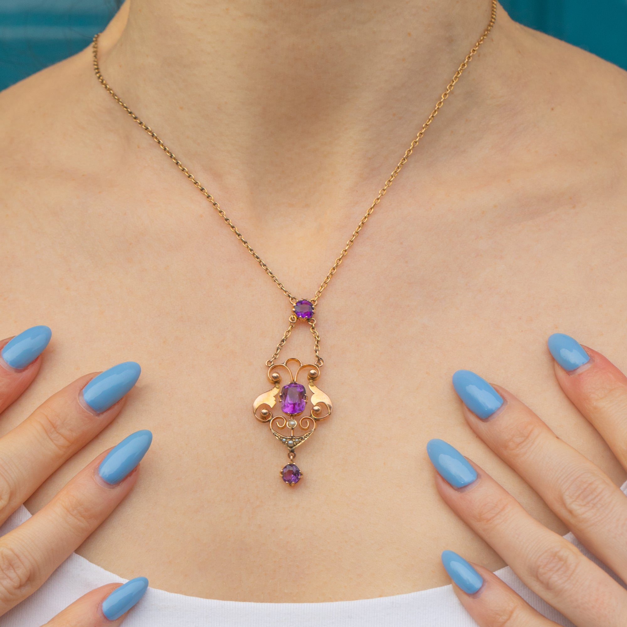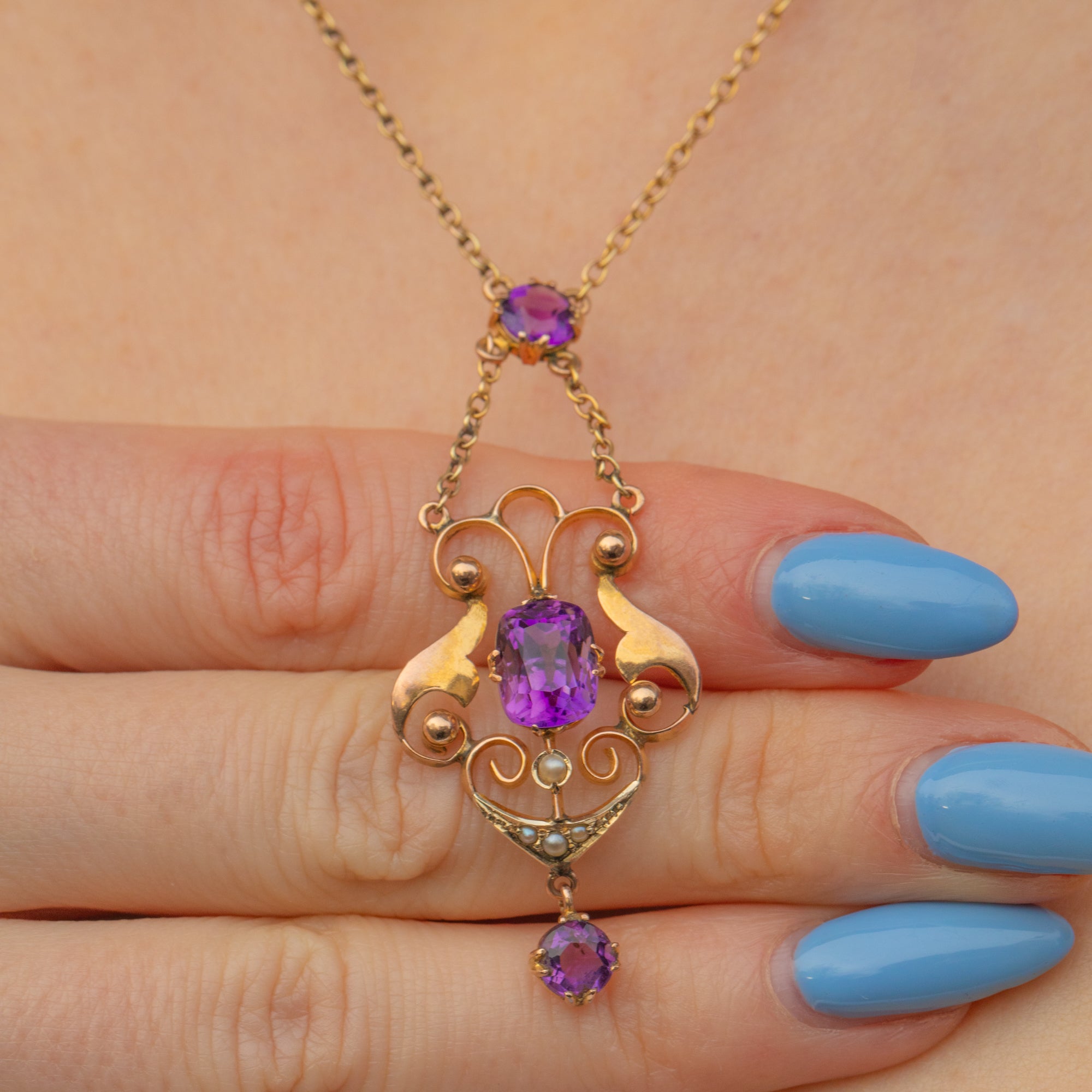 Crafted from warm 9ct Gold, this necklace suspends a curvaceous drop with three vibrant Amethysts, each radiating gorgeous deep lavender hues. She is adorned by delicate graduating seed Pearls, with their iridescence marrying the warmth their settings and chain.