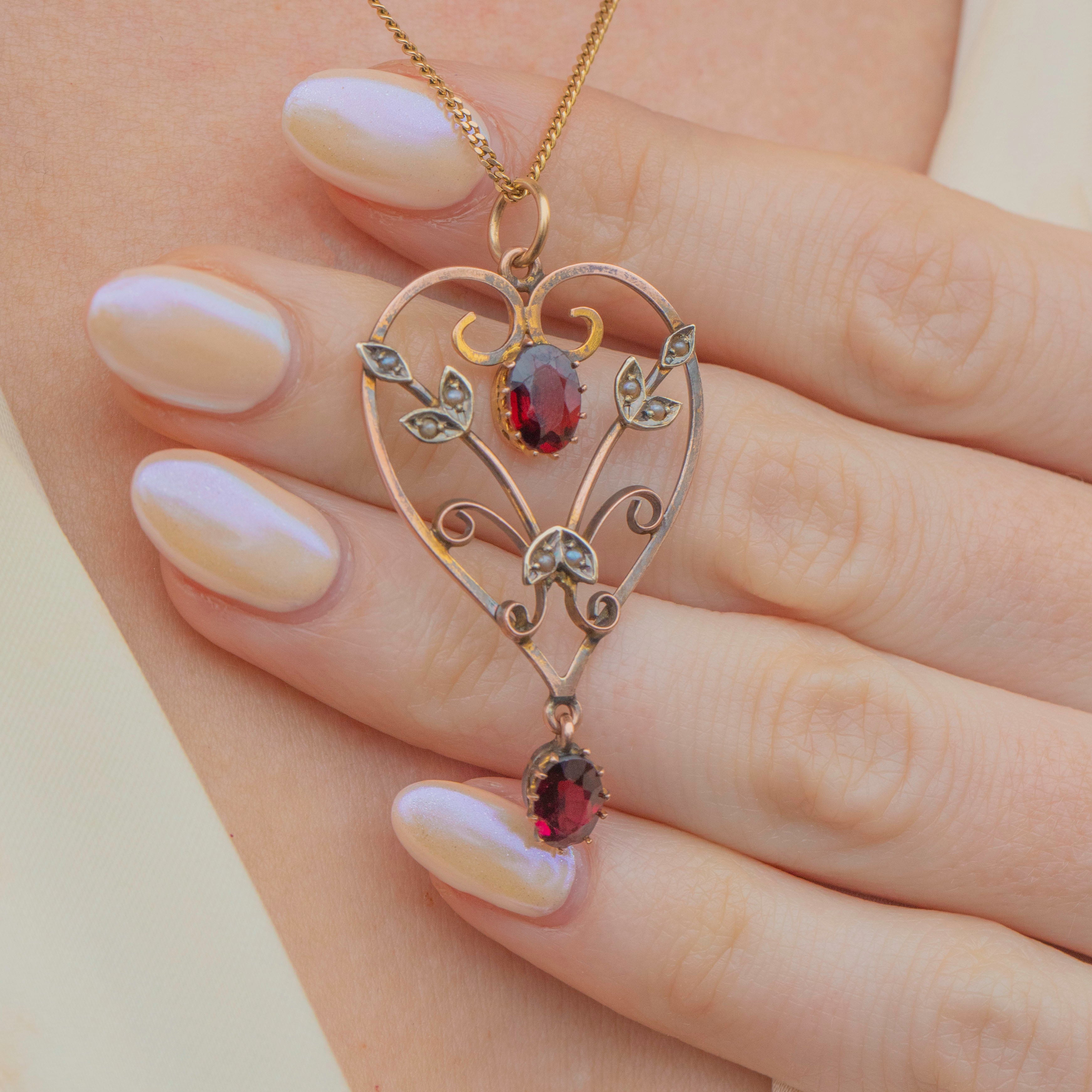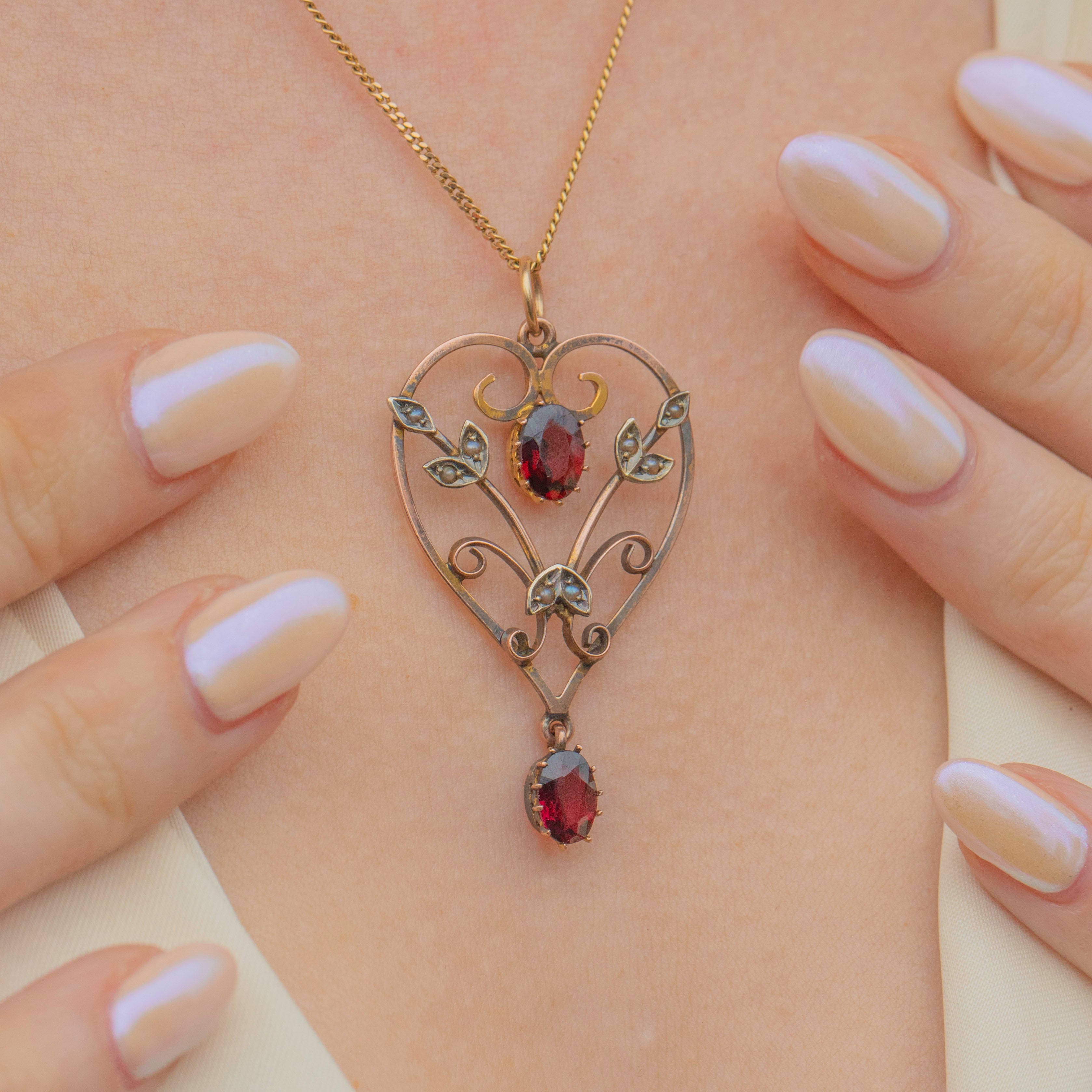 Art Nouveau 9ct Gold Garnet Pearl Heart Drop Pendant, 1.50ct