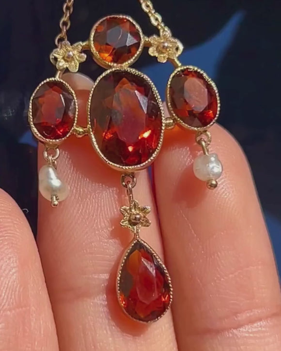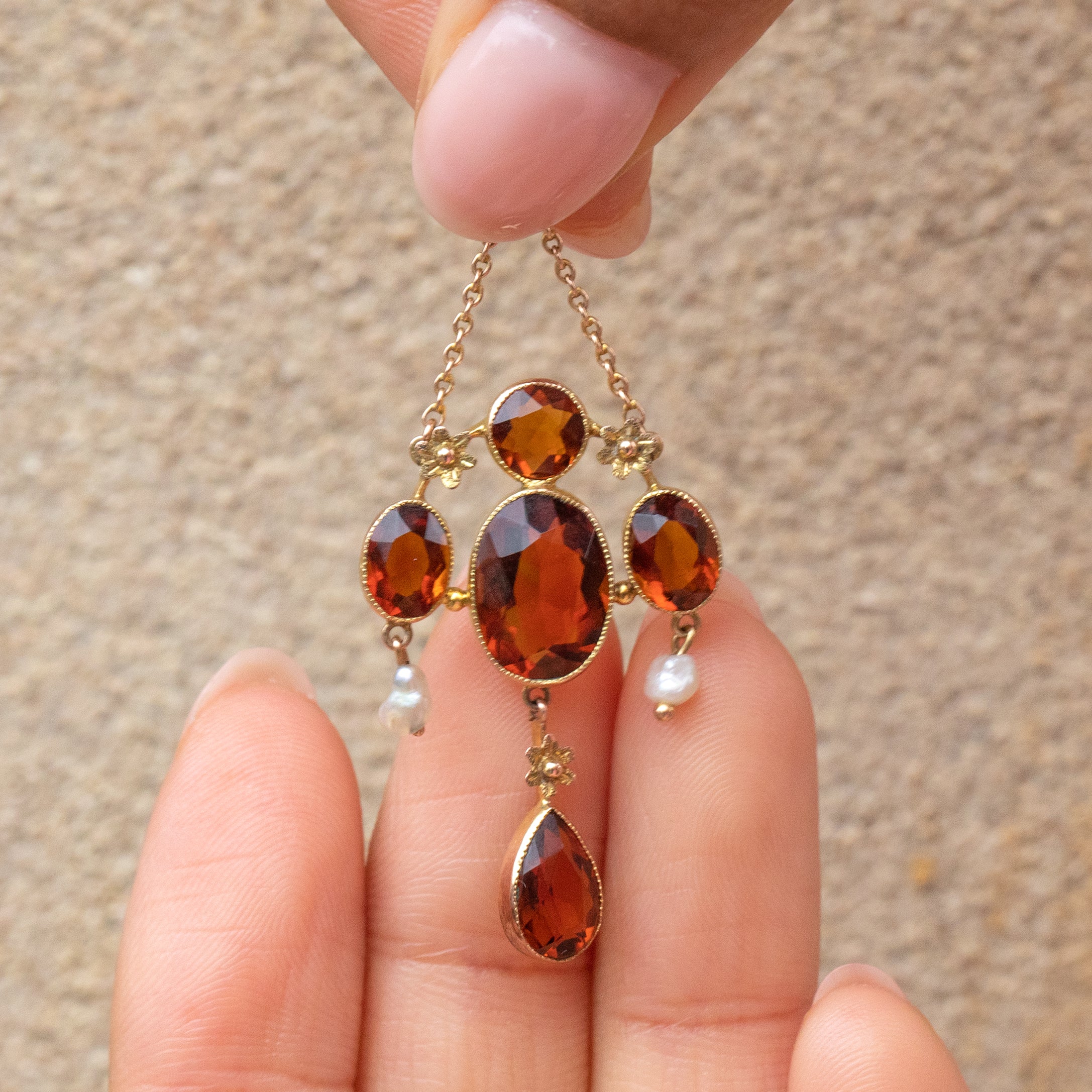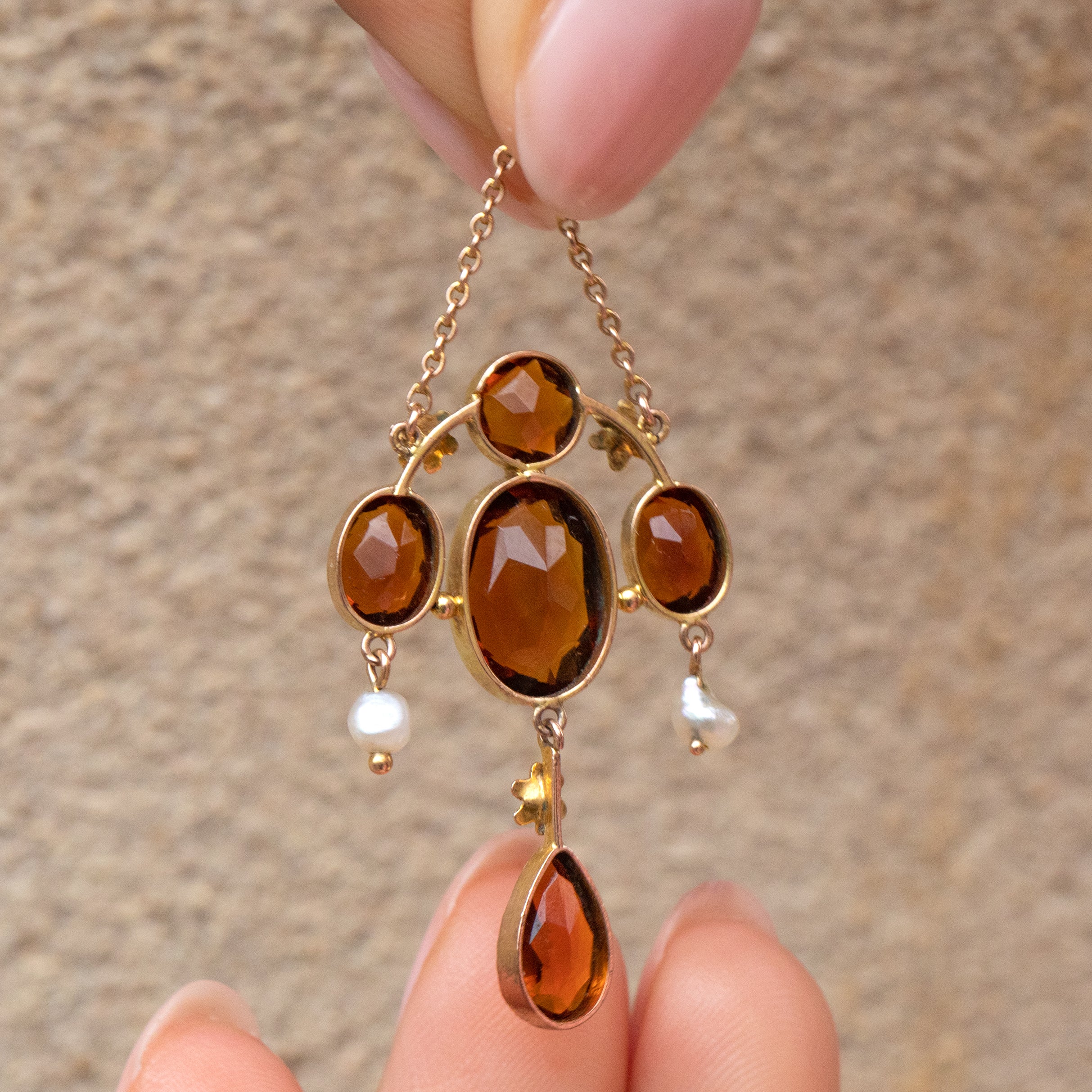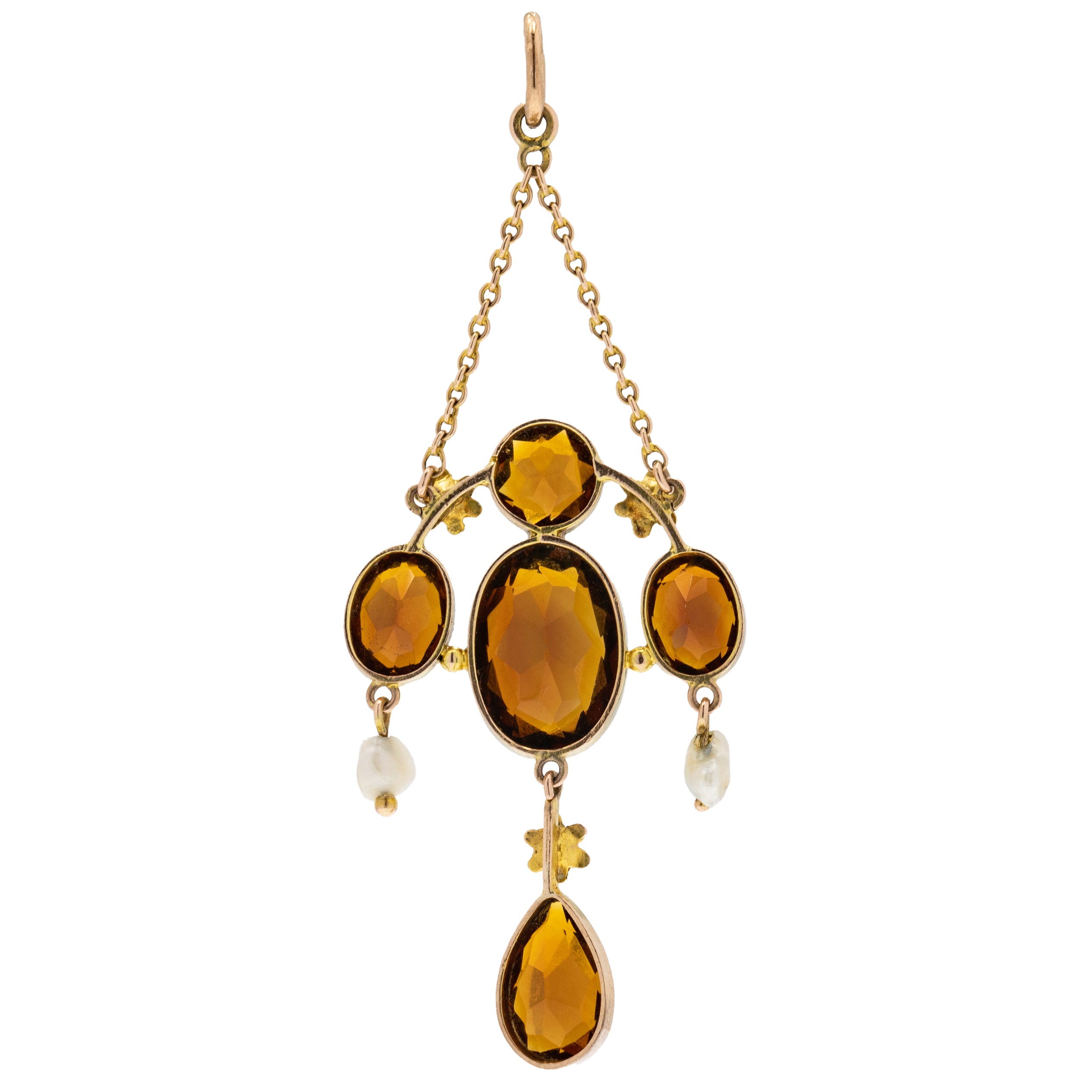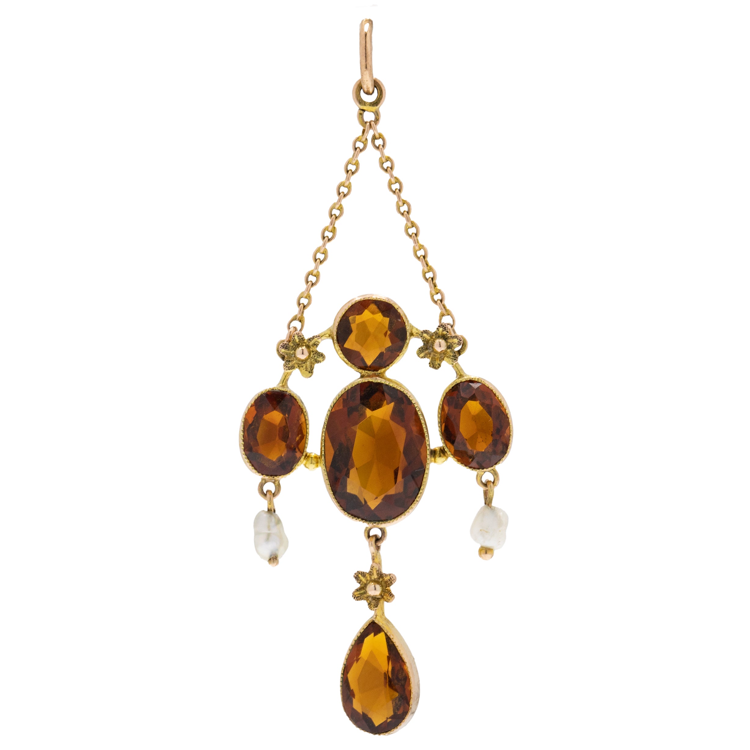 Behold the exquisite craftsmanship of this 2.57ct Art Nouveau 9ct Gold Madeira Citrine drop pendant! With joyful Citrines whose facets allow light to bounce and radiate a sunny glow, and creamy Pearls set into 15ct Gold providing the perfect throne, this treasure is the embodiment of natural beauty.