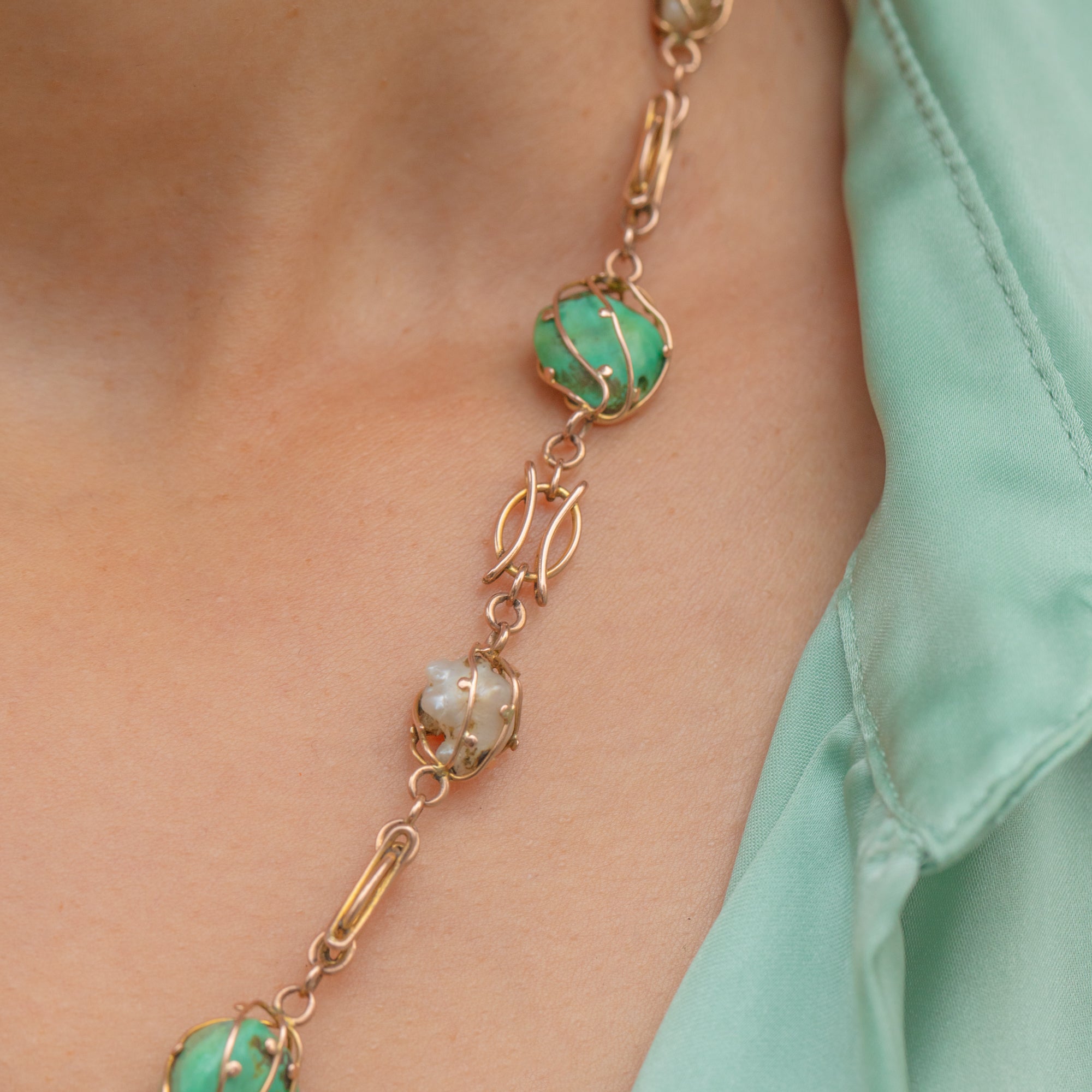 This Art Nouveau 9ct Gold necklace showcases a graceful arrangement of Matrix Turquoise and Baroque Pearls, beautifully graduating in size along the 16" chain.