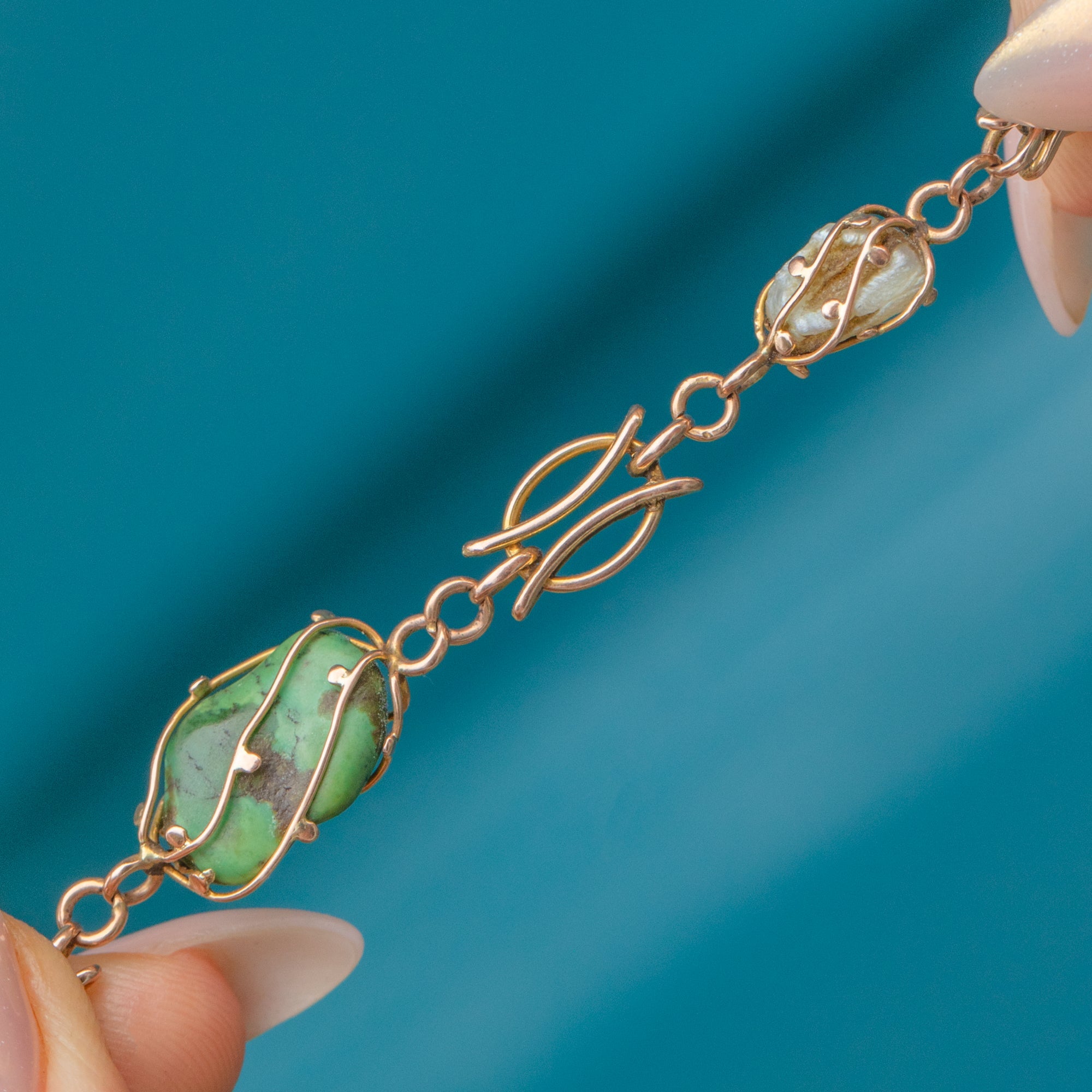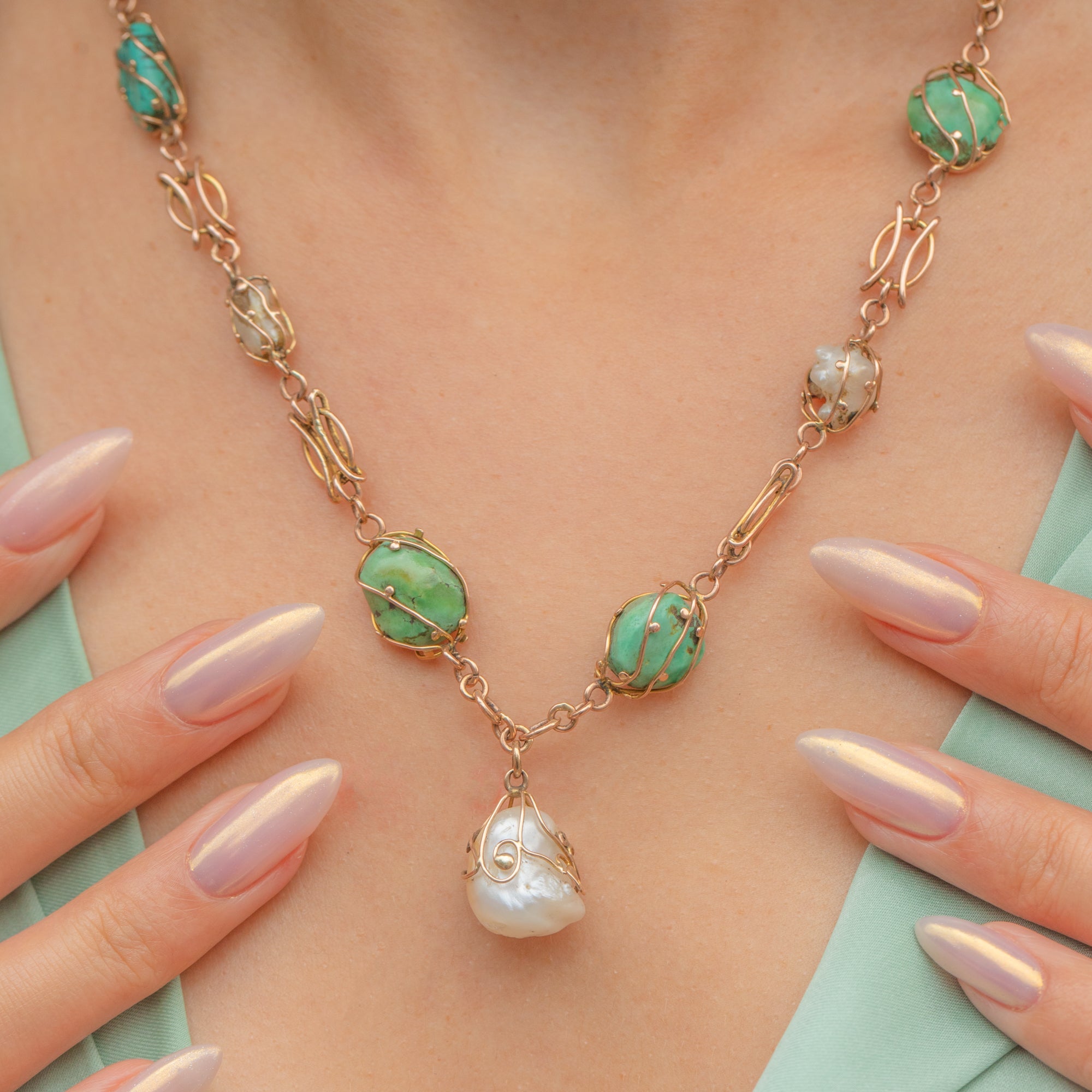 The intricate Gold settings highlight the organic curves of the Turquoise and Pearls, reflecting the flowing, nature-inspired aesthetic of the Art Nouveau era.