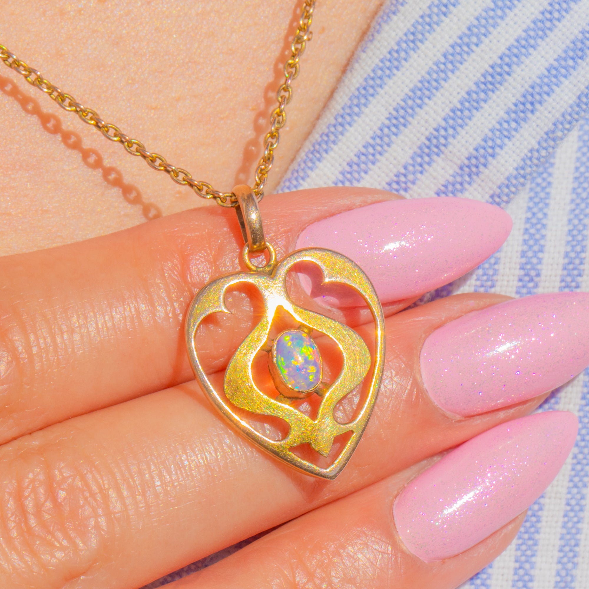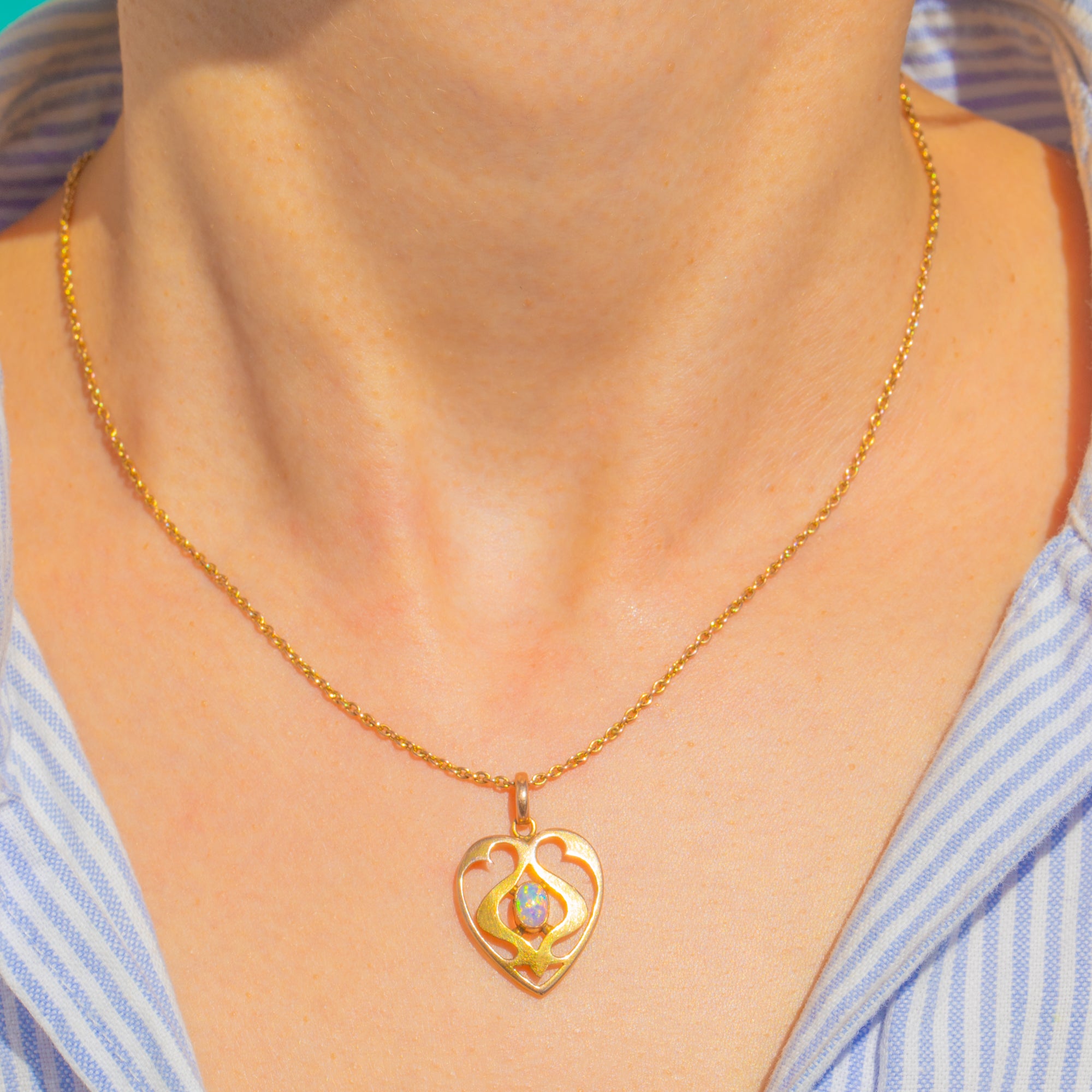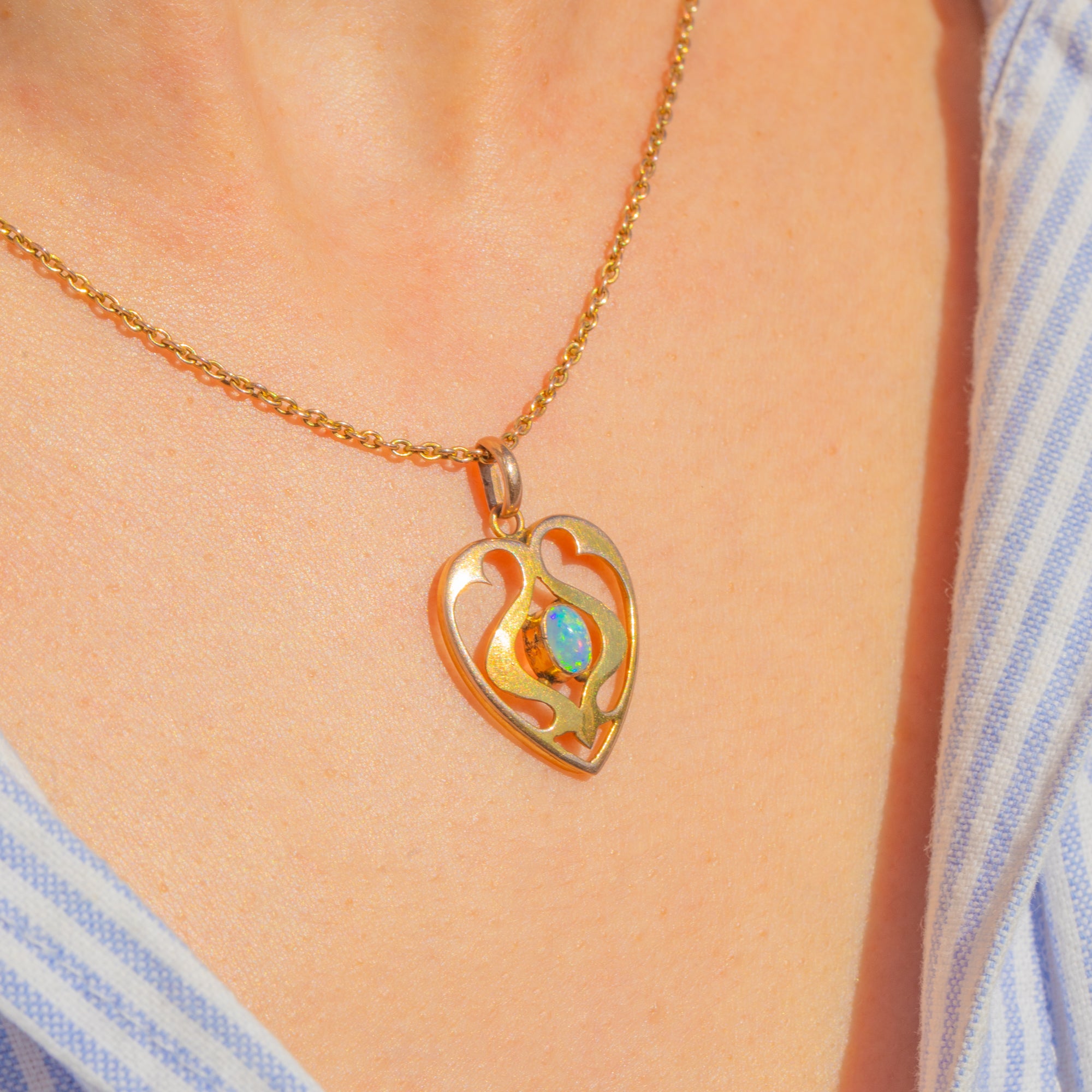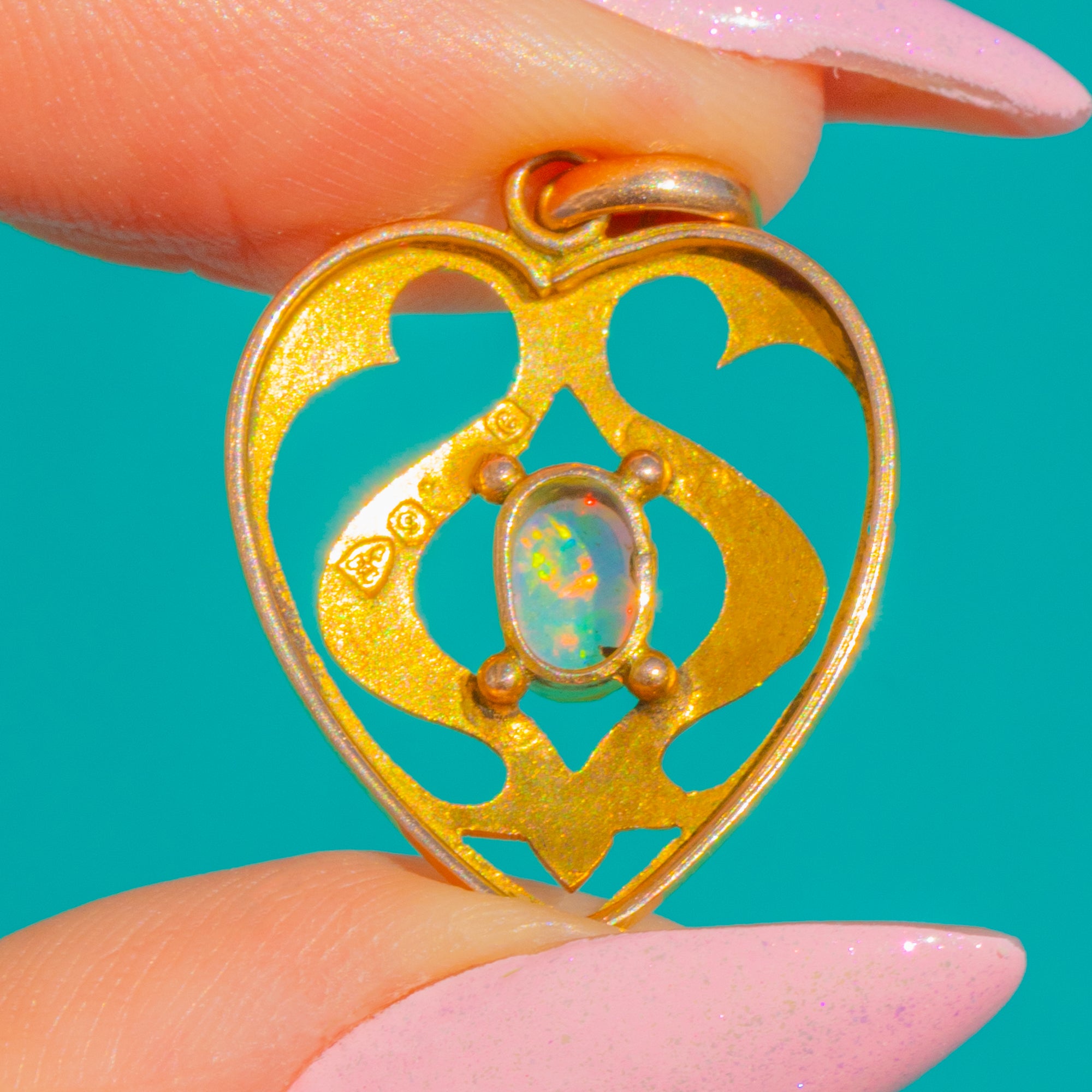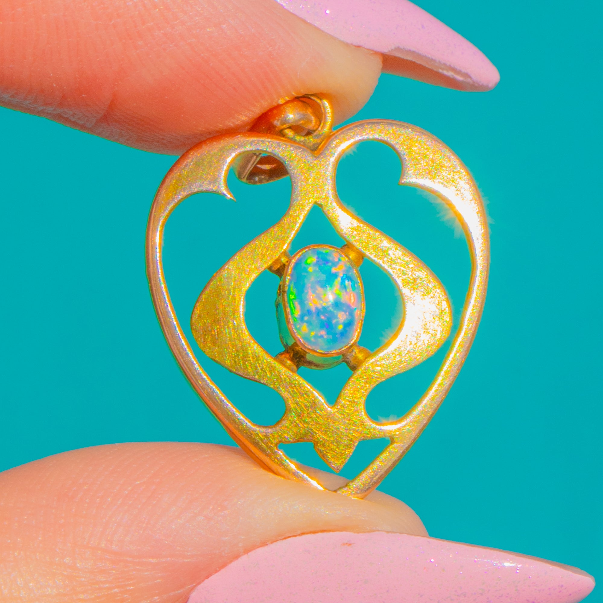 A romantic Art Nouveau openwork heart pendant rendered in 9ct Gold, its flowing foliate lines centring a luminous Opal cabochon. The Opal shimmers with blue and green play-of-colour, enlivened by flashes of pink and orange, and is framed by a raised bezel with delicate bead accents for a beautifully balanced, airy silhouette.
