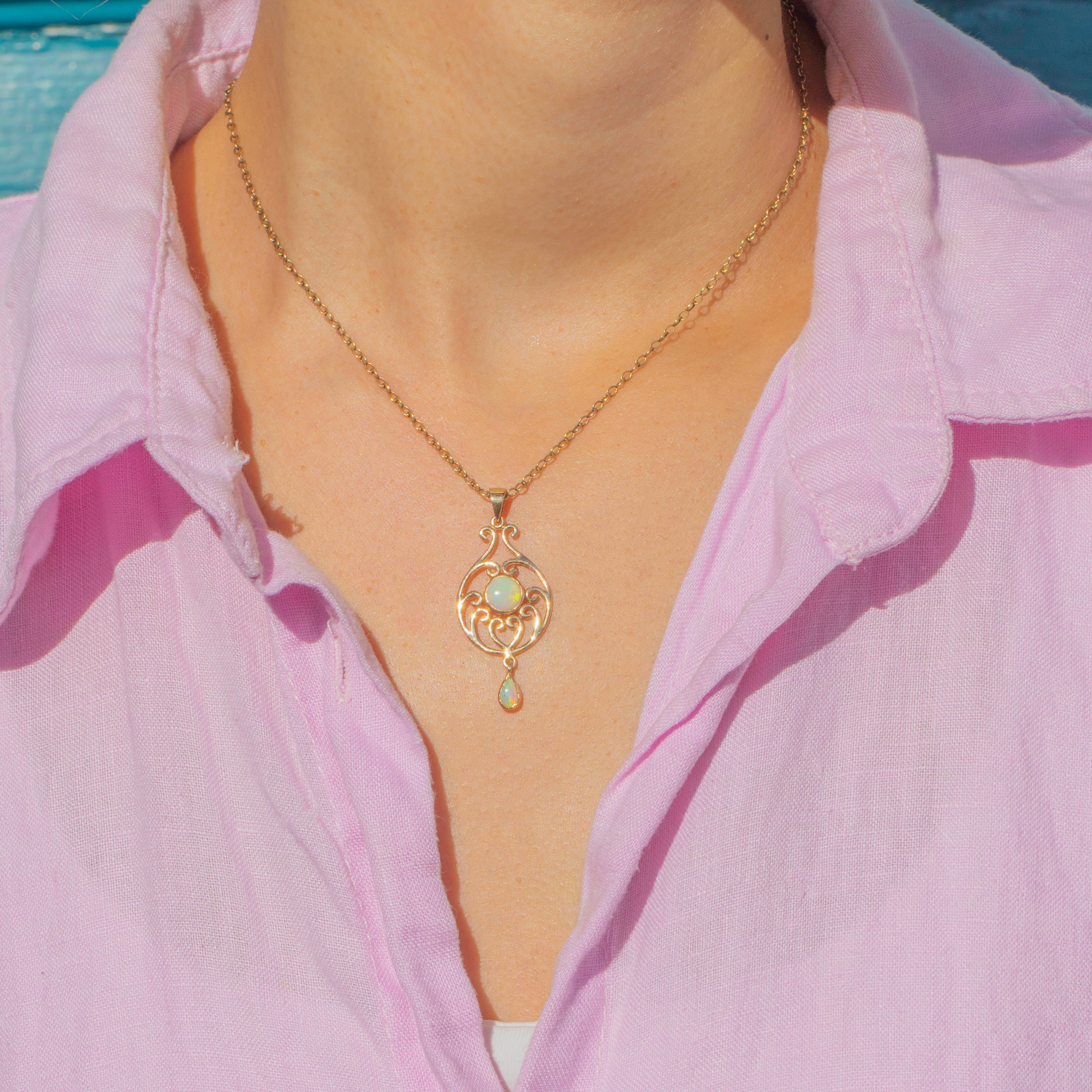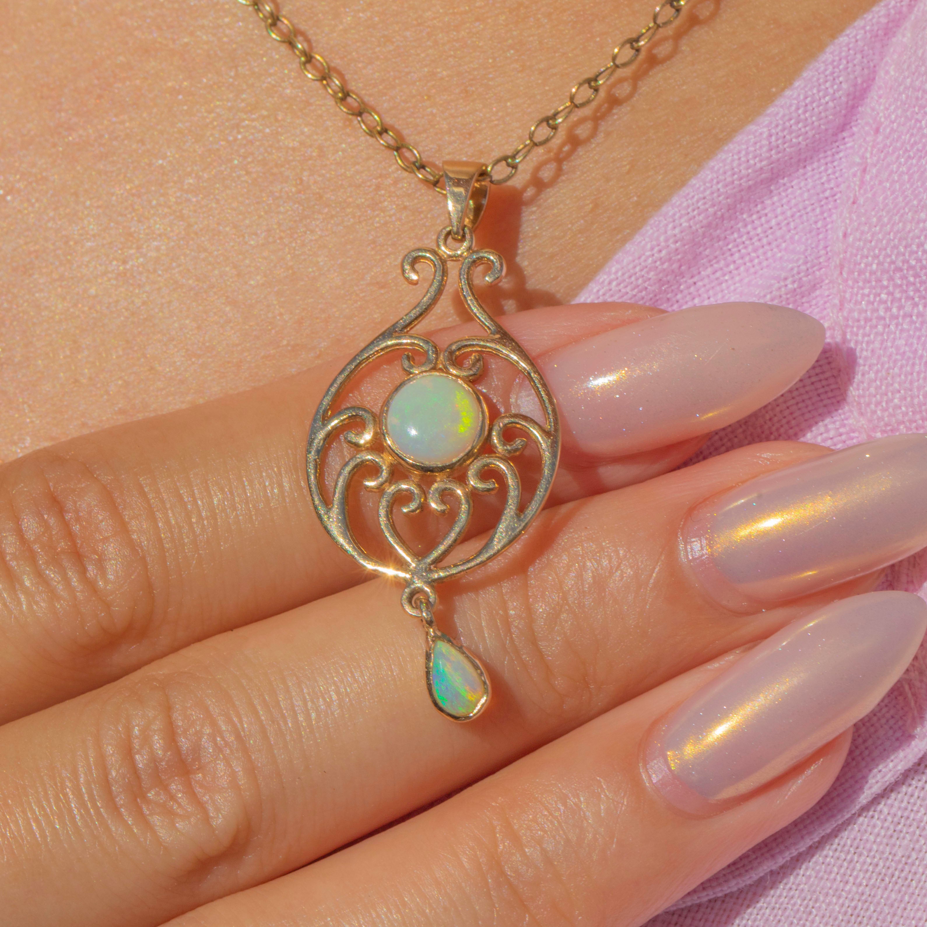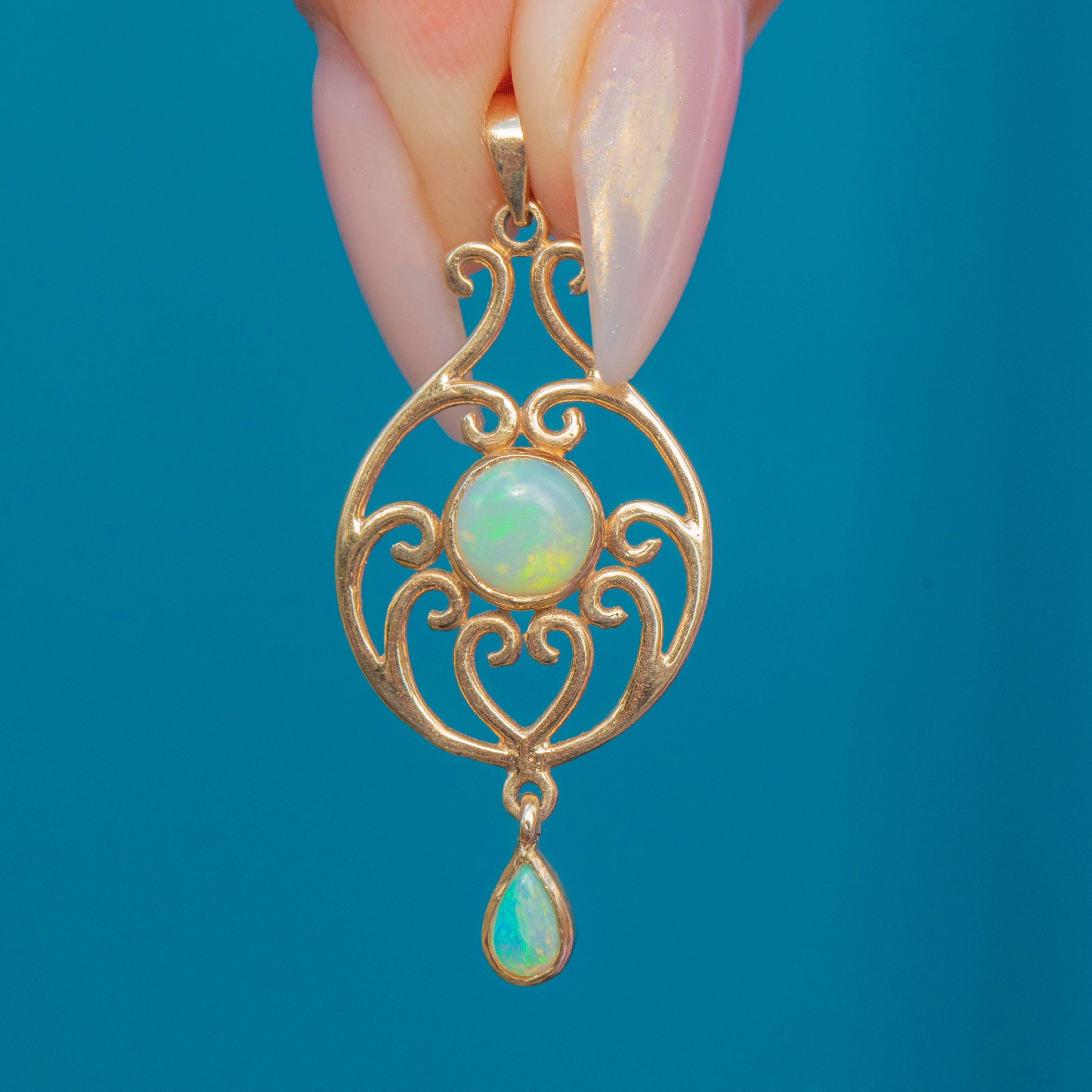 A striking antique Opal pendant crafted in 9ct Yellow Gold, designed in the romantic Art Nouveau style. The openwork frame features graceful swirling motifs inspired by nature, centring on a glowing round Opal with vibrant flashes of neon green, blue and fiery orange. A pear-shaped Opal drop swings elegantly beneath, adding movement and a luminous finishing touch.