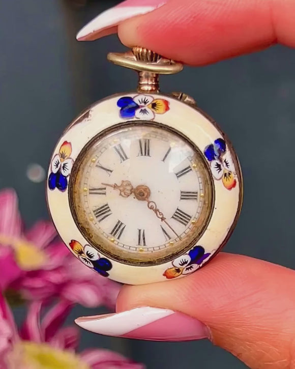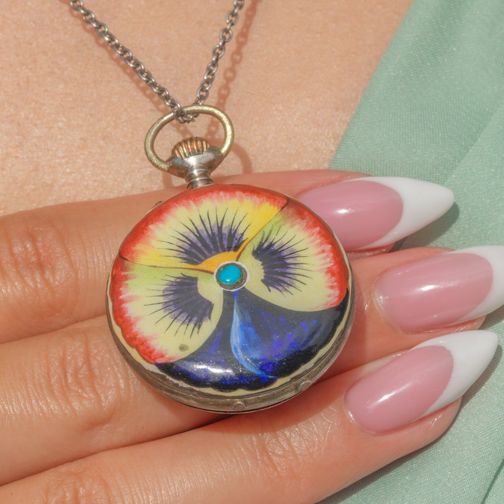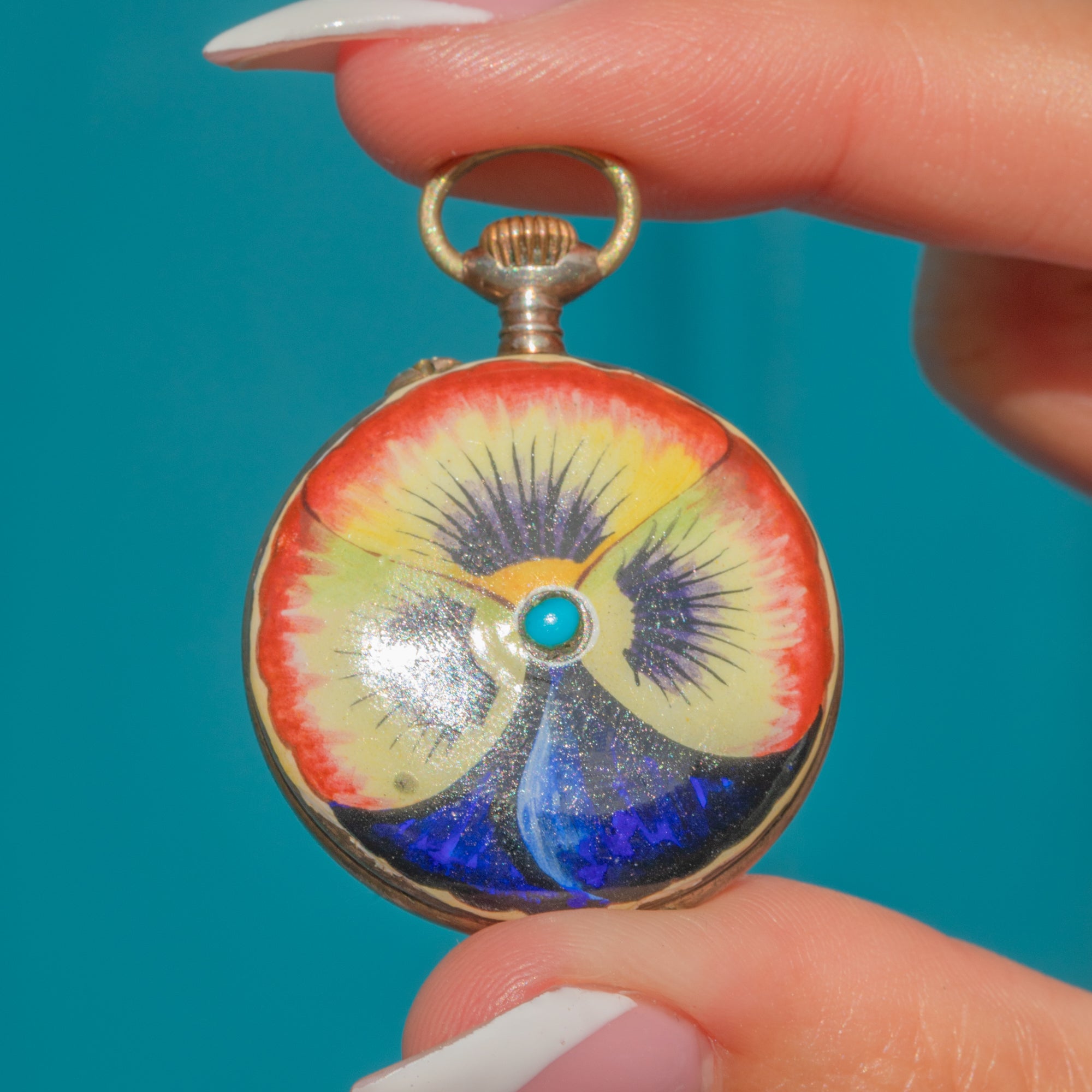 This phenomenal Art Nouveau Enamel pocket watch will set your collection apart from the rest! Perfectly capturing the intricate craftsmanship of the turn of the 19th century, she features a beautiful pansy, accented with a Turquoise stone on one side and a clock-face haloed by smaller pansies on her reverse - she is a floral delight!